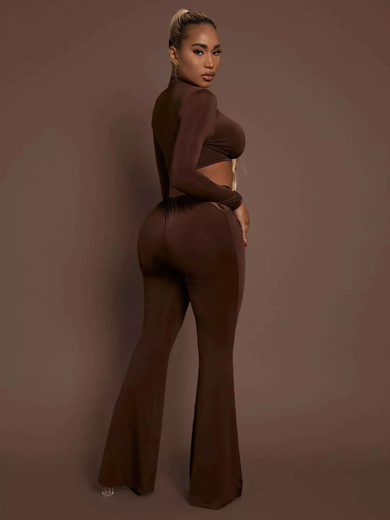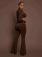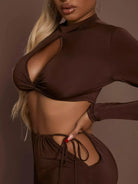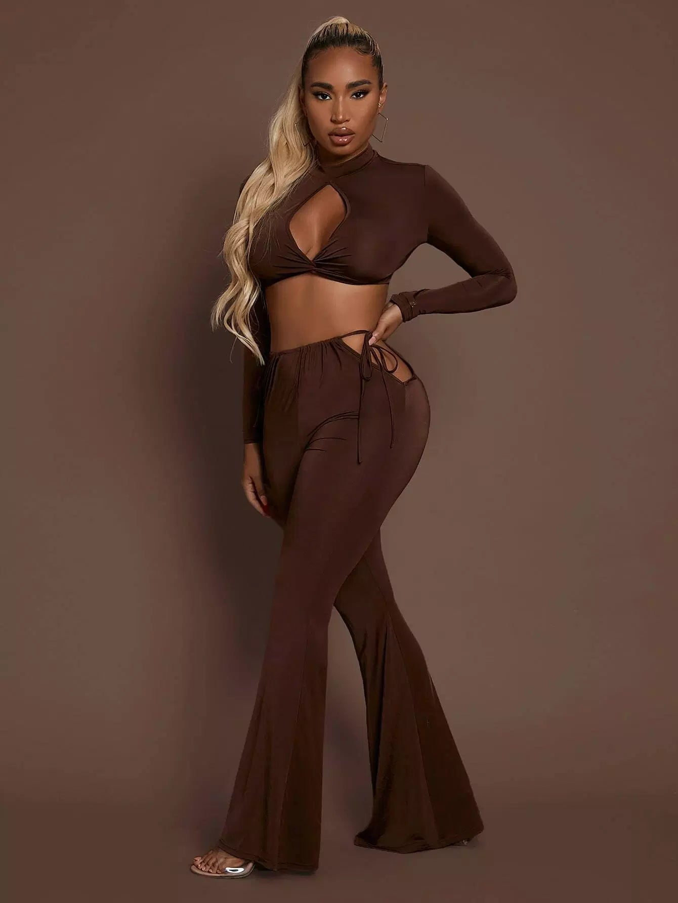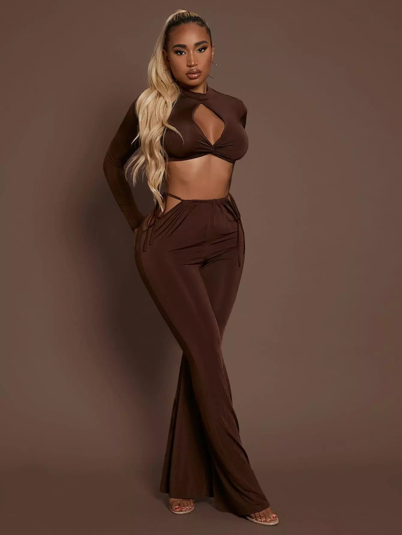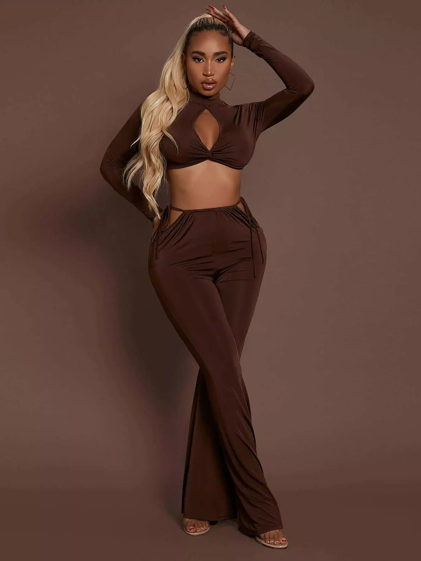 بلوزة قصيرة بقصّة ملتوية من الأمام وبنطلون بفتحة جانبية واسعة بفتحة جانبية