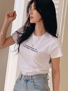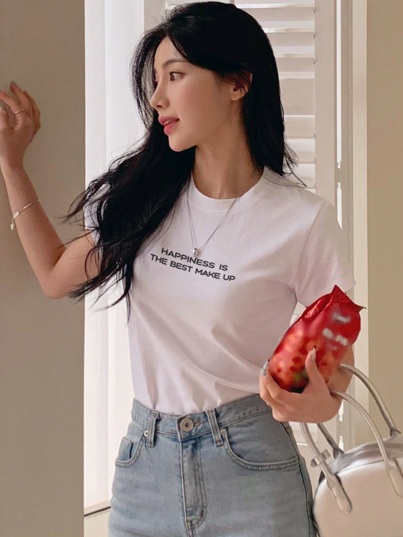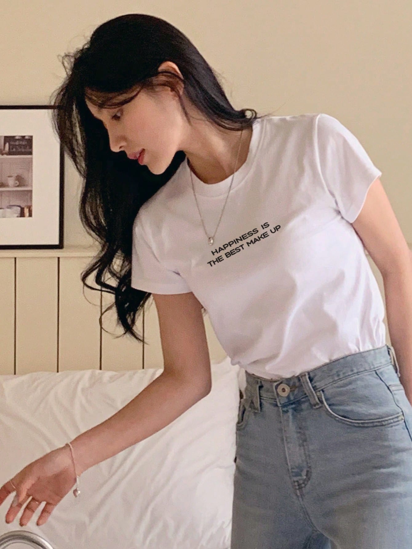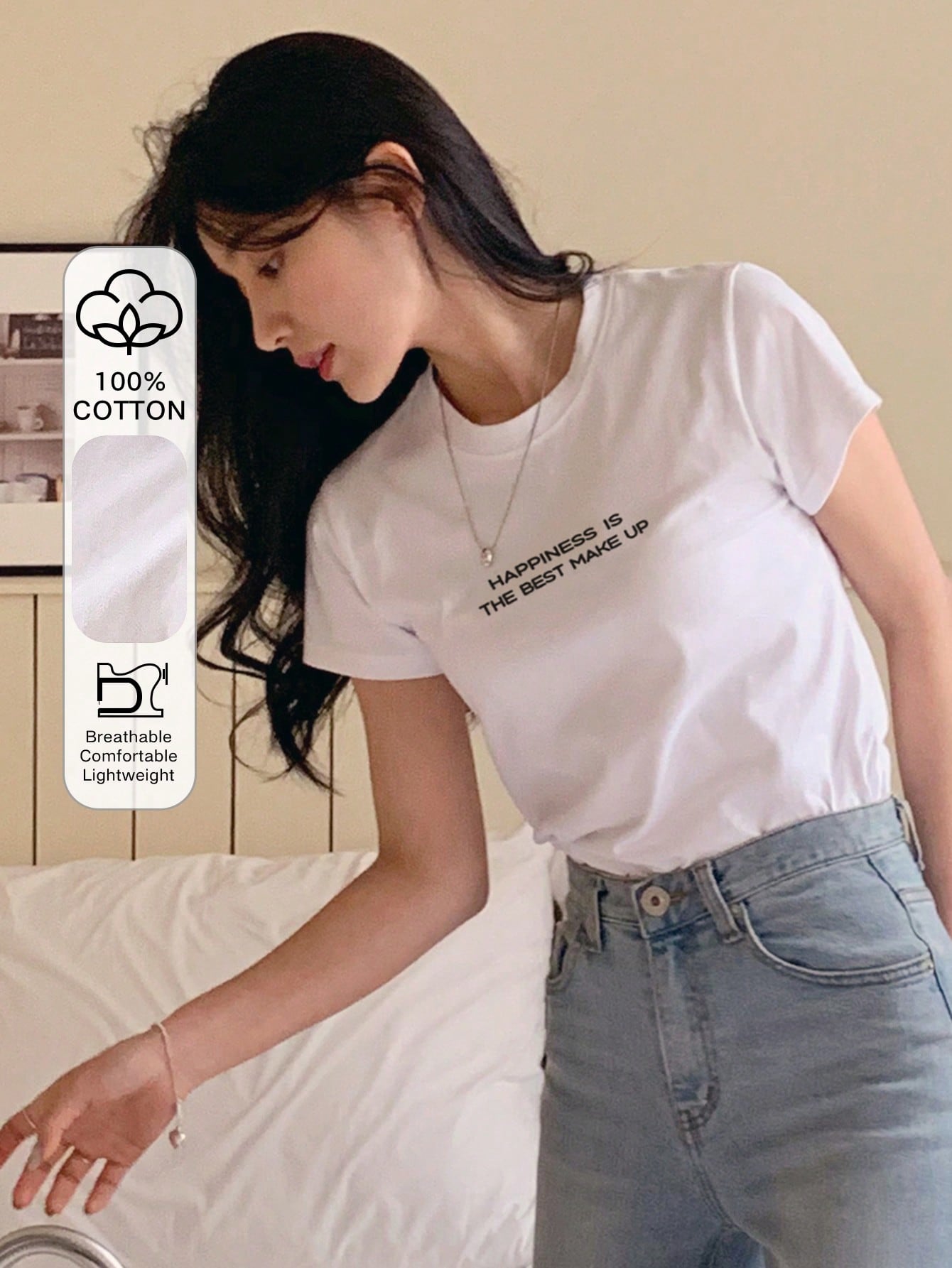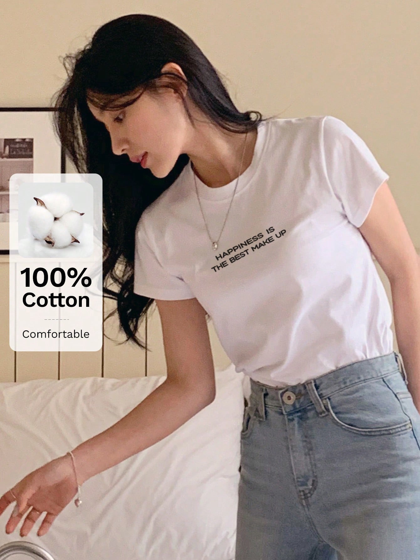 DAZY Women's Round Neck Printed T-Shirt With Slogan HAPPINESS IS THE BEST MAKE UP Summer