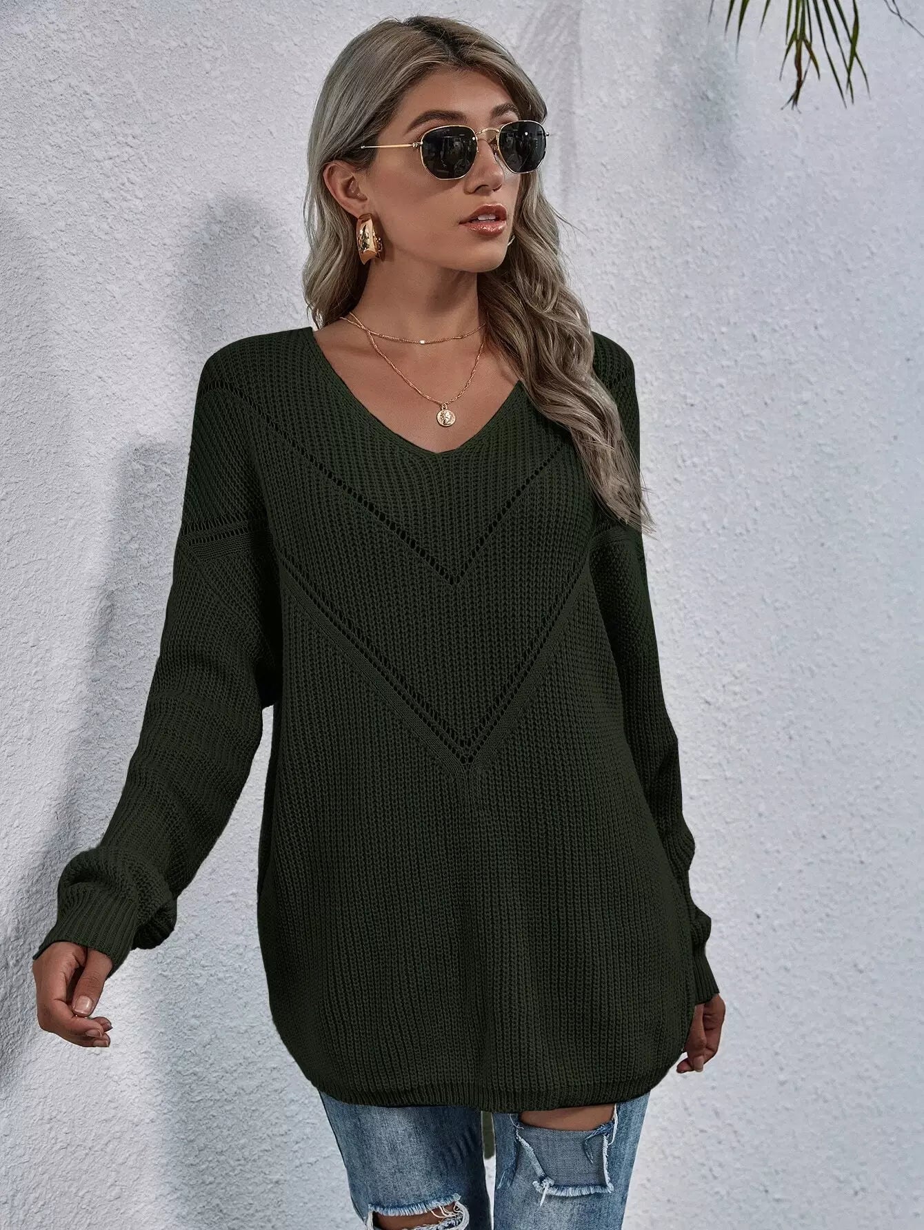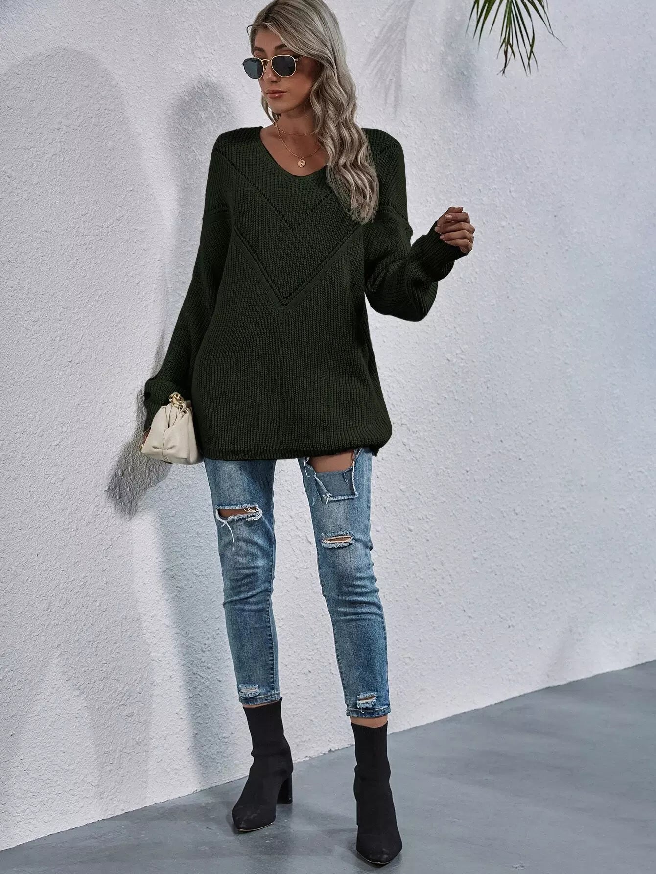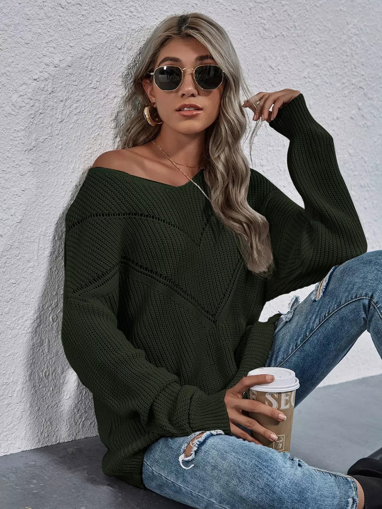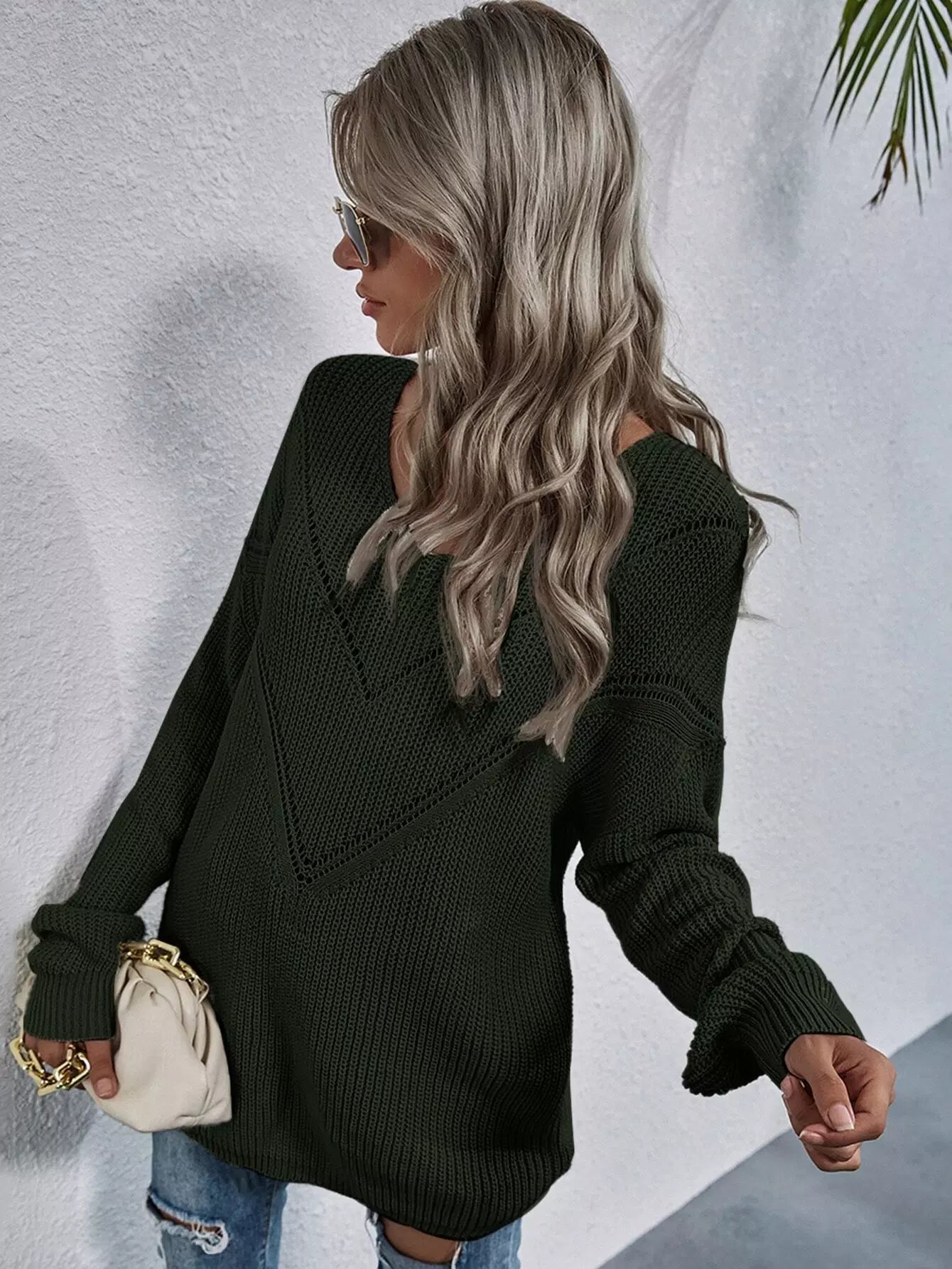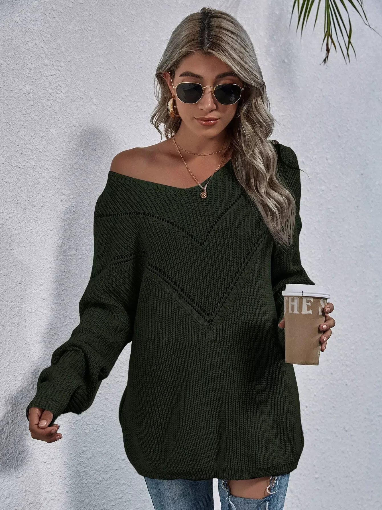 كنزة ذات أكتاف منسدلة مزينة بفتحة على الكتف