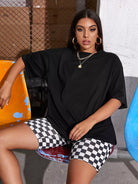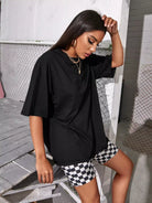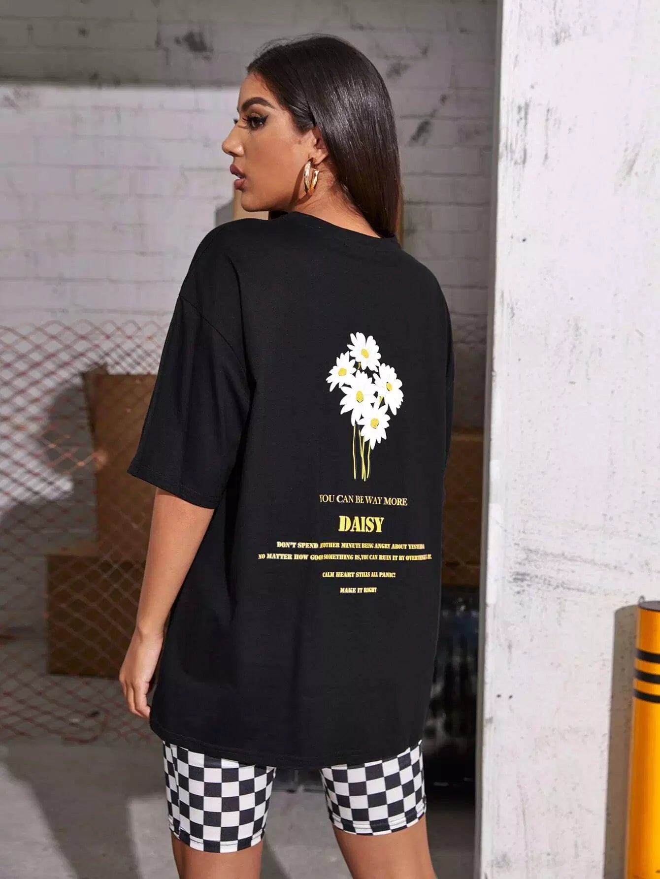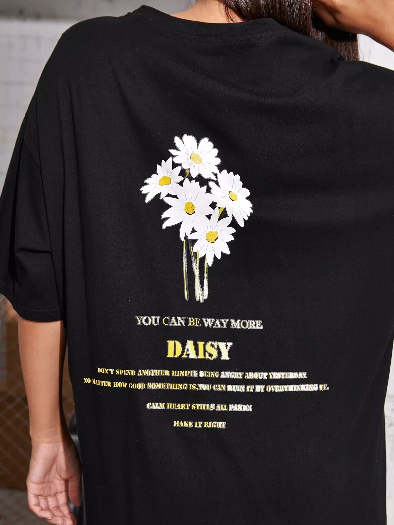 تي شيرت مطبوع عليه شعار وزهور منسدلة على الكتف