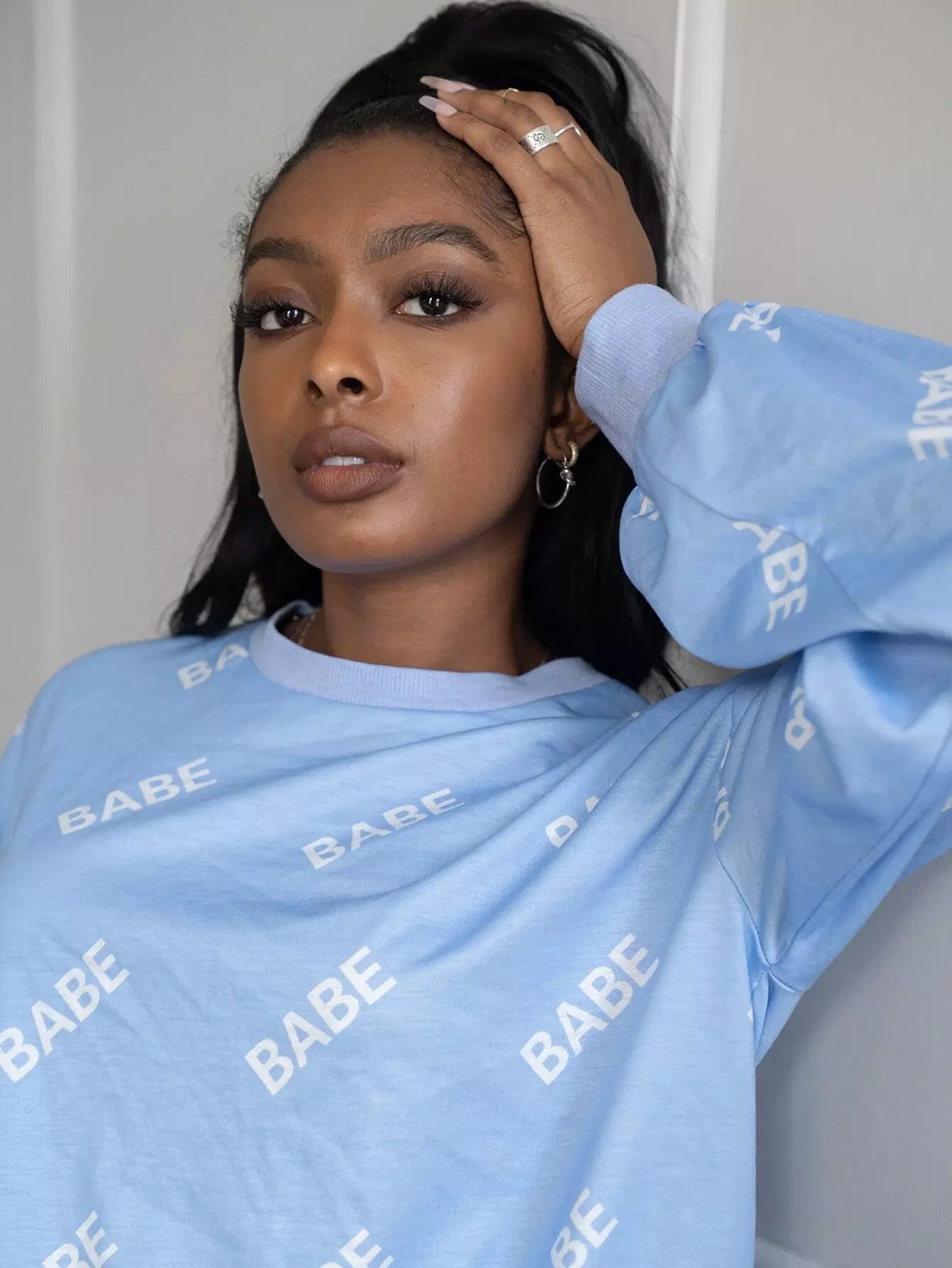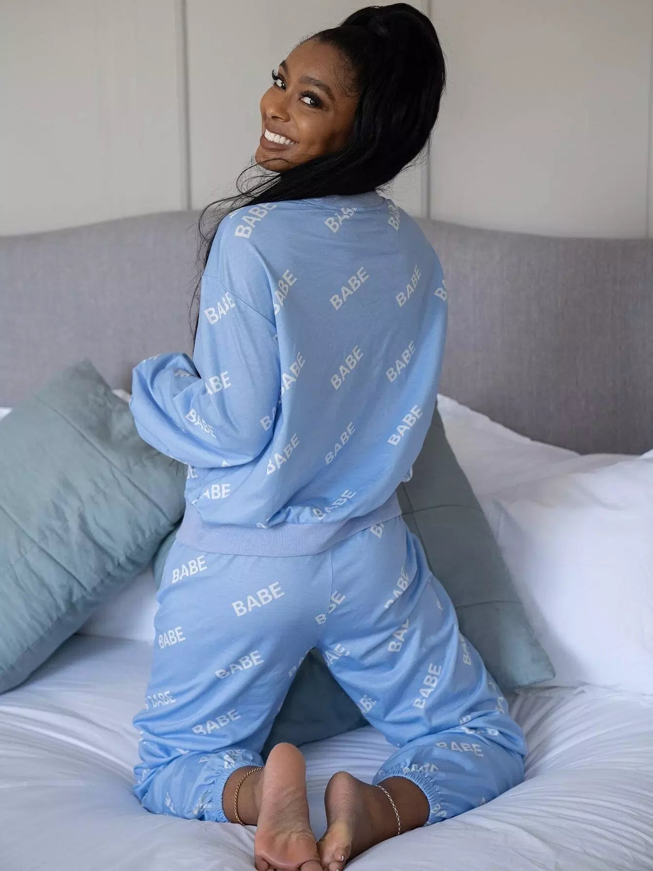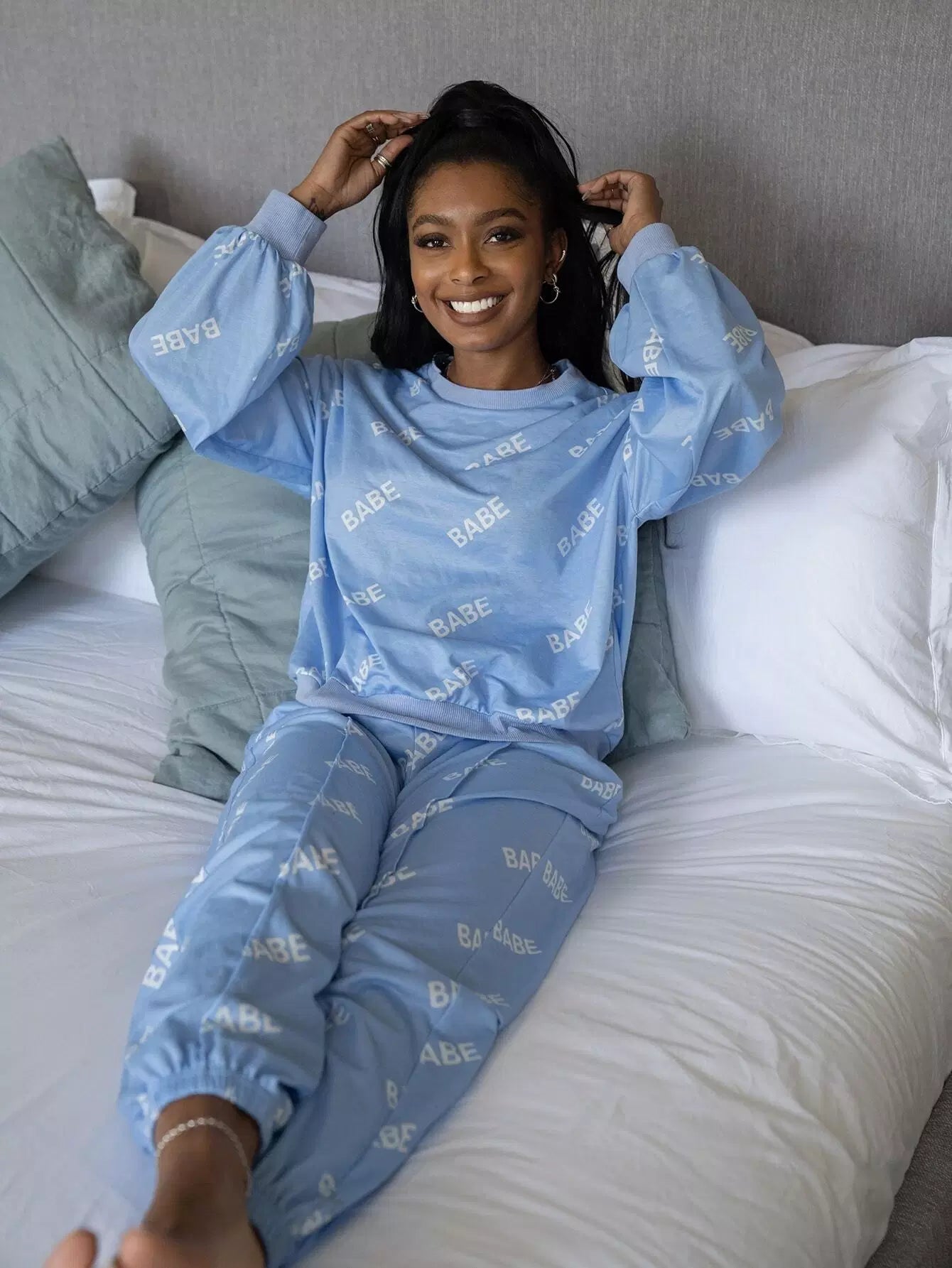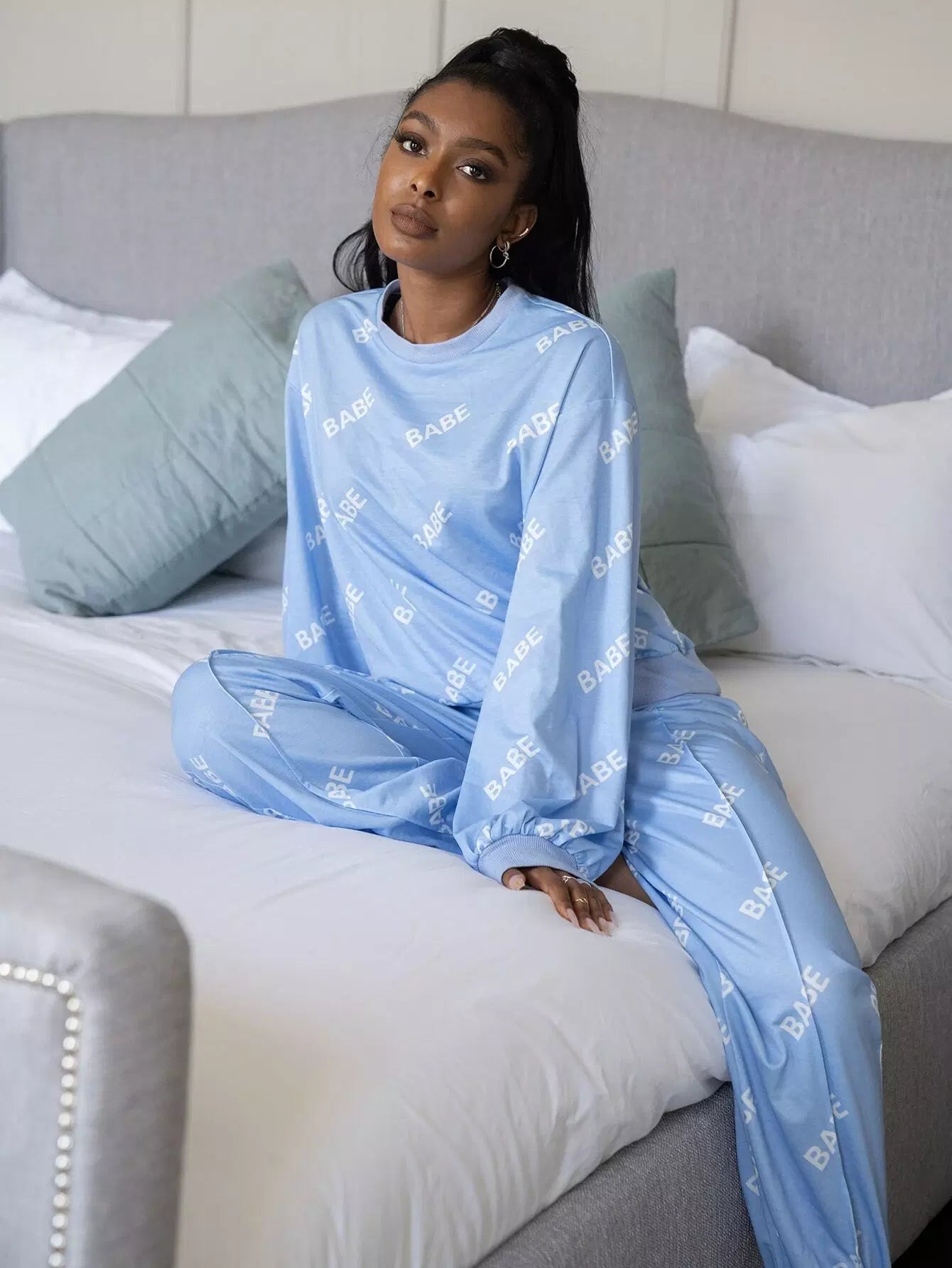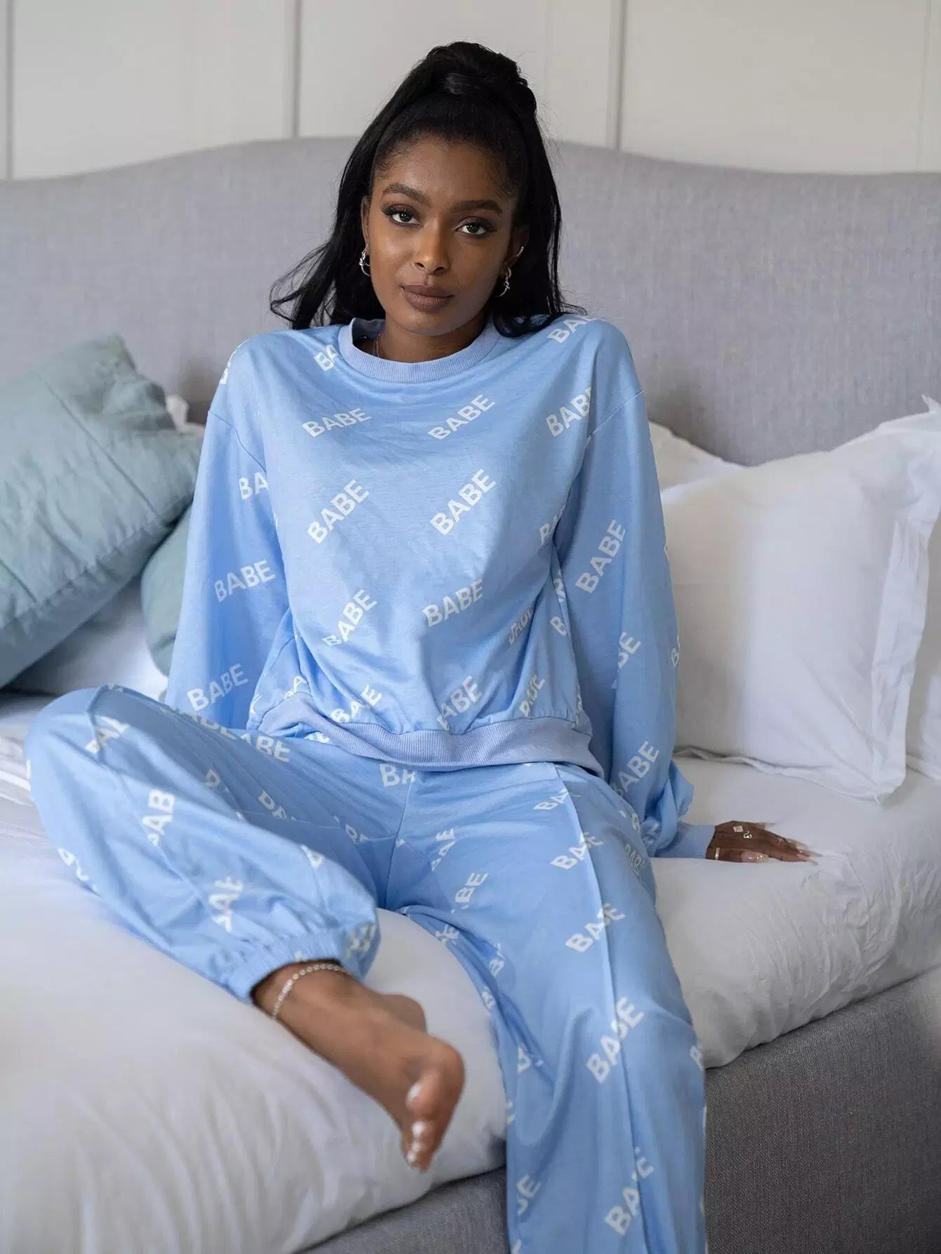 طقم كنزة صوفية برسومات منسدلة على الأكتاف بحروف منسدلة وبنطال بحياكة من الأمام