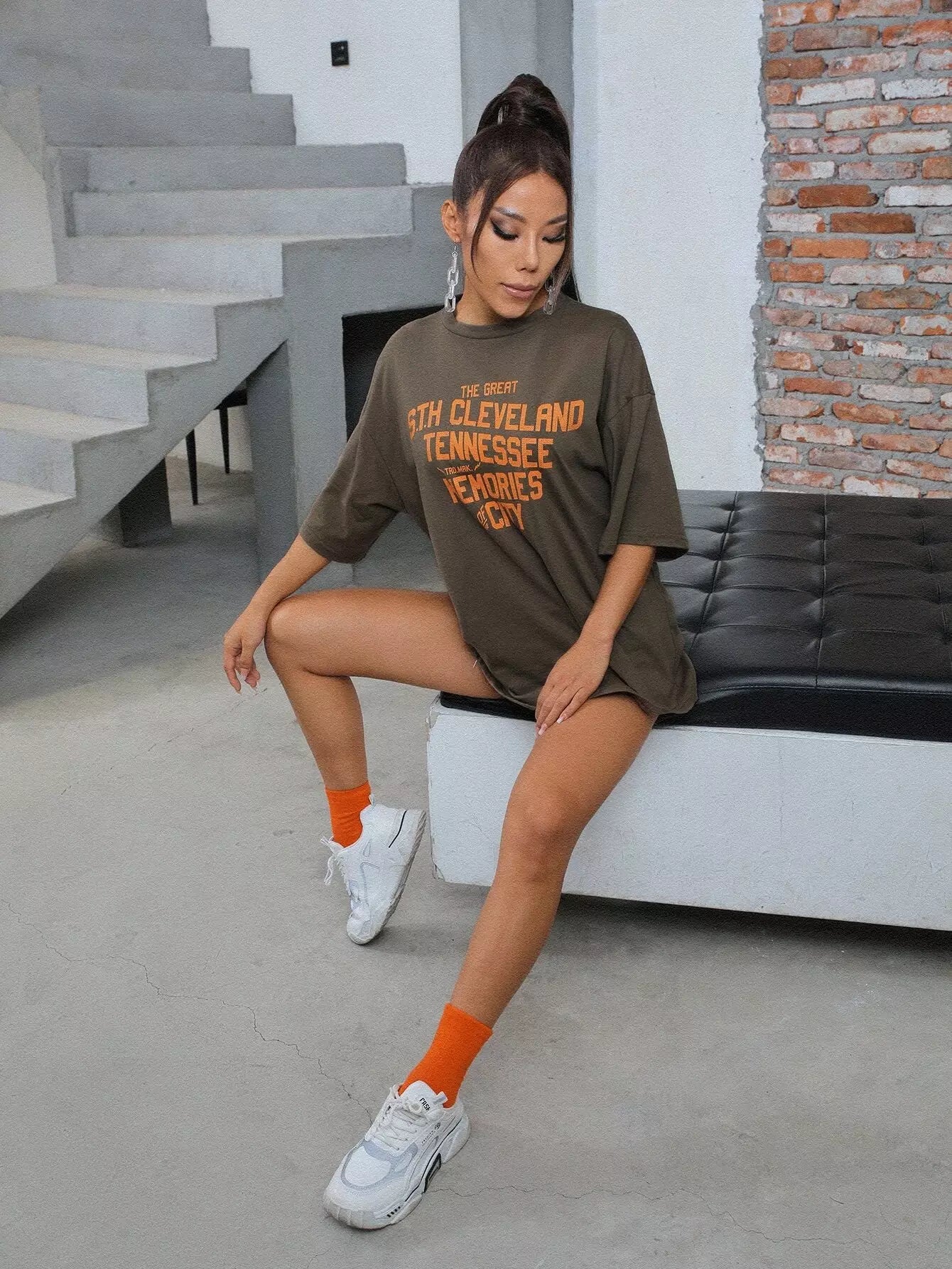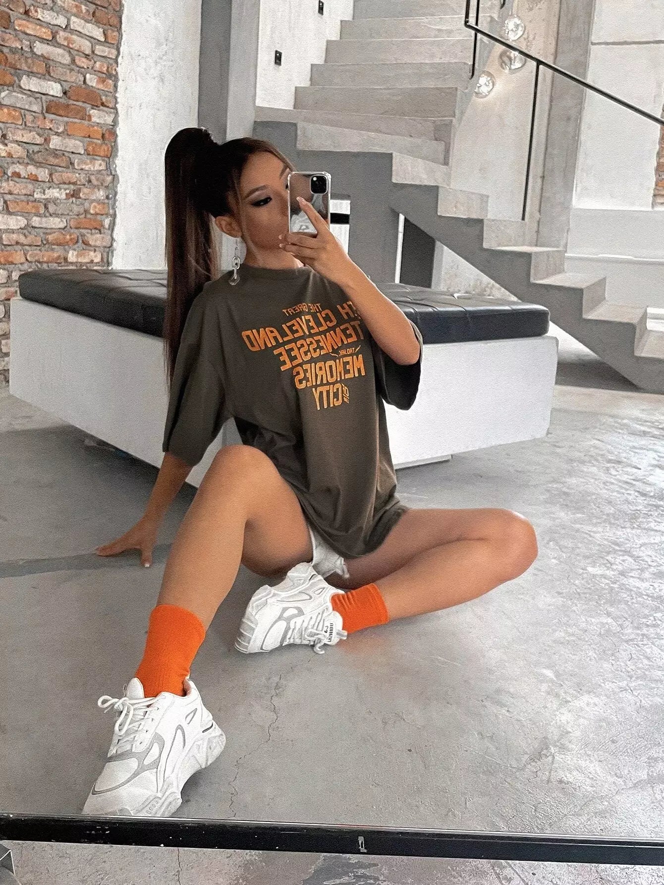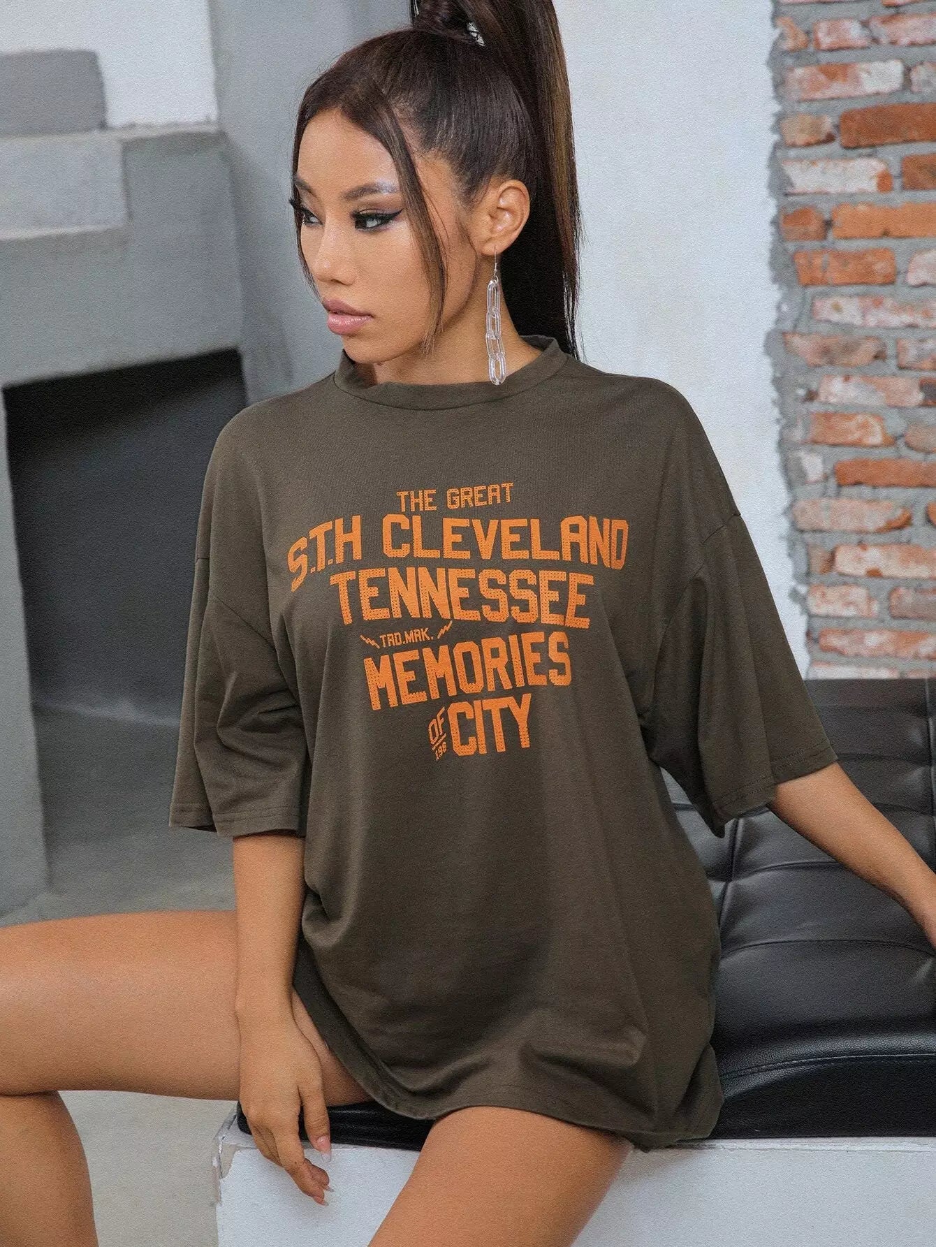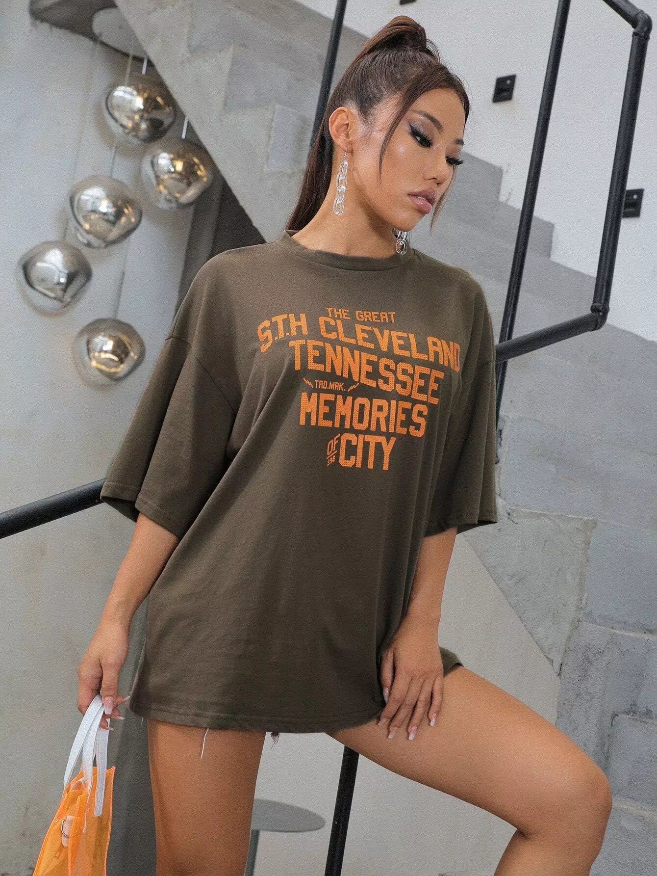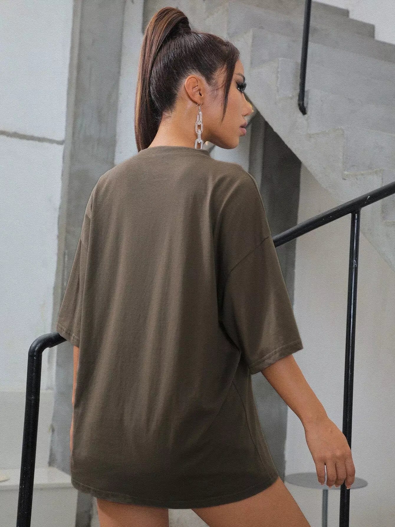 تي شيرت بتصميم منسدل الكتفين برسومات على شكل حرف