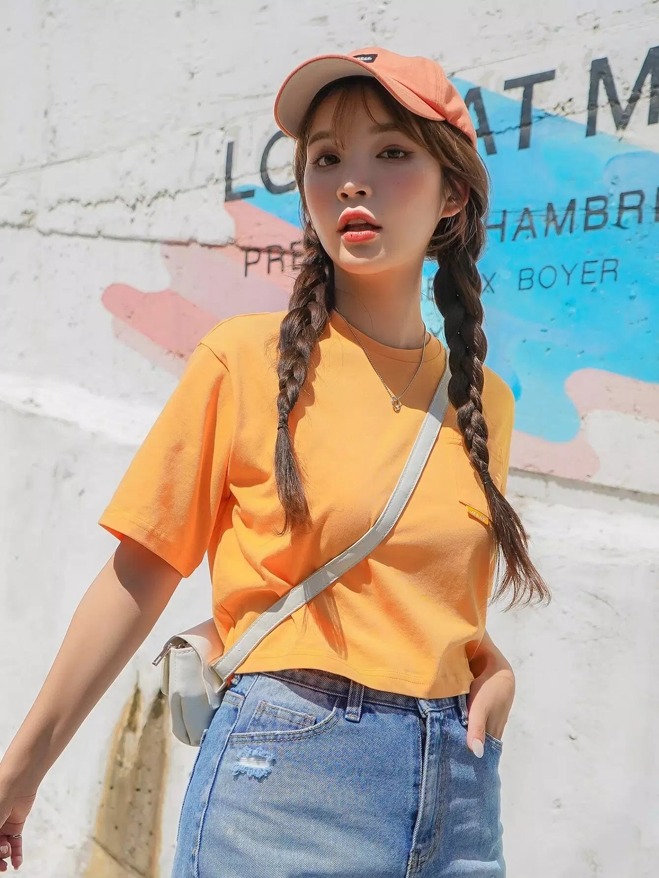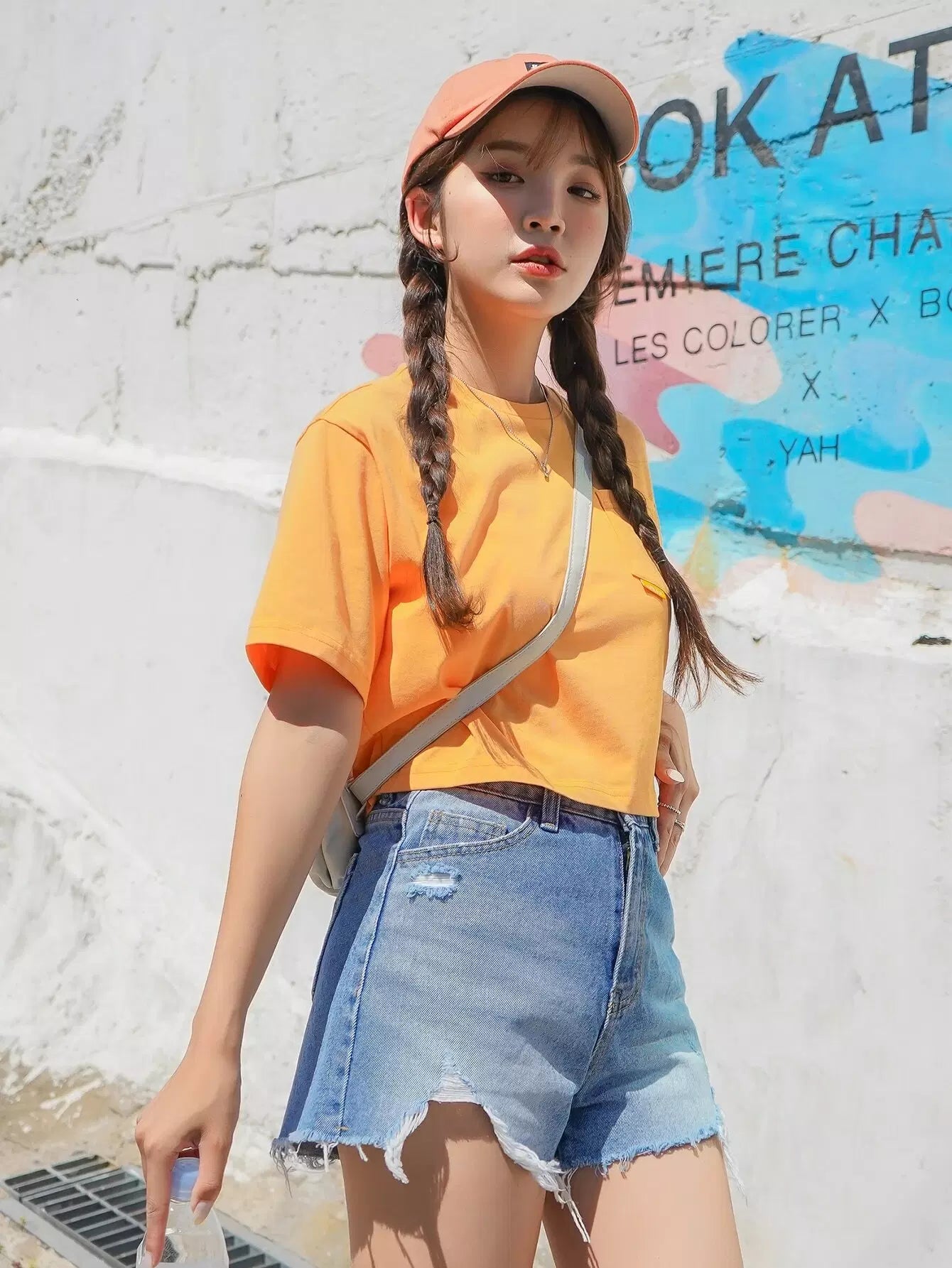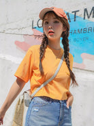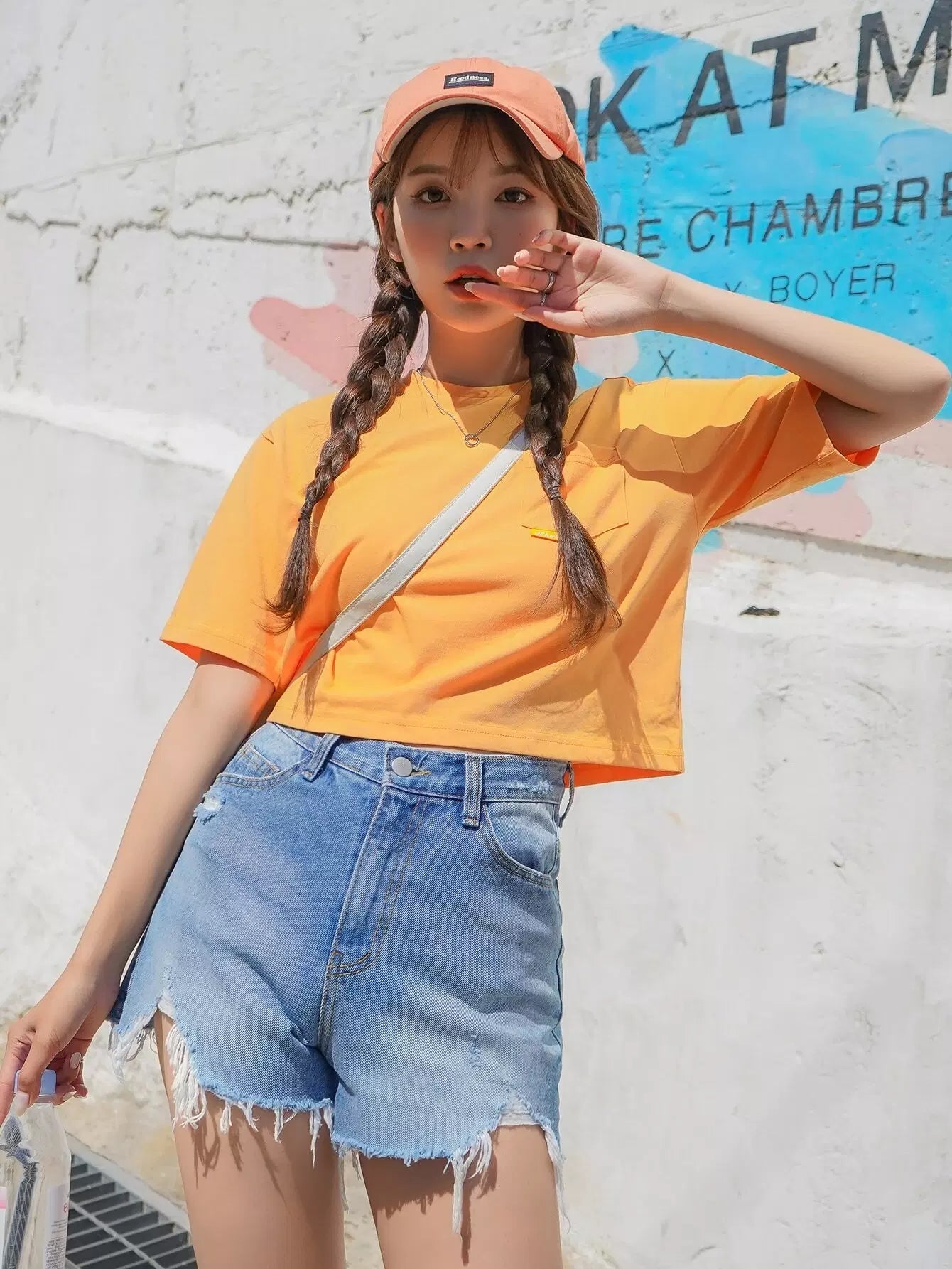 تي شيرت قصير قصير منسدل الكتفين مرقع