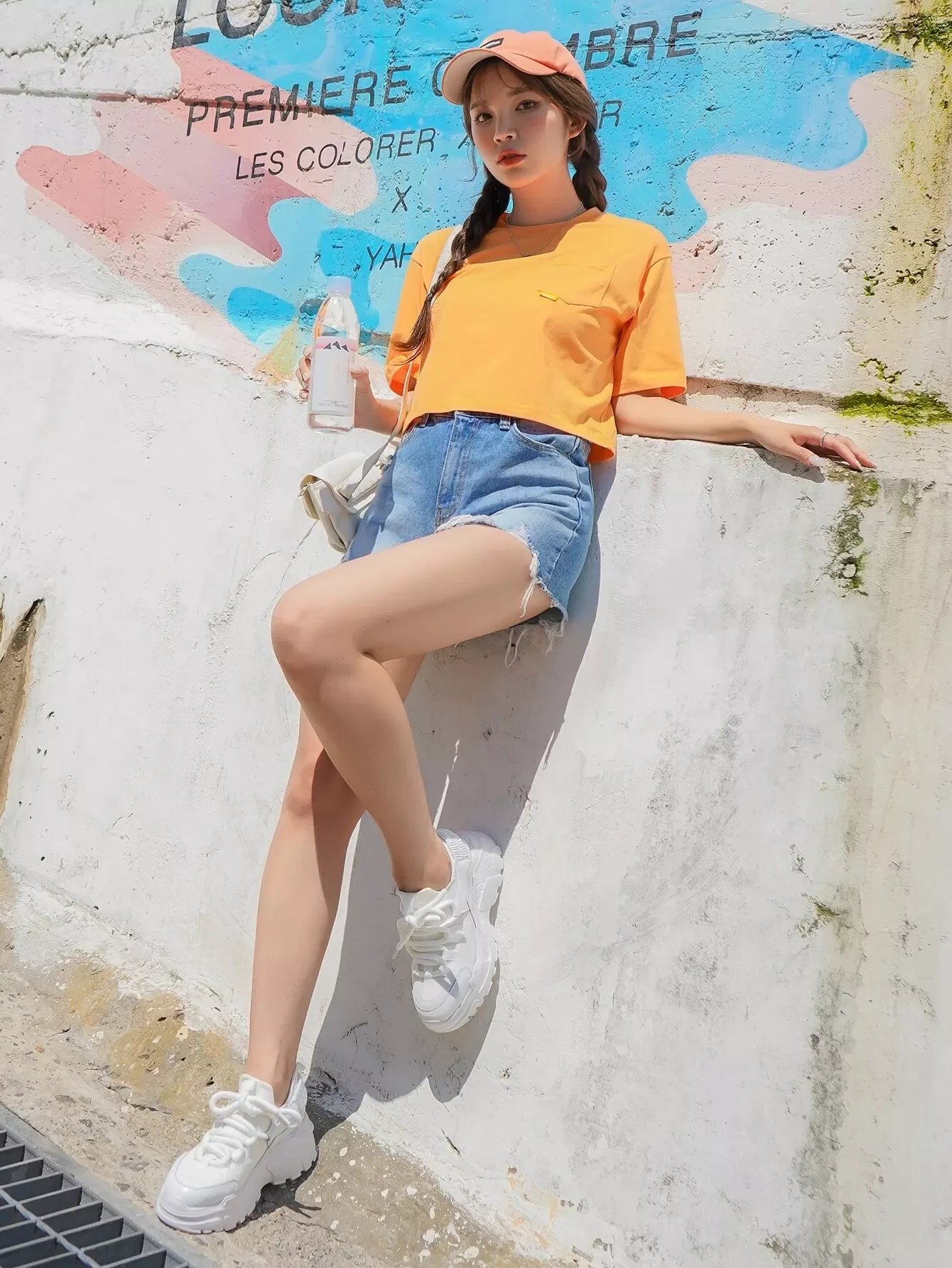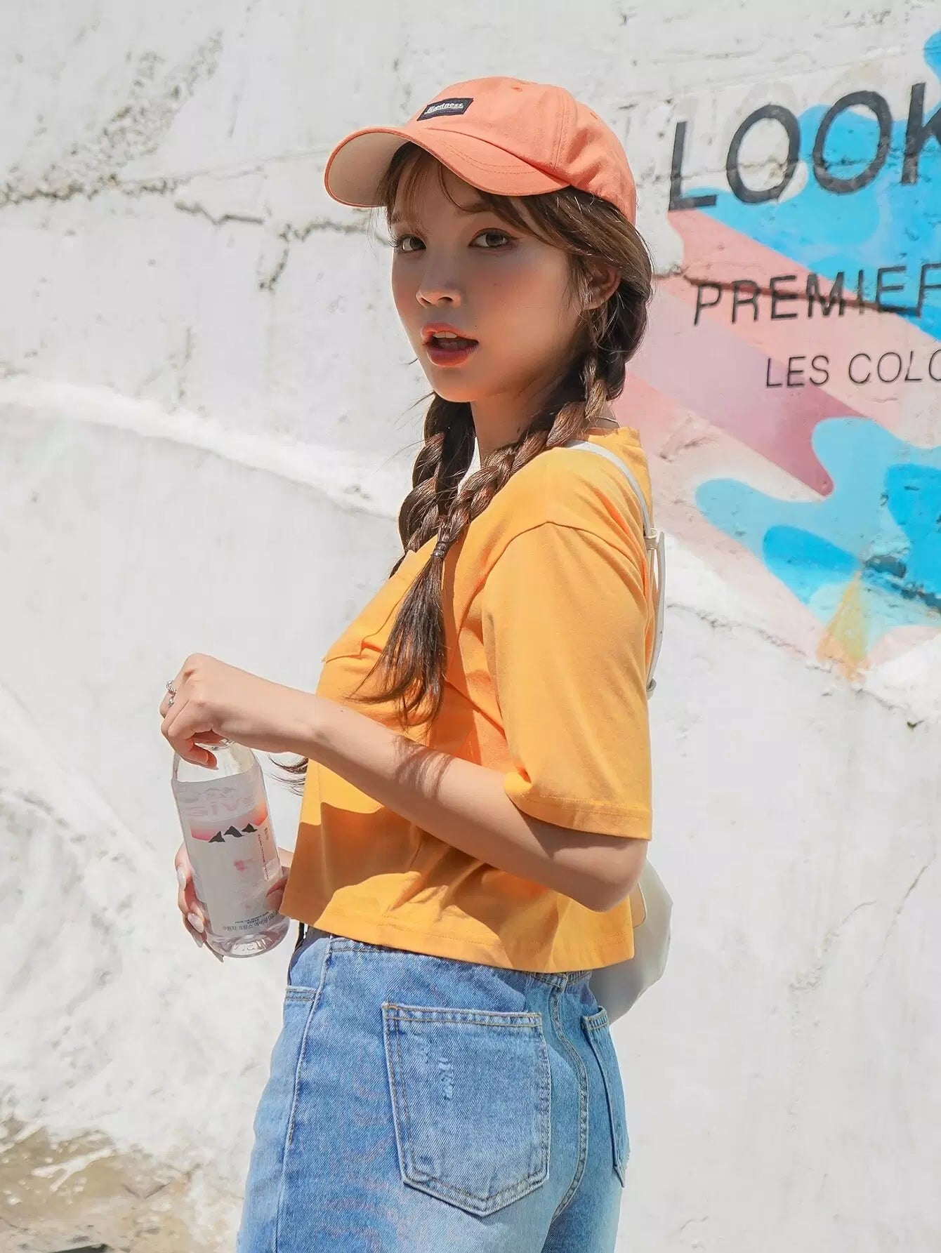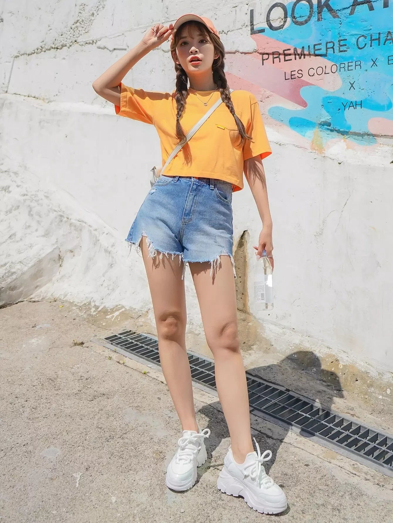 تي شيرت قصير قصير منسدل الكتفين مرقع