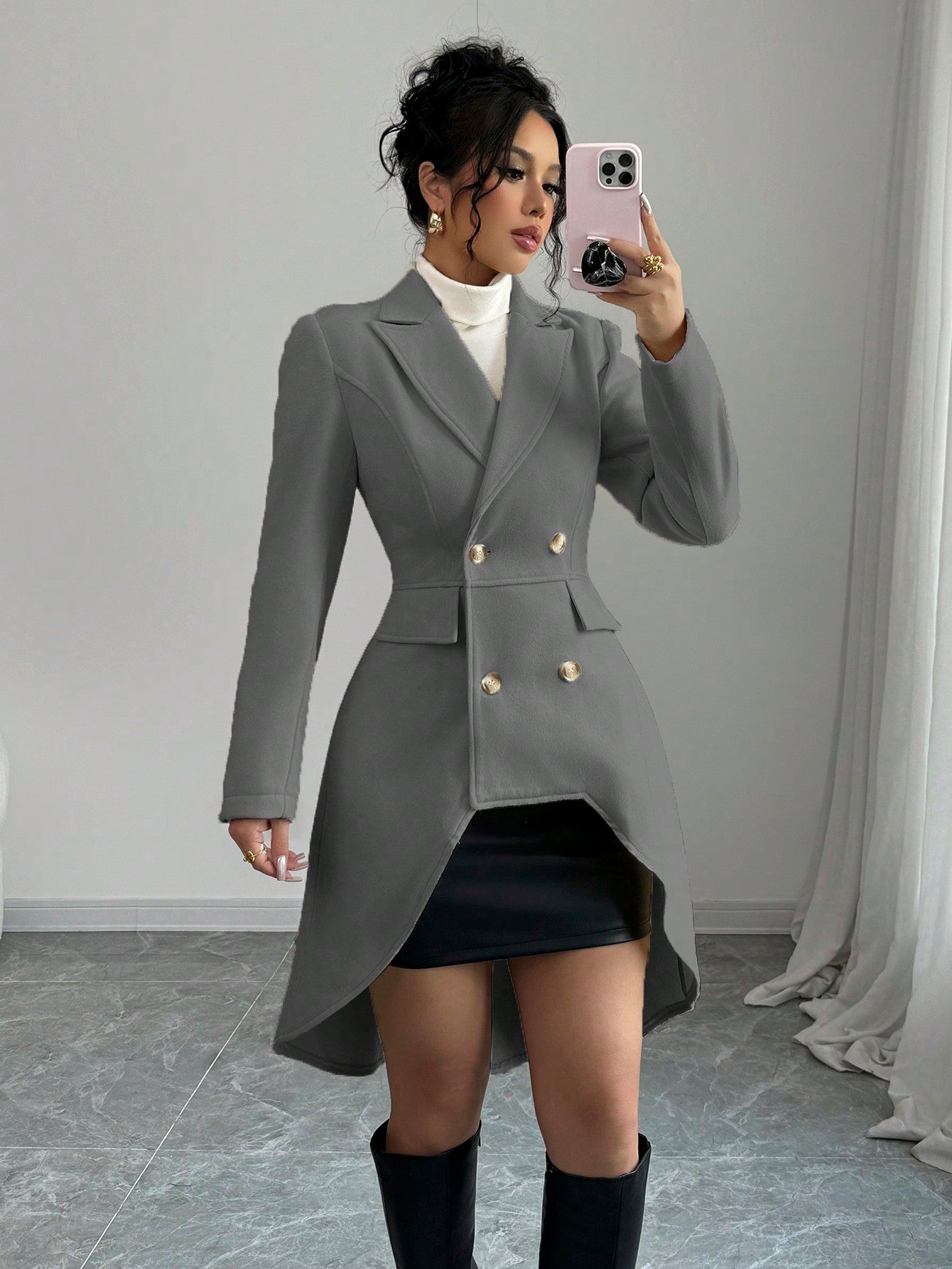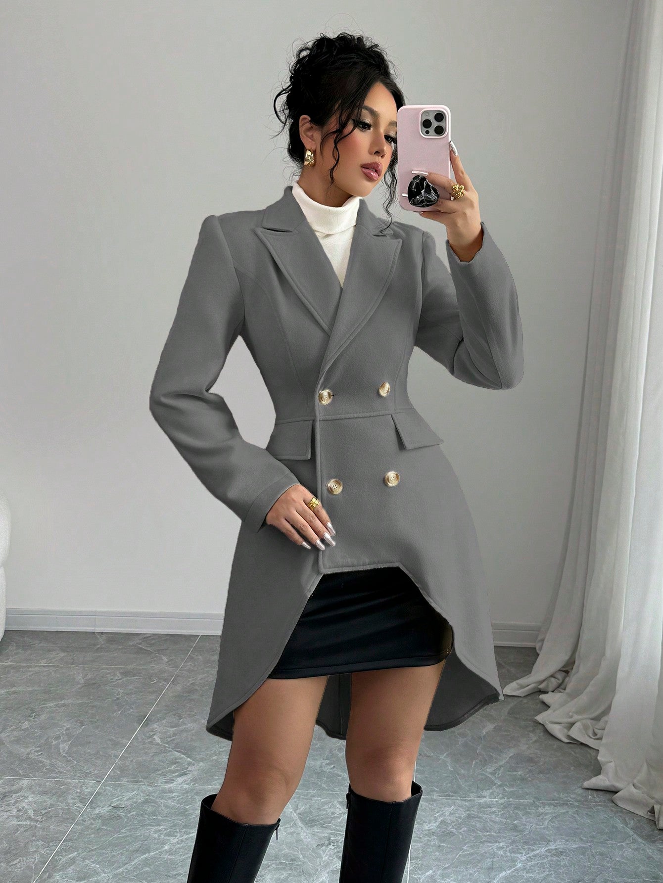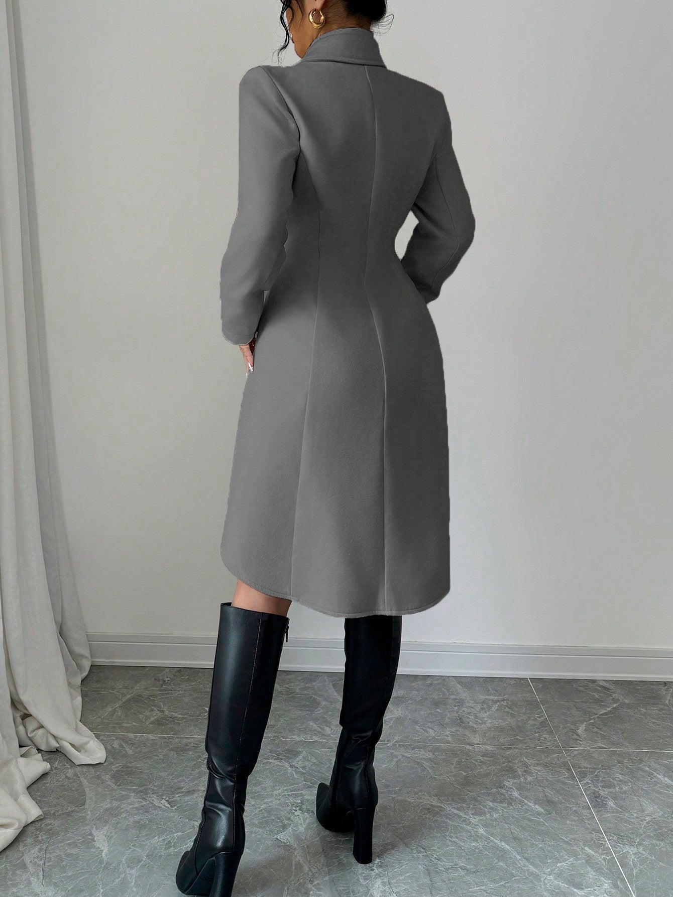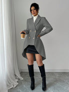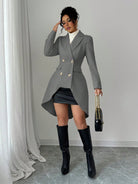 معطف إلينزجا الكاجوال ذو اللون الواحد ذو الصدر المزدوج وطول متوسط، خريف/شتاء