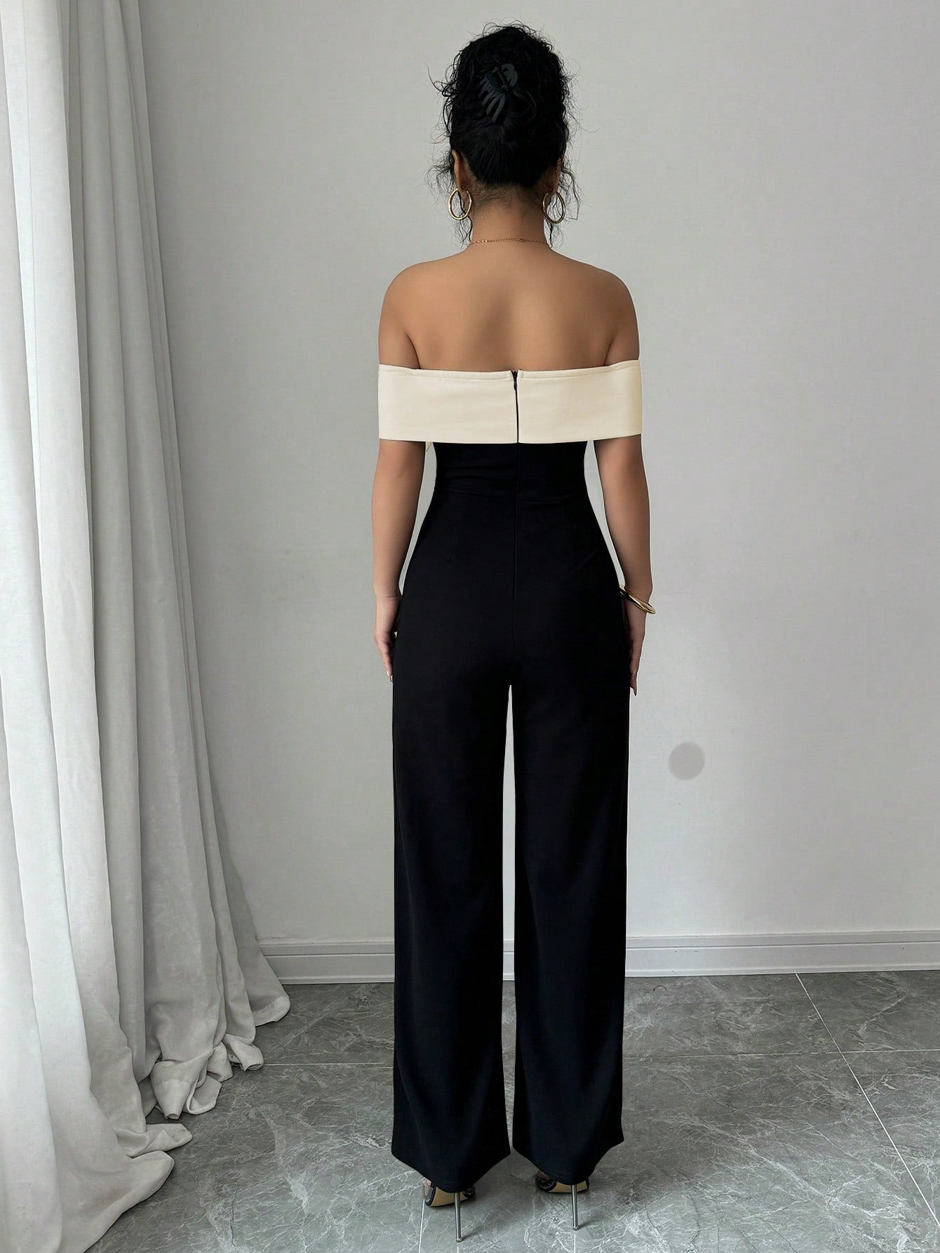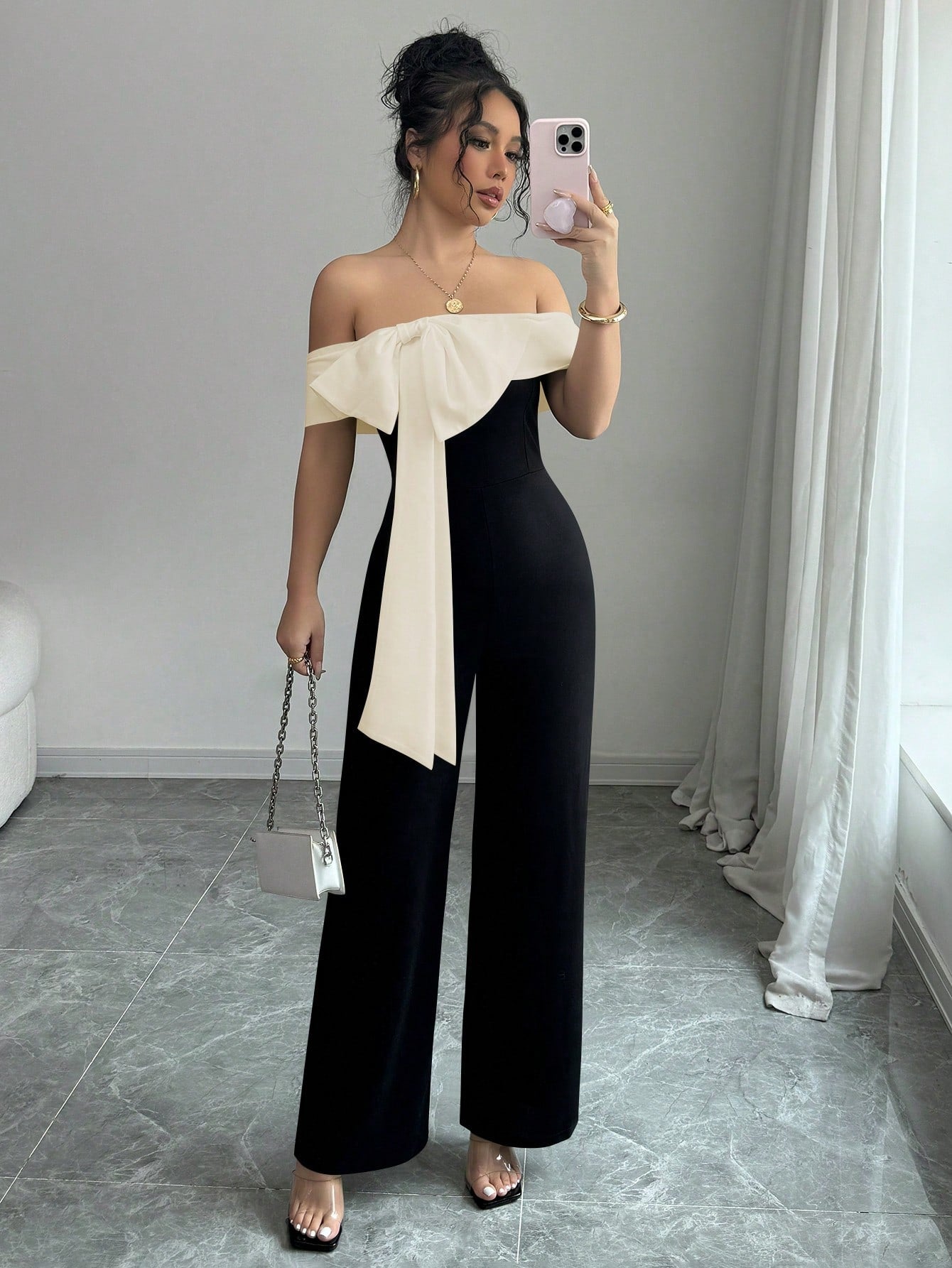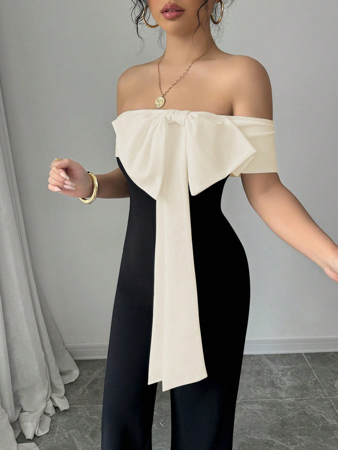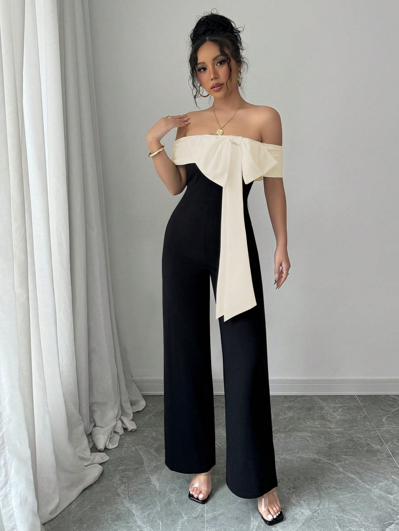 Elenzga Color Block Splicing Bowknot Off-Shoulder Elegant Romantic Women's Jumpsuit