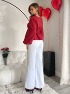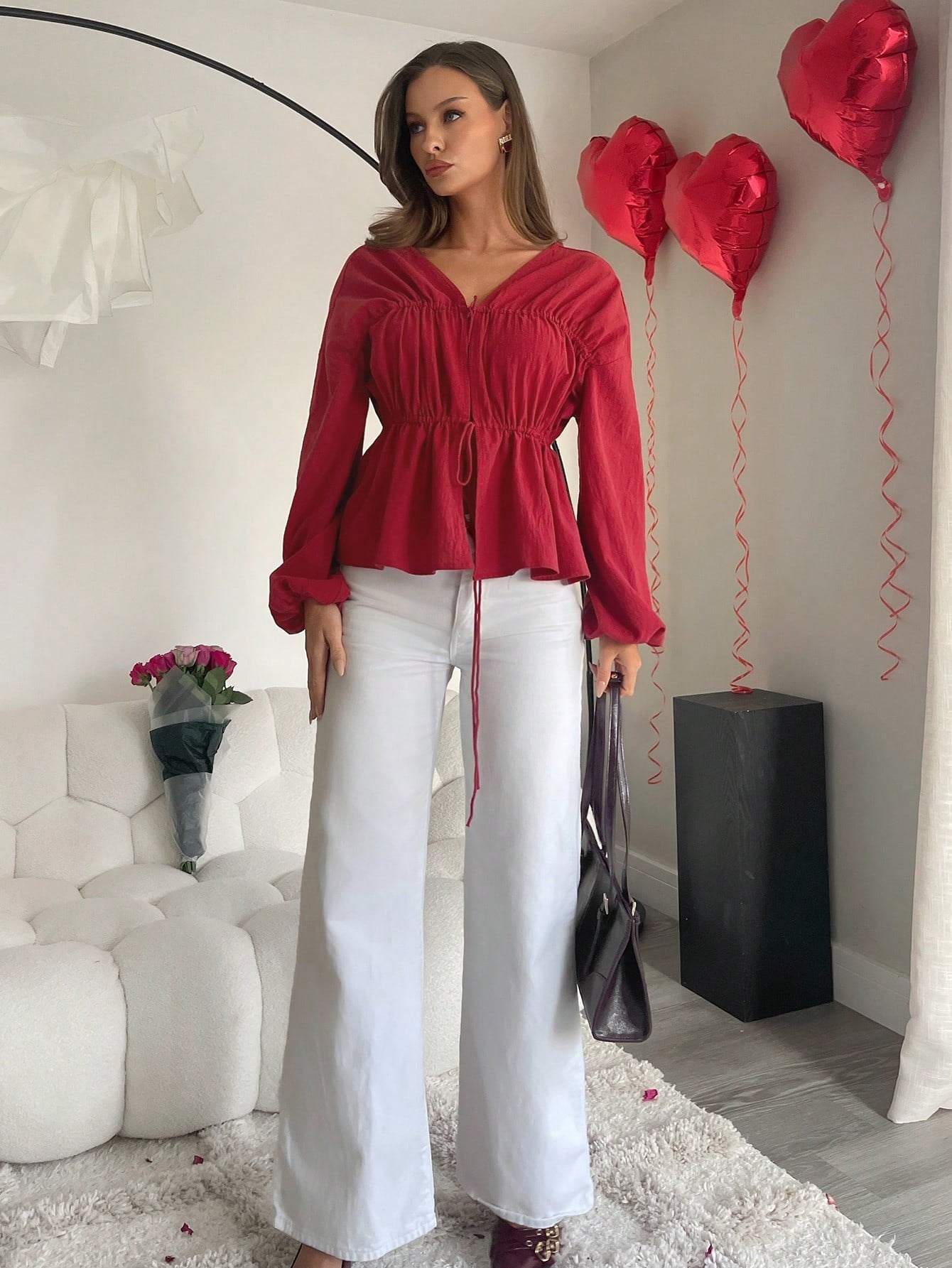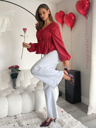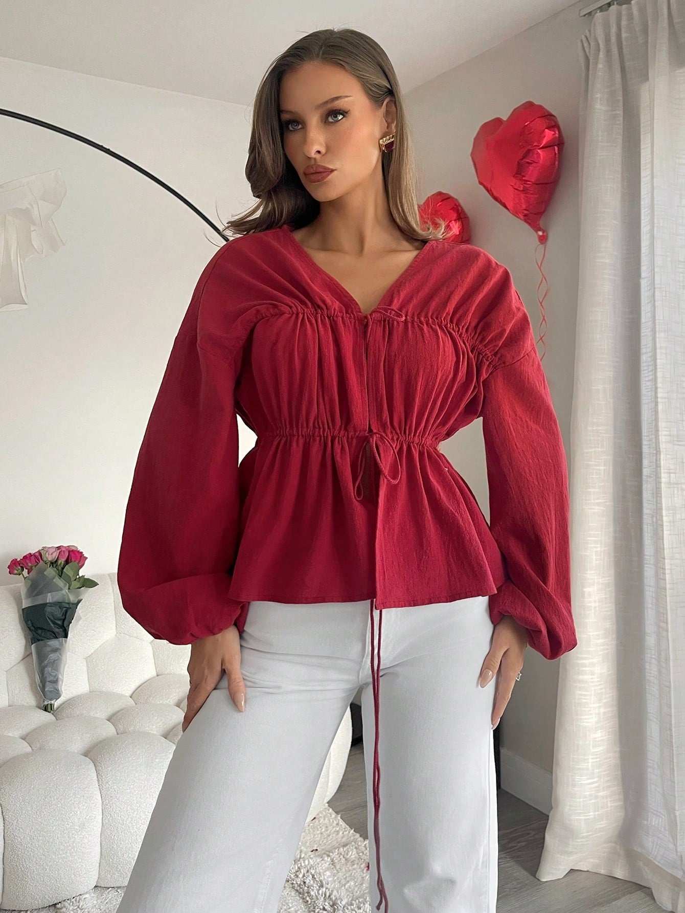 بلوزة نسائية من Essnce بأكمام طويلة وربطات عنق للربيع والصيف باللون الأحمر الداكن بتصميم فانوس سادة كاجوال