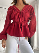 Essnce Women's Spring And Summer Long Sleeve Smock Top With Ties In Dark Red Casual Solid Color Lantern