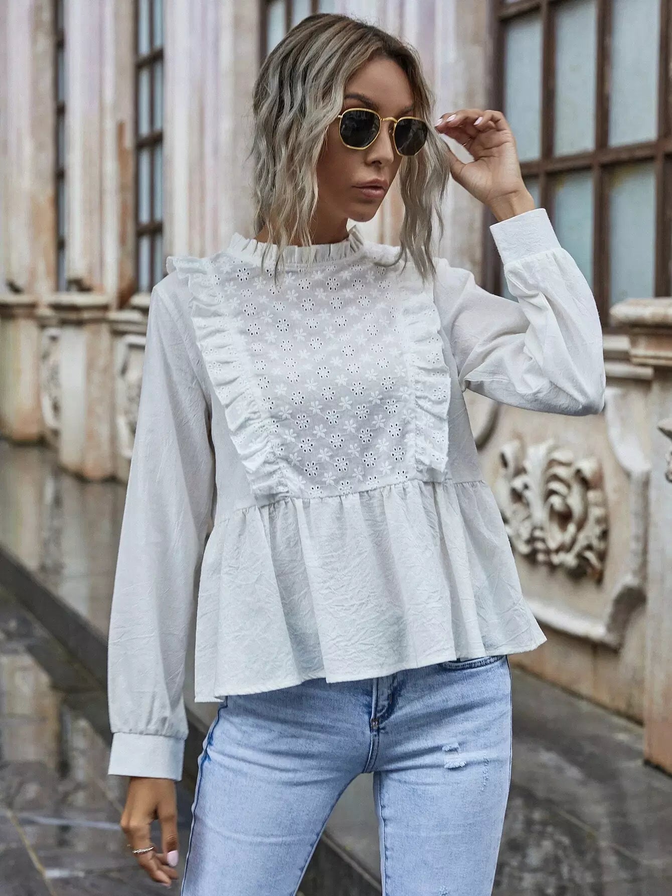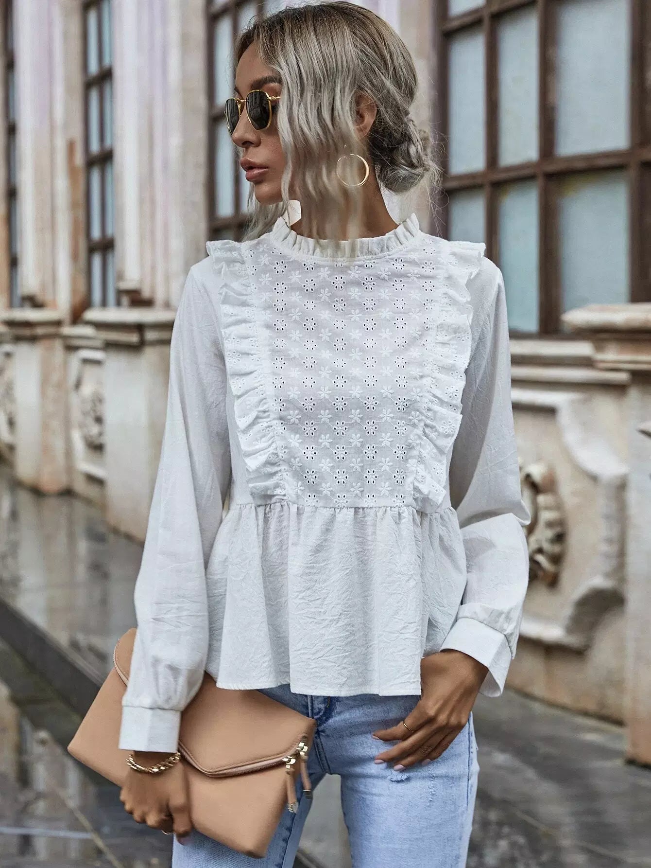 للنساء - بلوزة بيبي دول مطرزة ذات فتحات وكشكشة