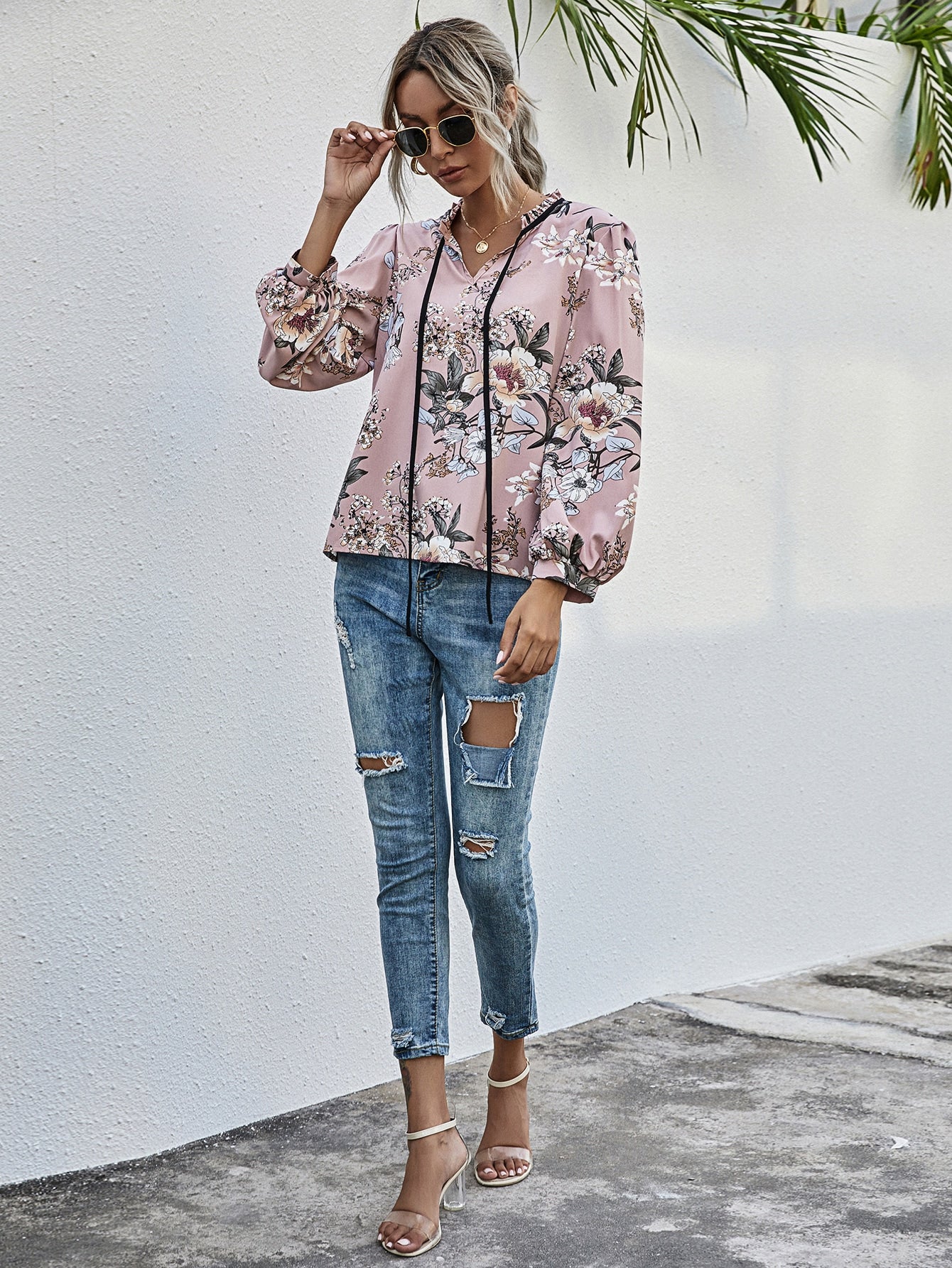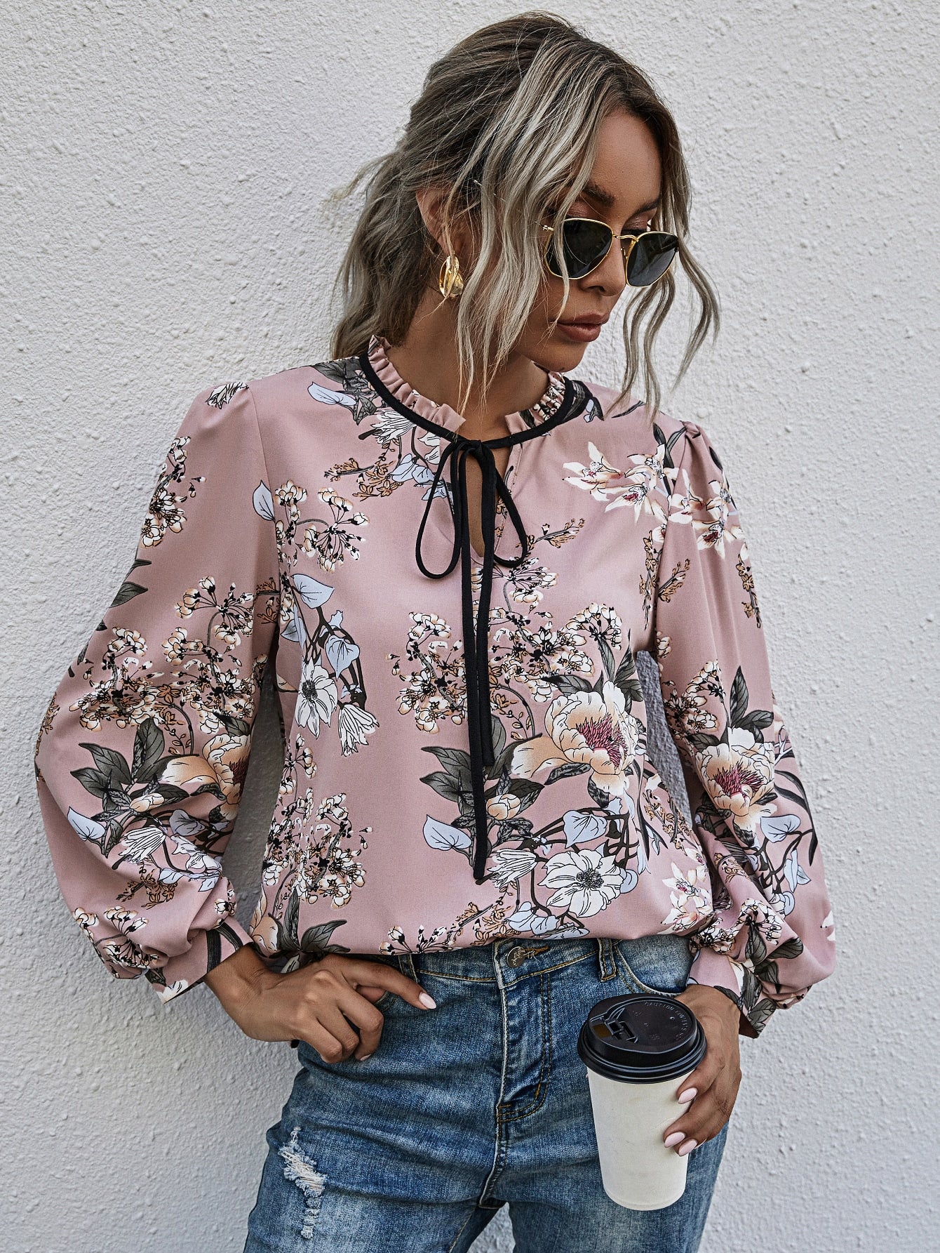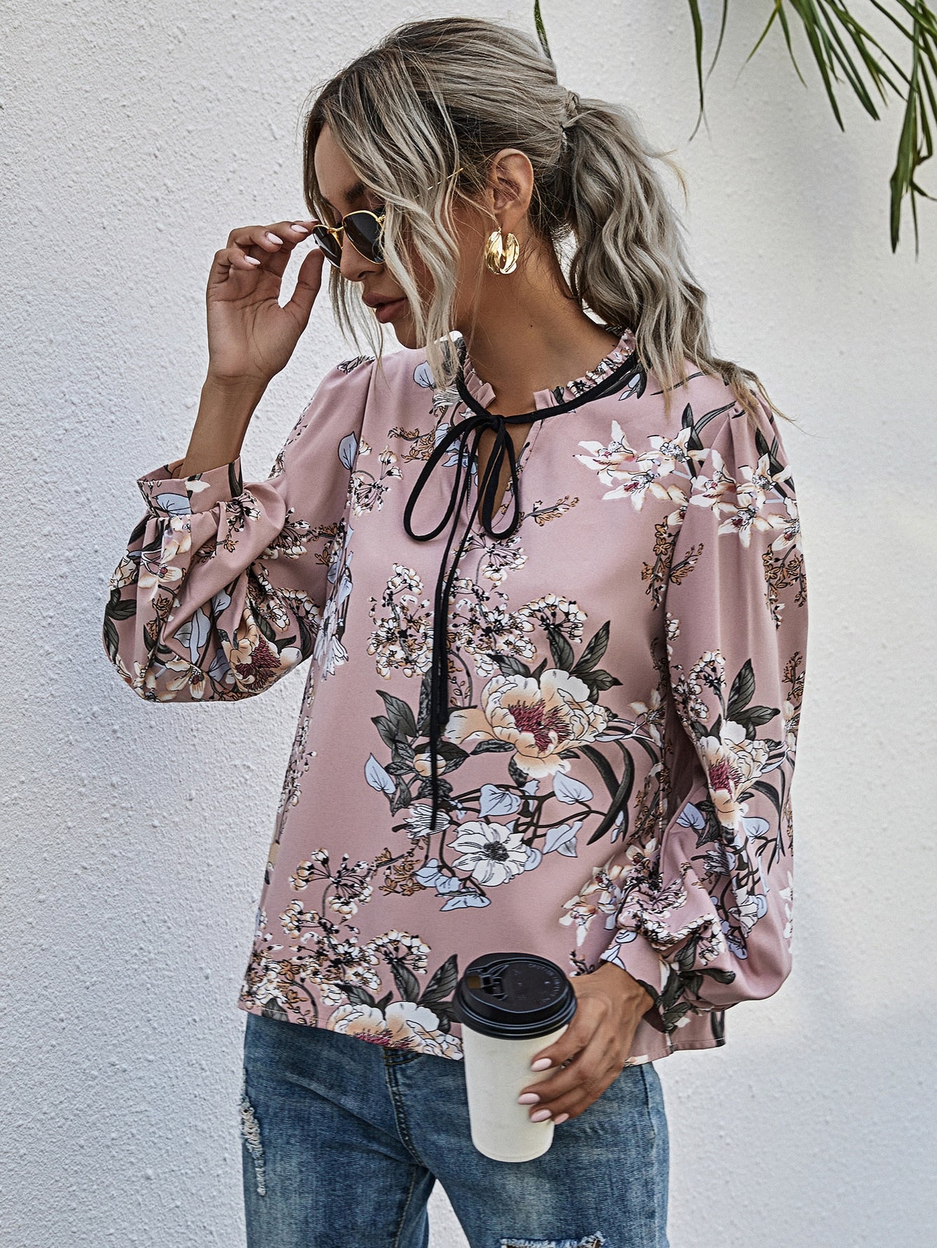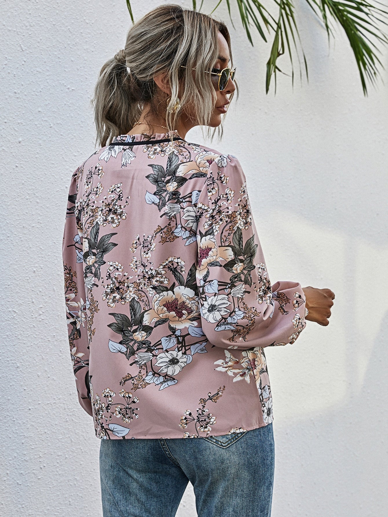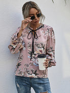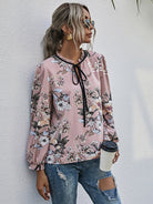 Floral Print Frill Trim Tie Neck Puff Sleeve Blouse