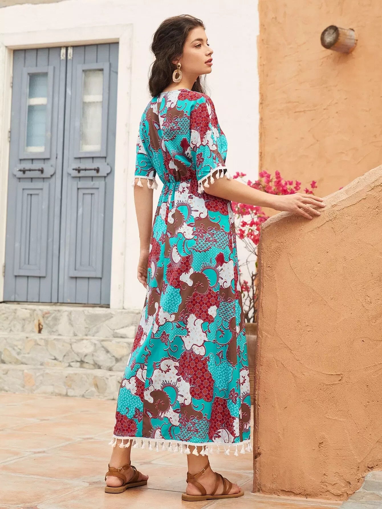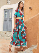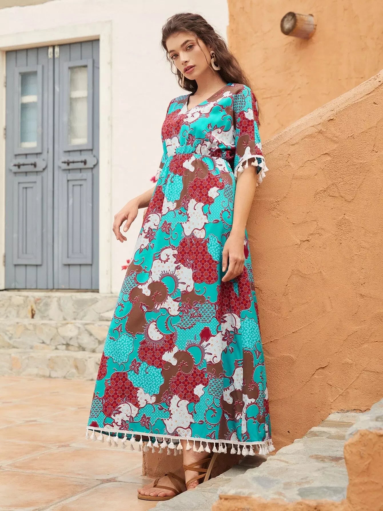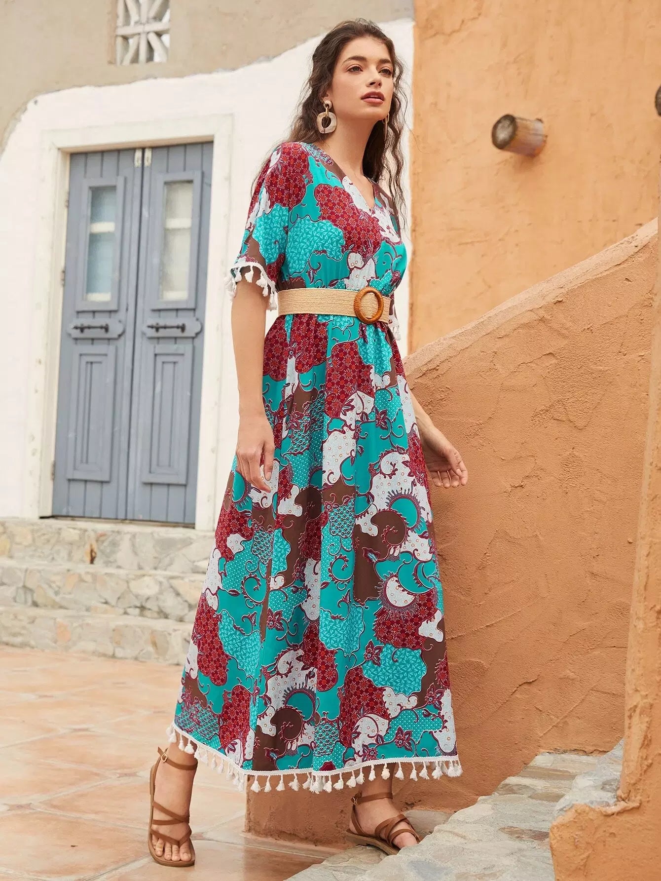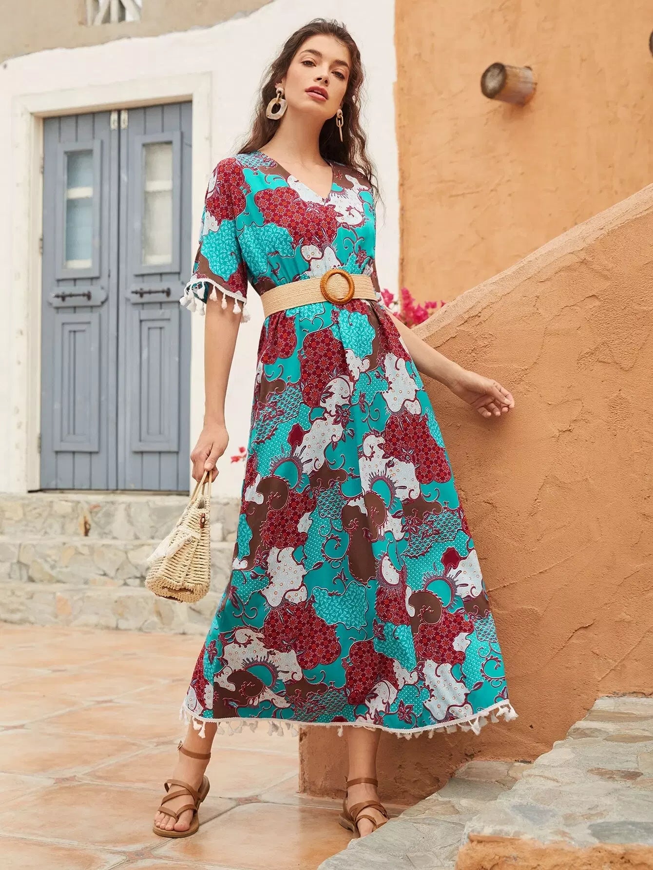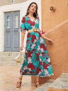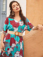 فستان مزين بطبعة زهور بياقة على شكل حرف V بدون حزام