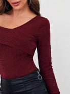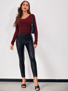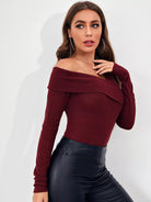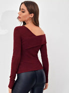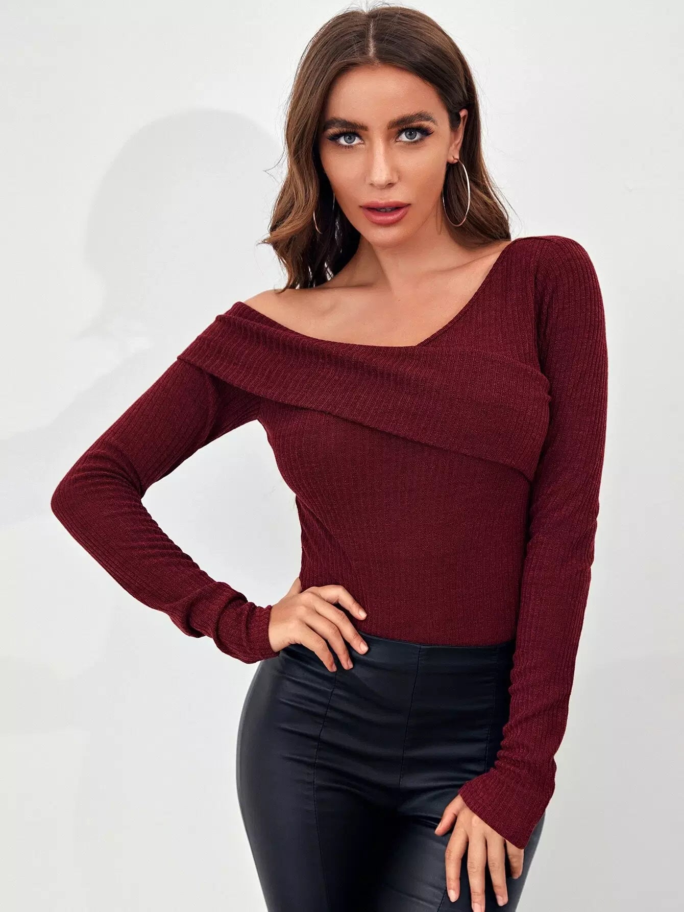 تي شيرت برقبة غير متناسقة مطوية برقبة غير متناسقة ومحبوكة على شكل ضلع