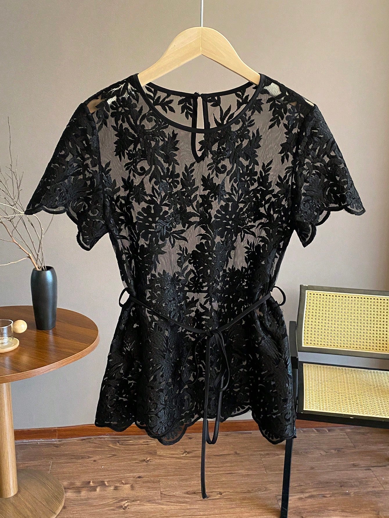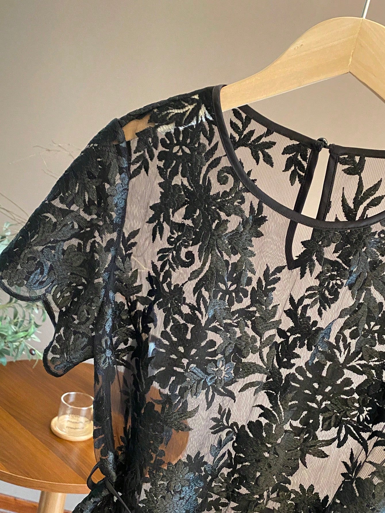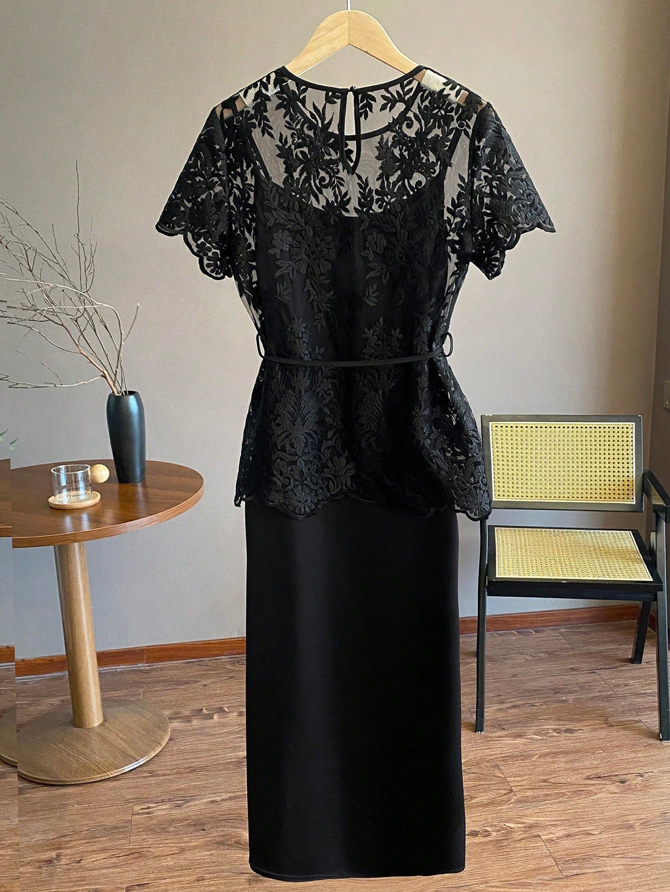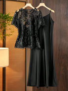 Franclia Women's Elegant Embroidered Lace Blouse And Solid Color Camisole Dress Set