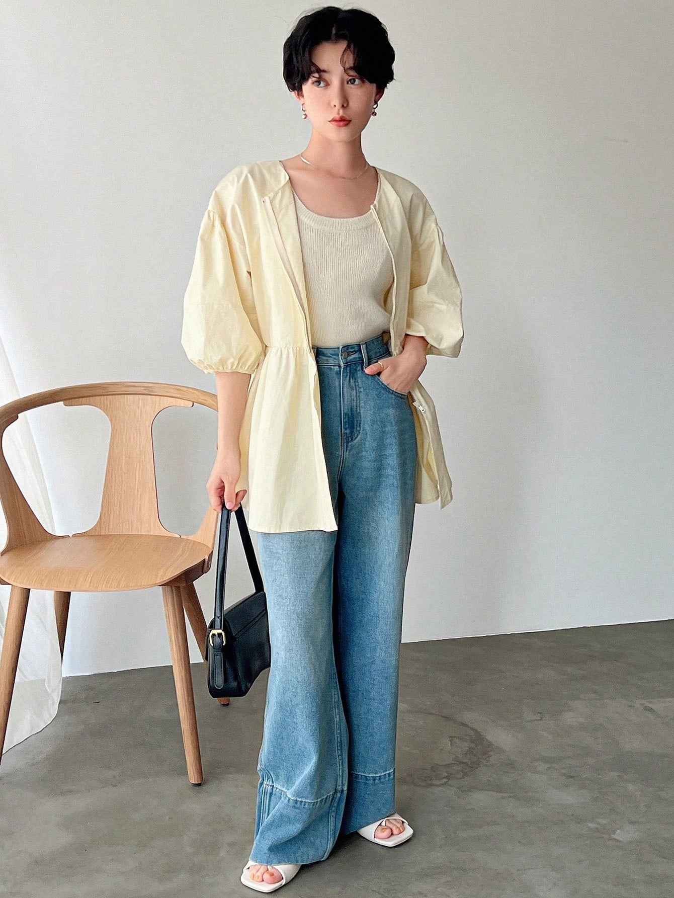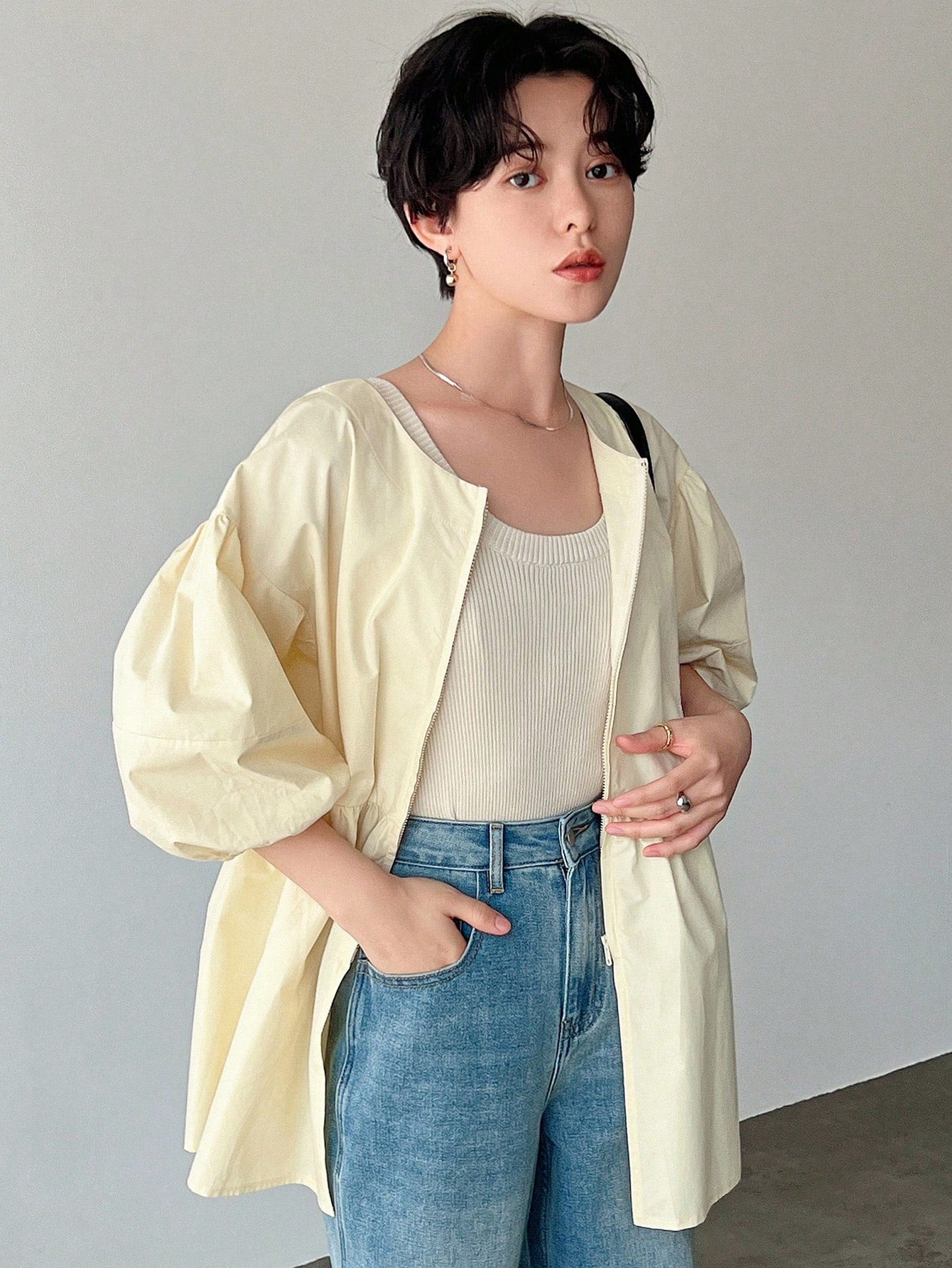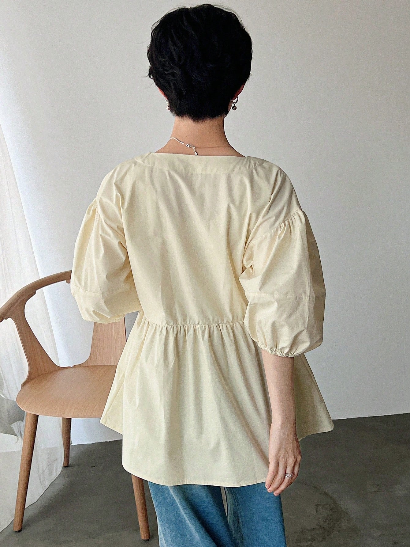 قميص نسائي كاجوال بأكمام منتفخة بلون واحد من FRIFUL لفصل الربيع/الصيف، مكشكش