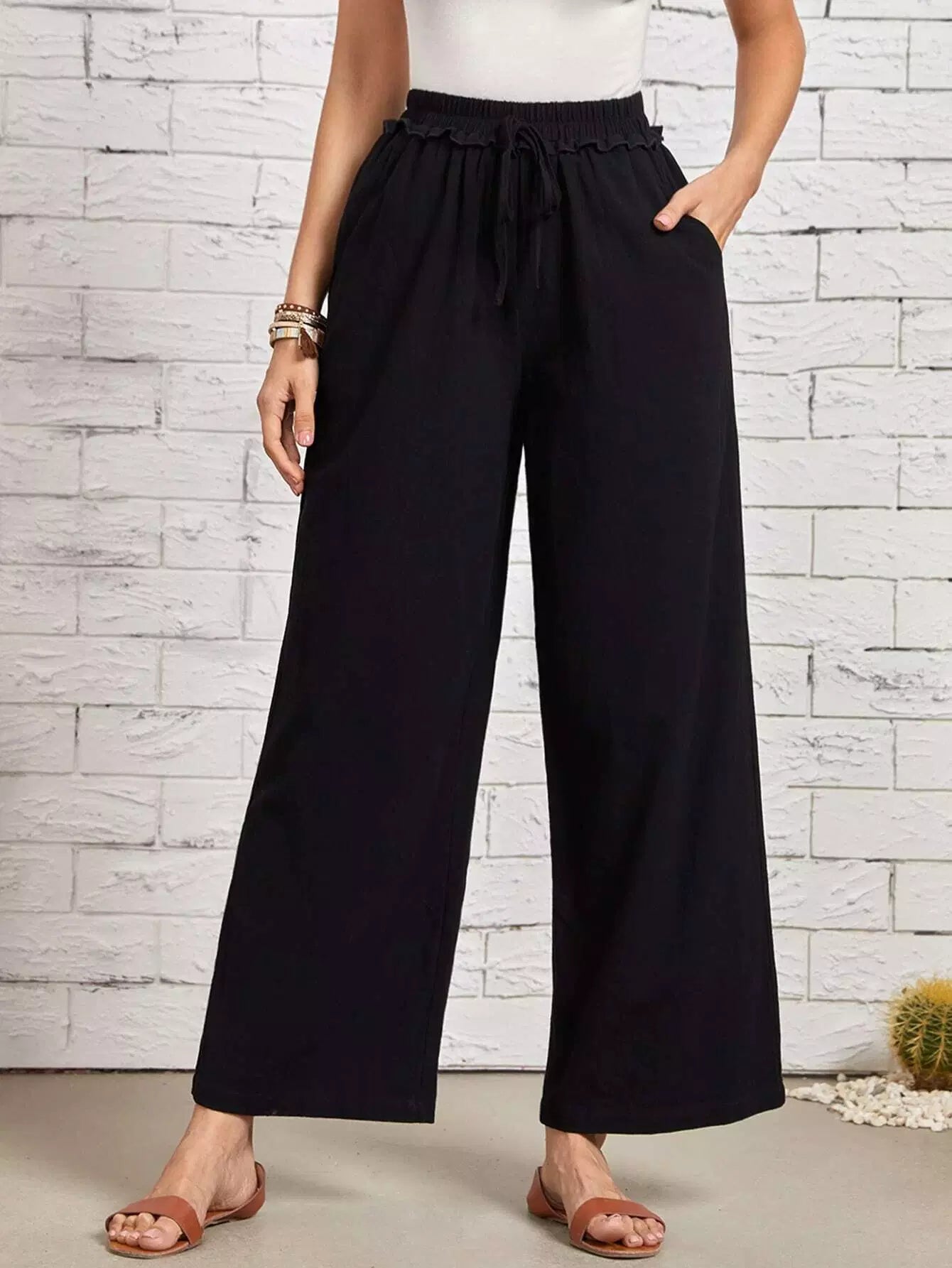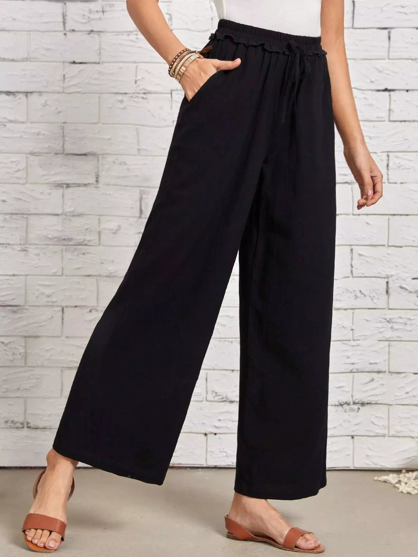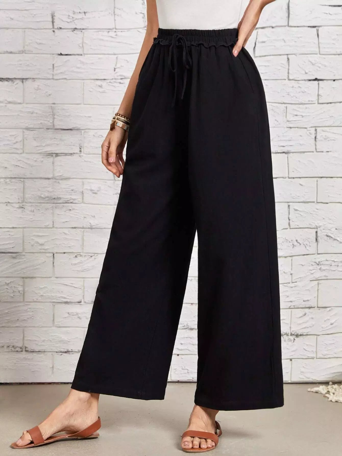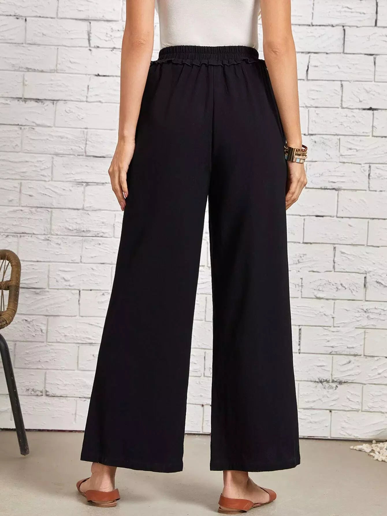 بنطلون بحواف كشكش بعقدة أمامية عريضة من الأمام