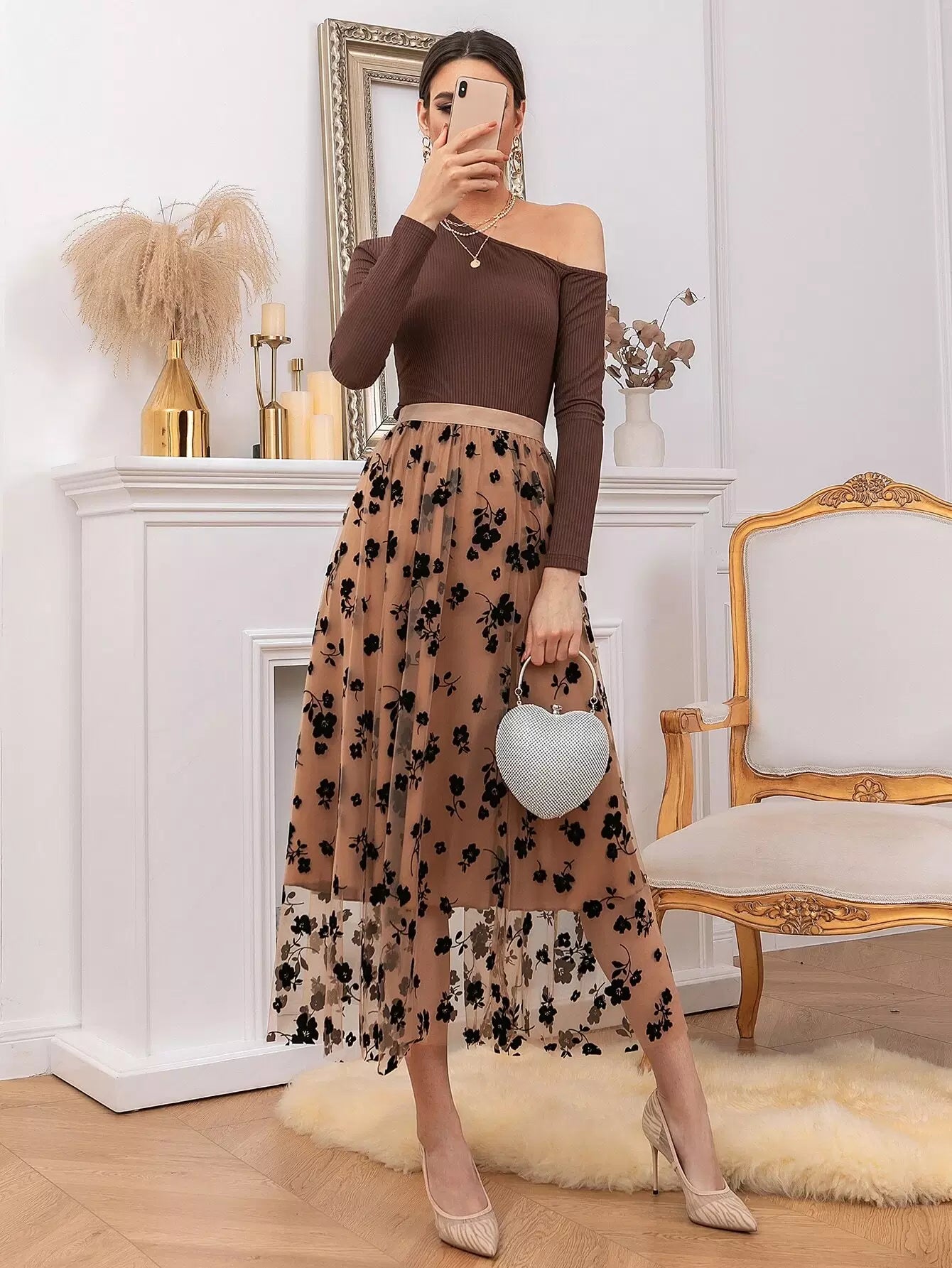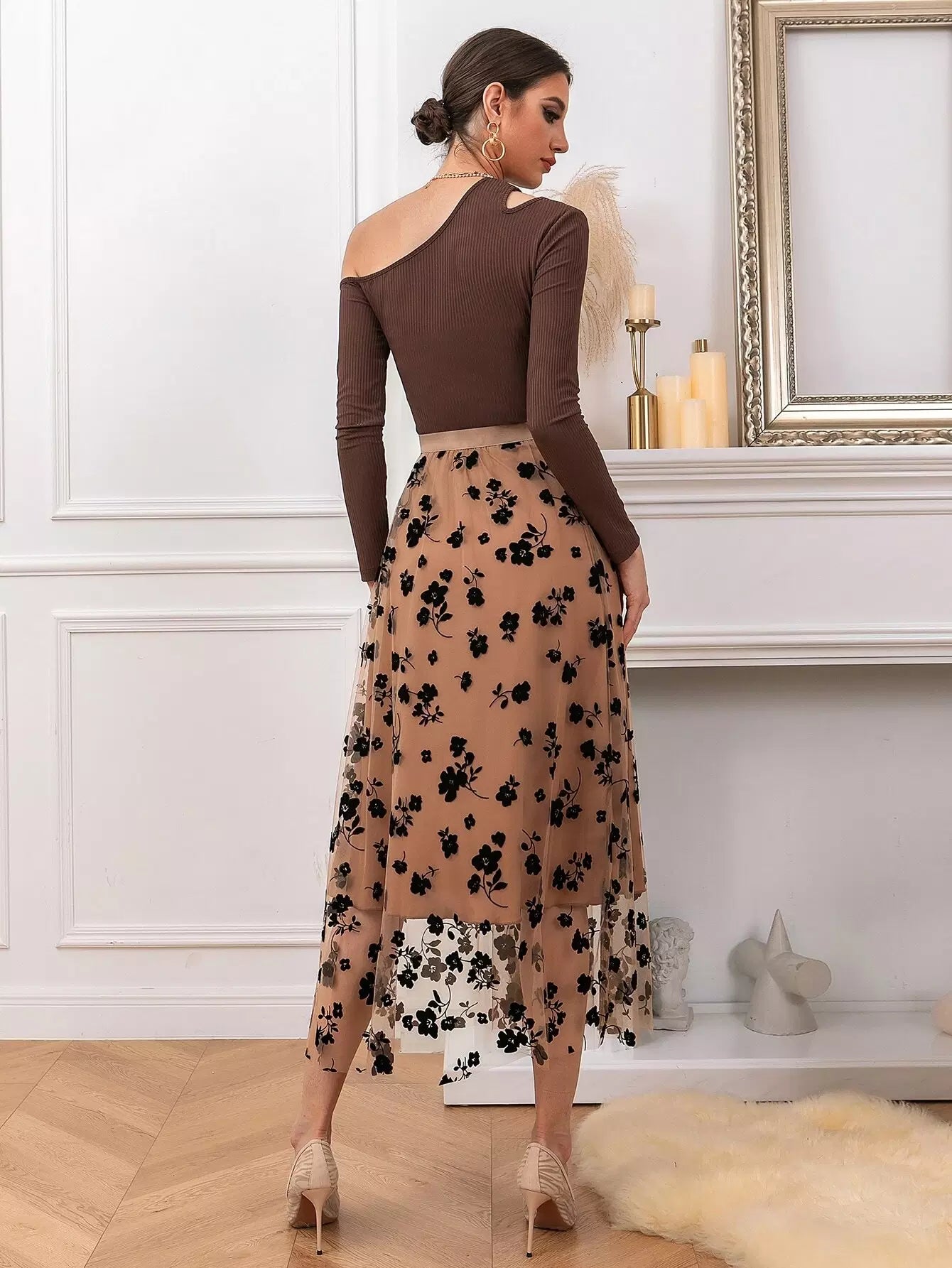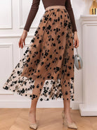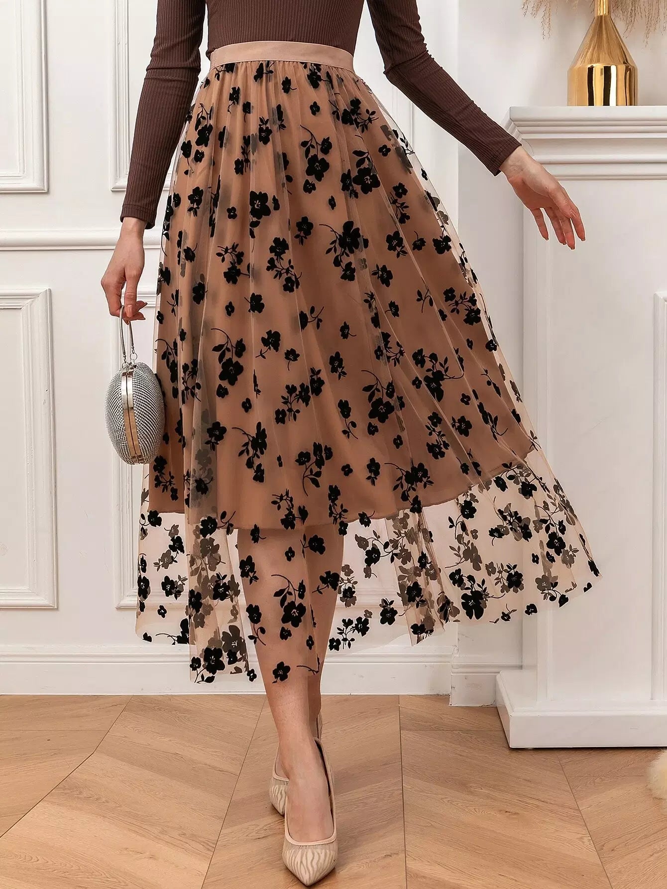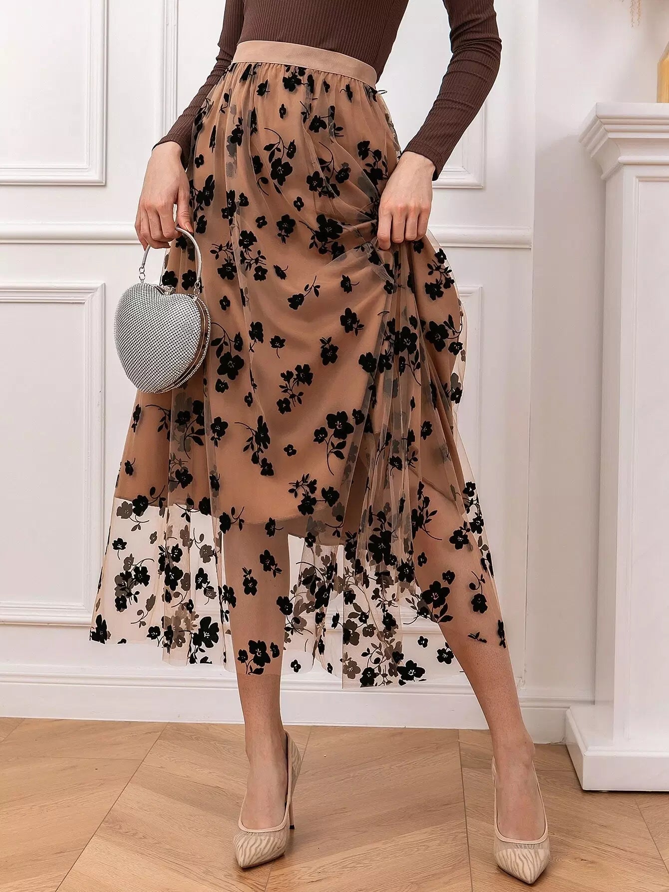 تنورة شبكية مزخرفة بالزهور عالية الخصر