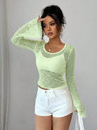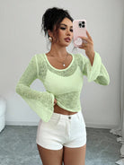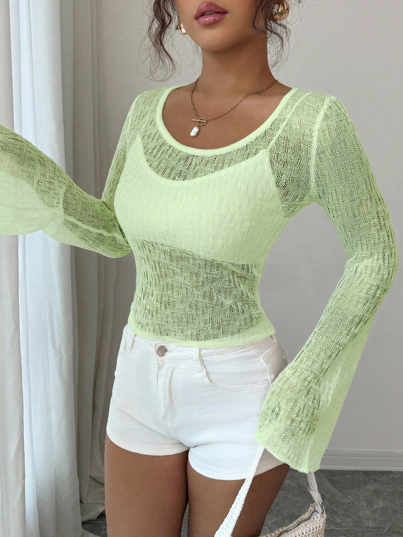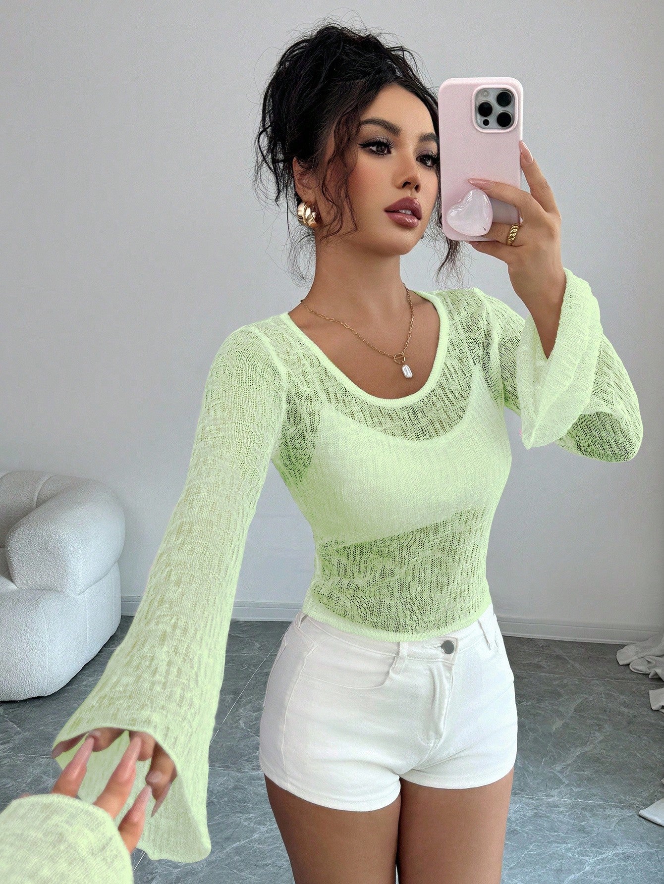 women INAWLY Women Solid Color Round Neck Flared Sleeve Pleated Casual Sweater Knit Pullover Fall Winter