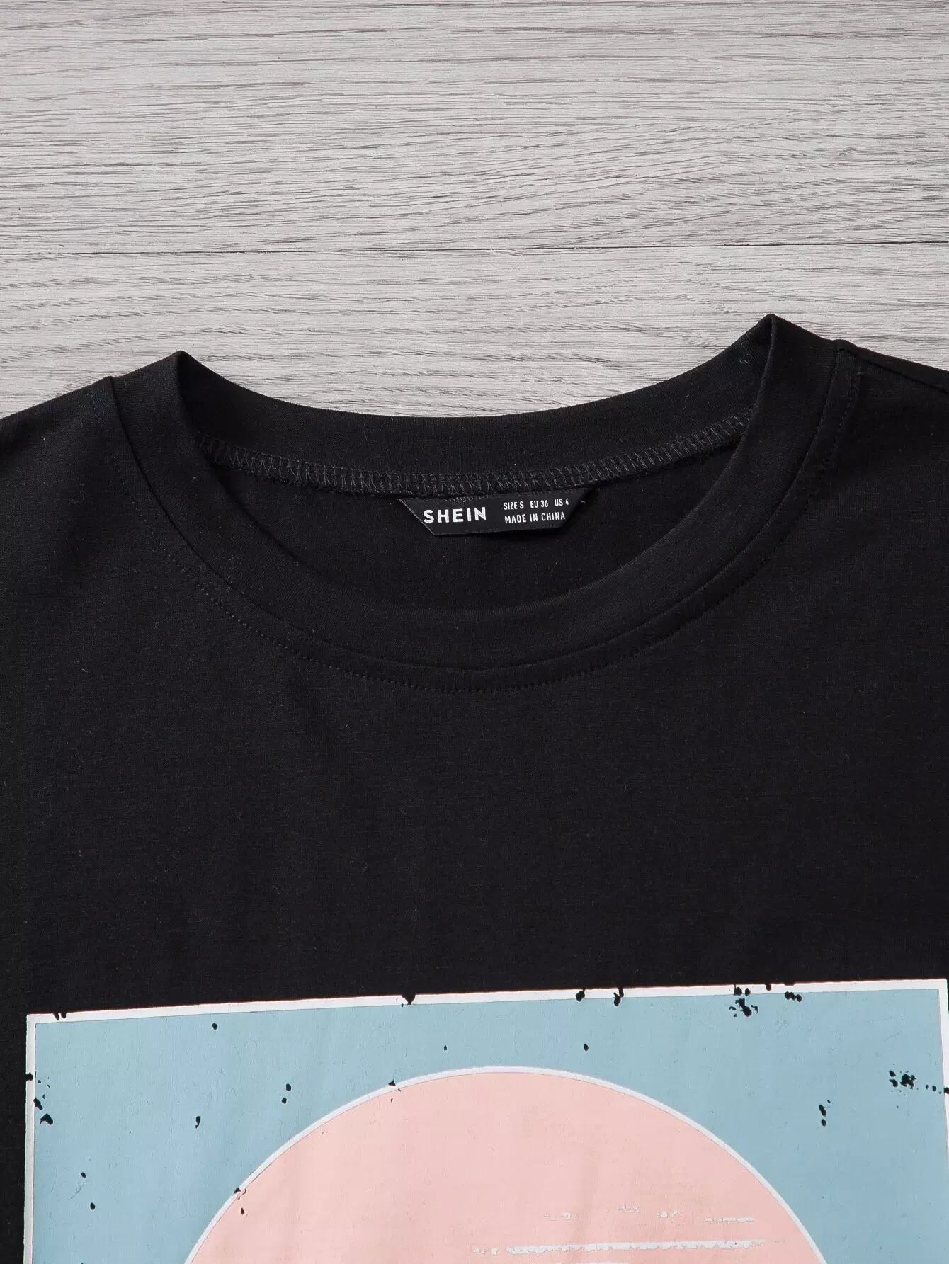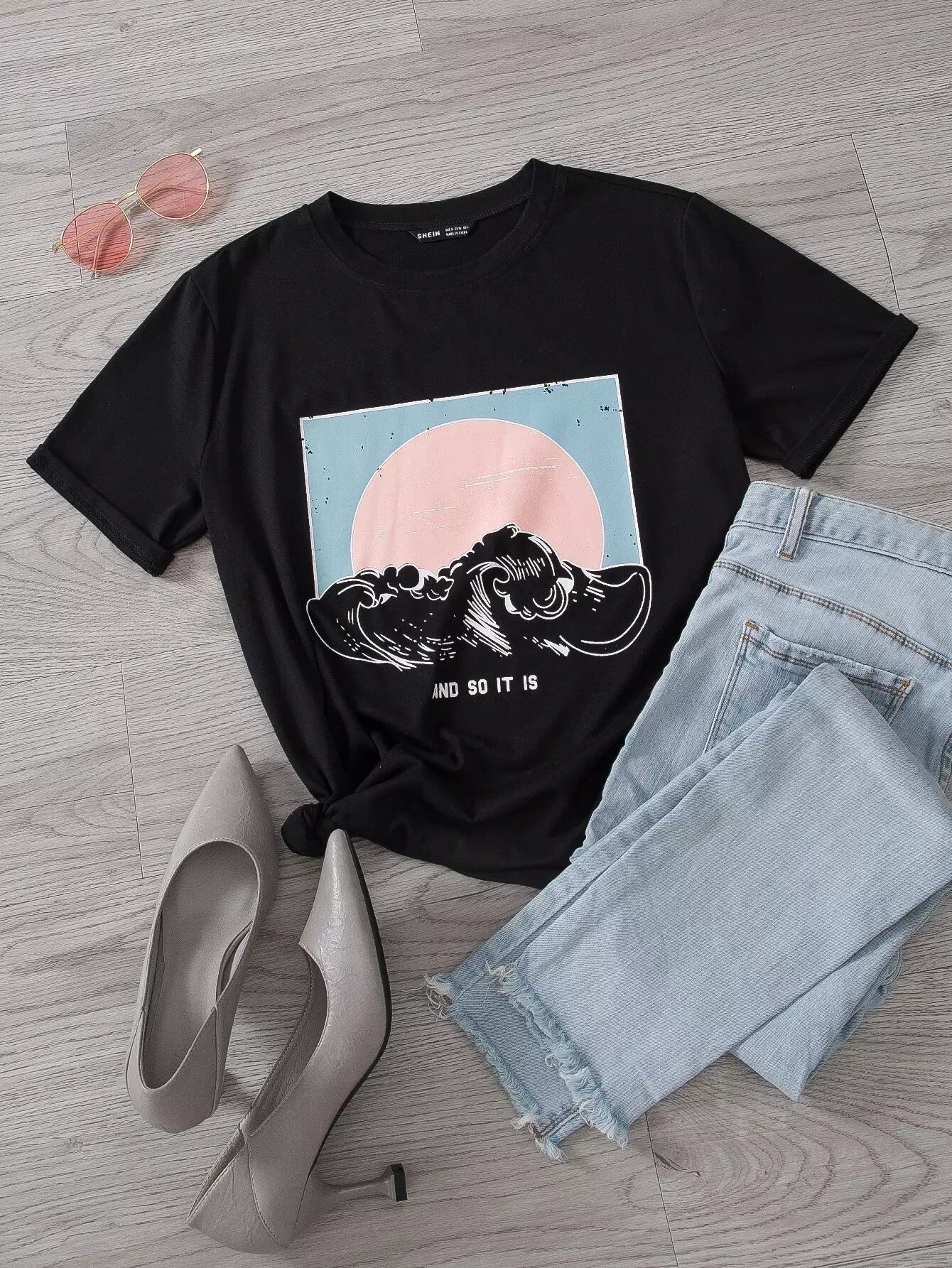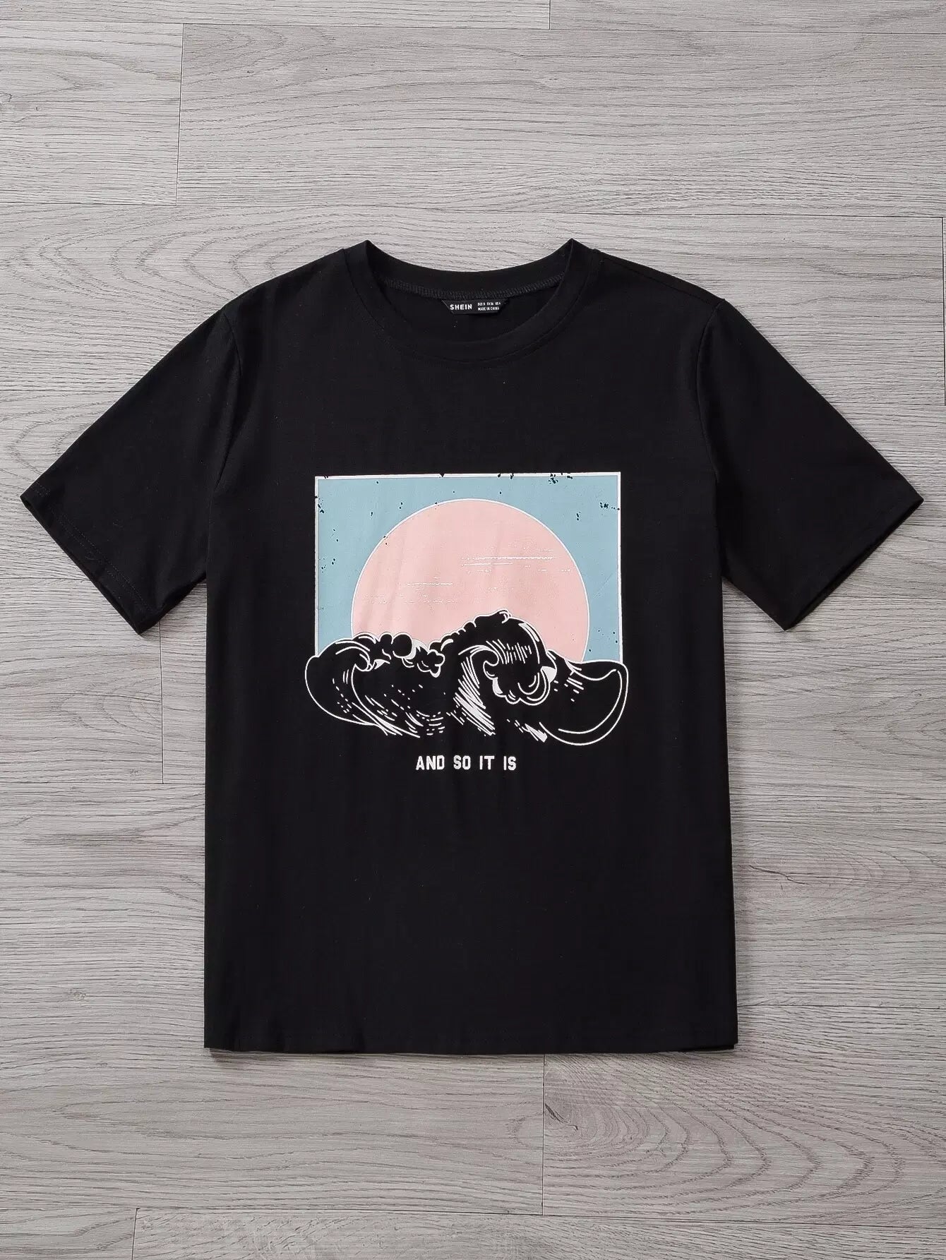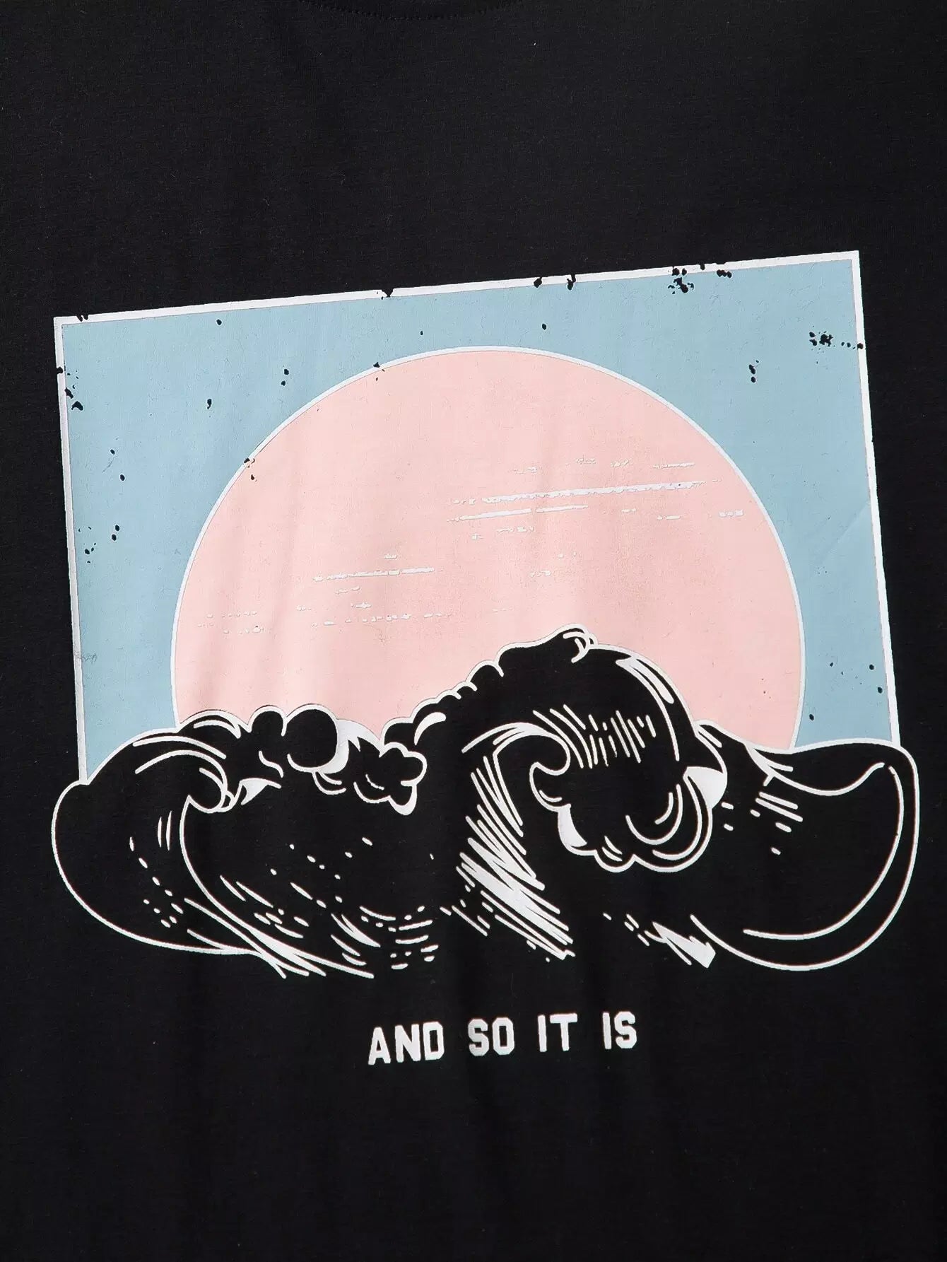 تي شيرت مطبوع عليه شعار وموجة يابانية