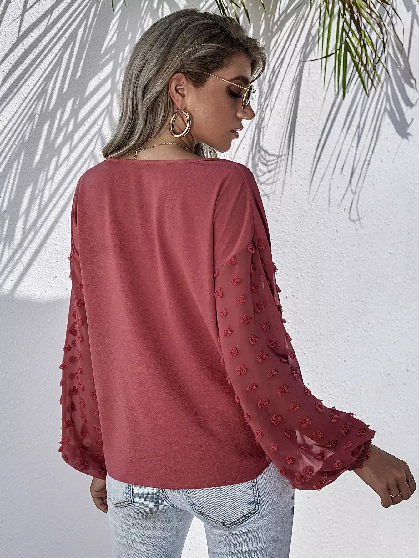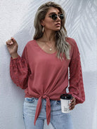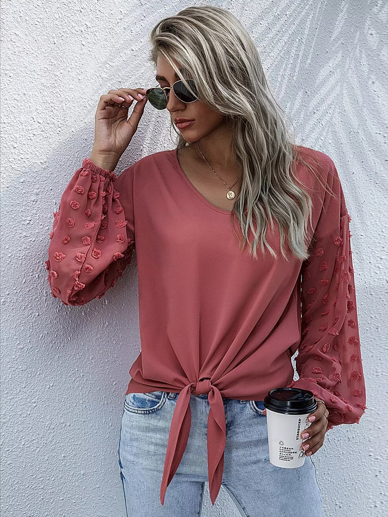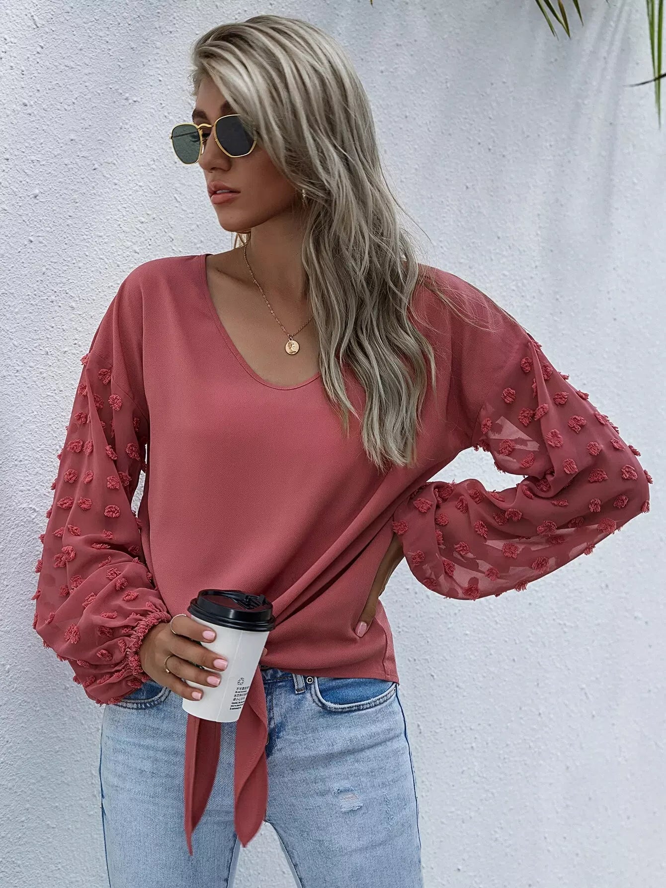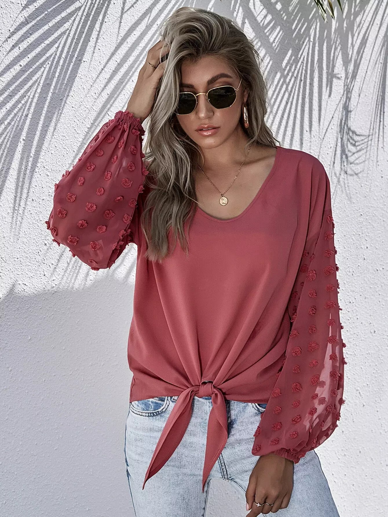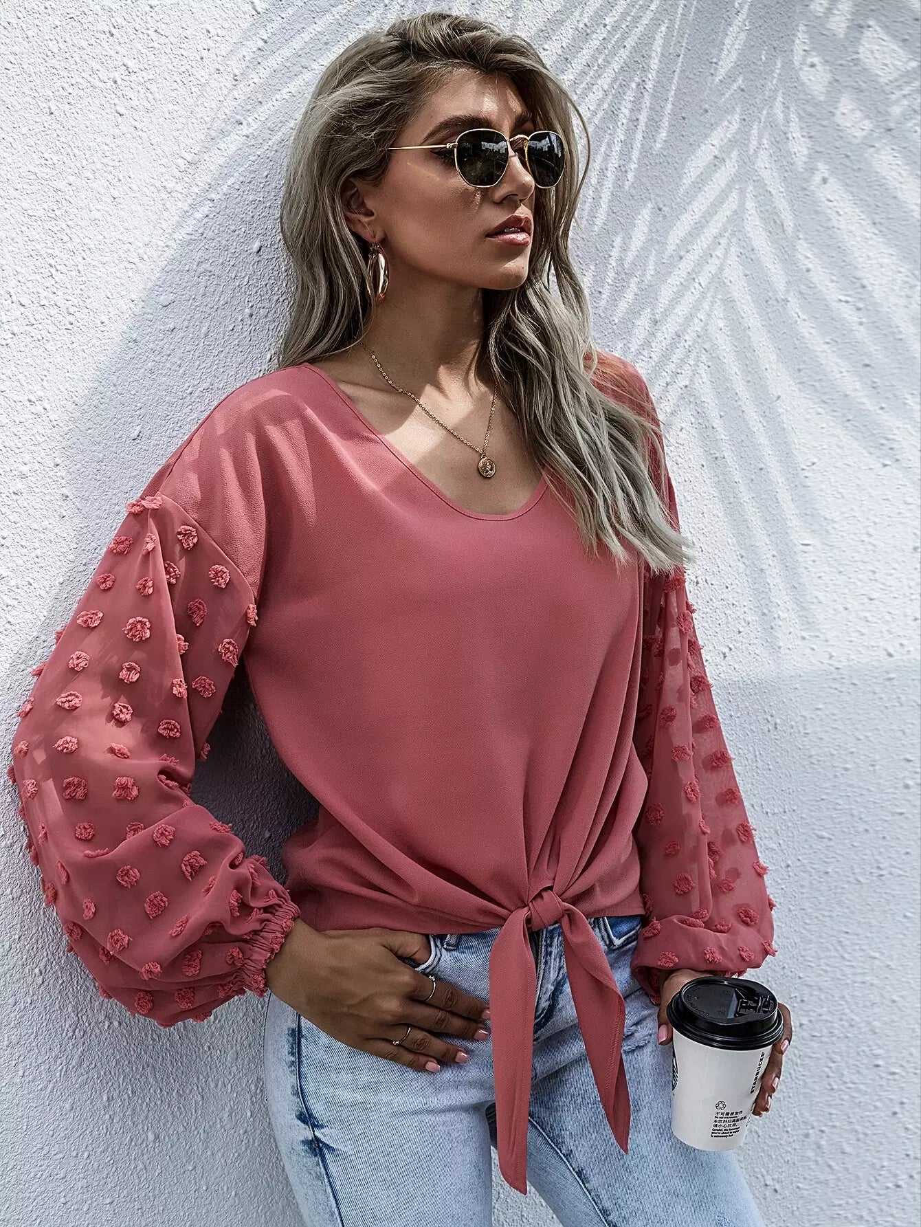 بلوزة ذات أكمام شبكية منقّطة بنقشة شبكية ذات حاشية عقدة بلوزة
