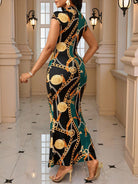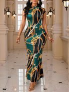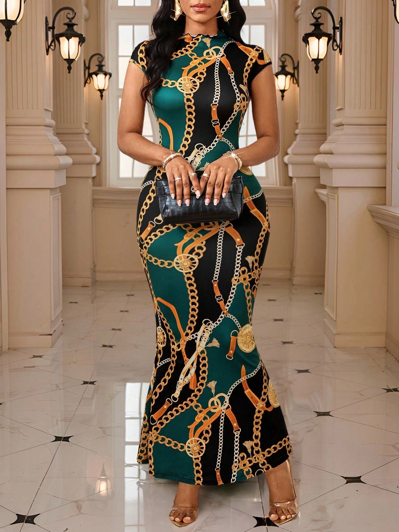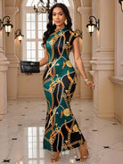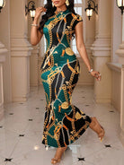 Lady Ladies Chain Print Round Neck Flare Sleeve Fishtail Hem Bodycon Elegant Party Dress