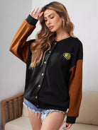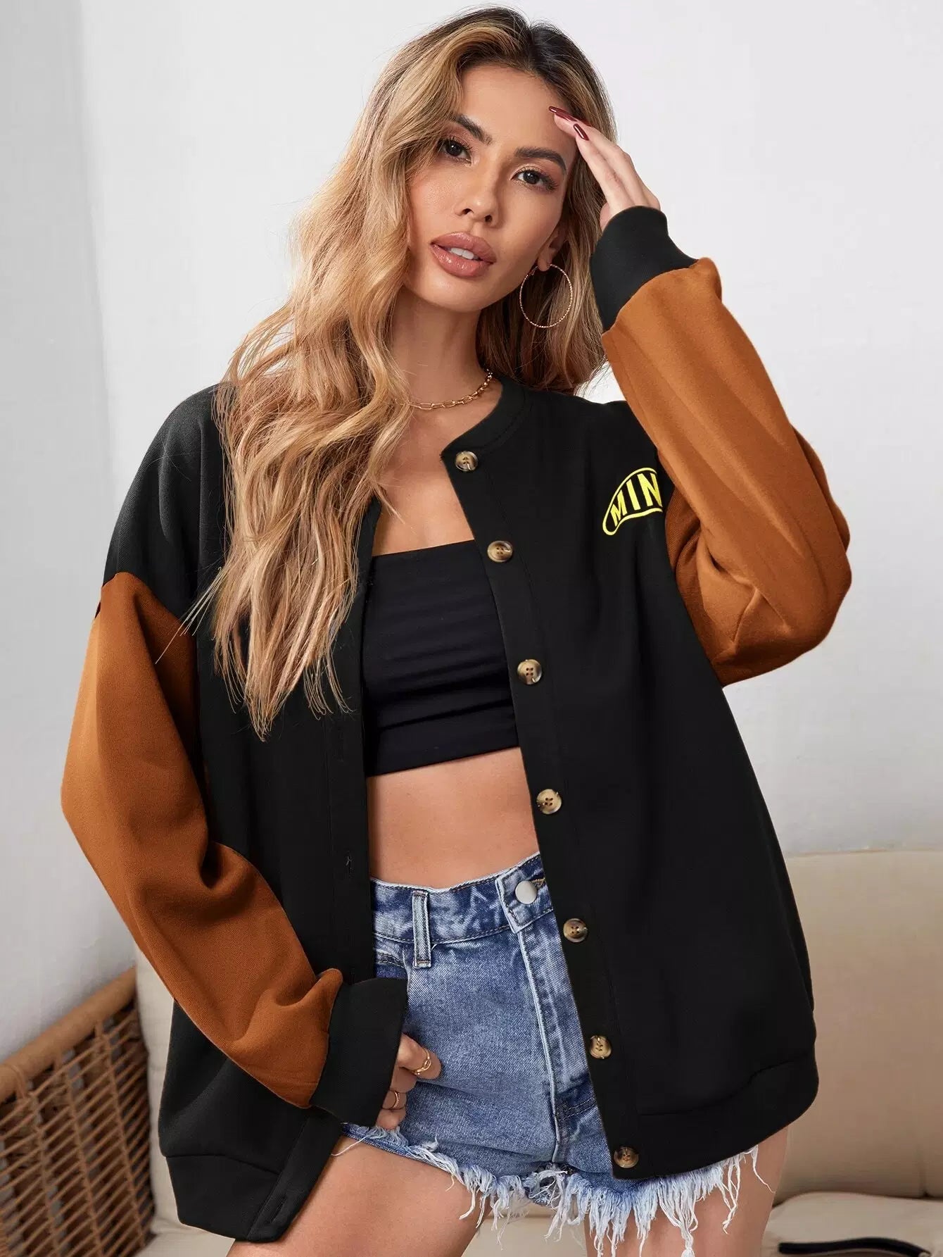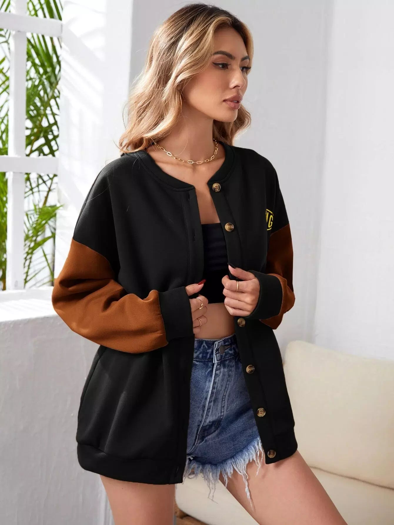 جاكيت جرافيك برسومات حروف ملونة منسدلة على الكتف بأزرار أمامية