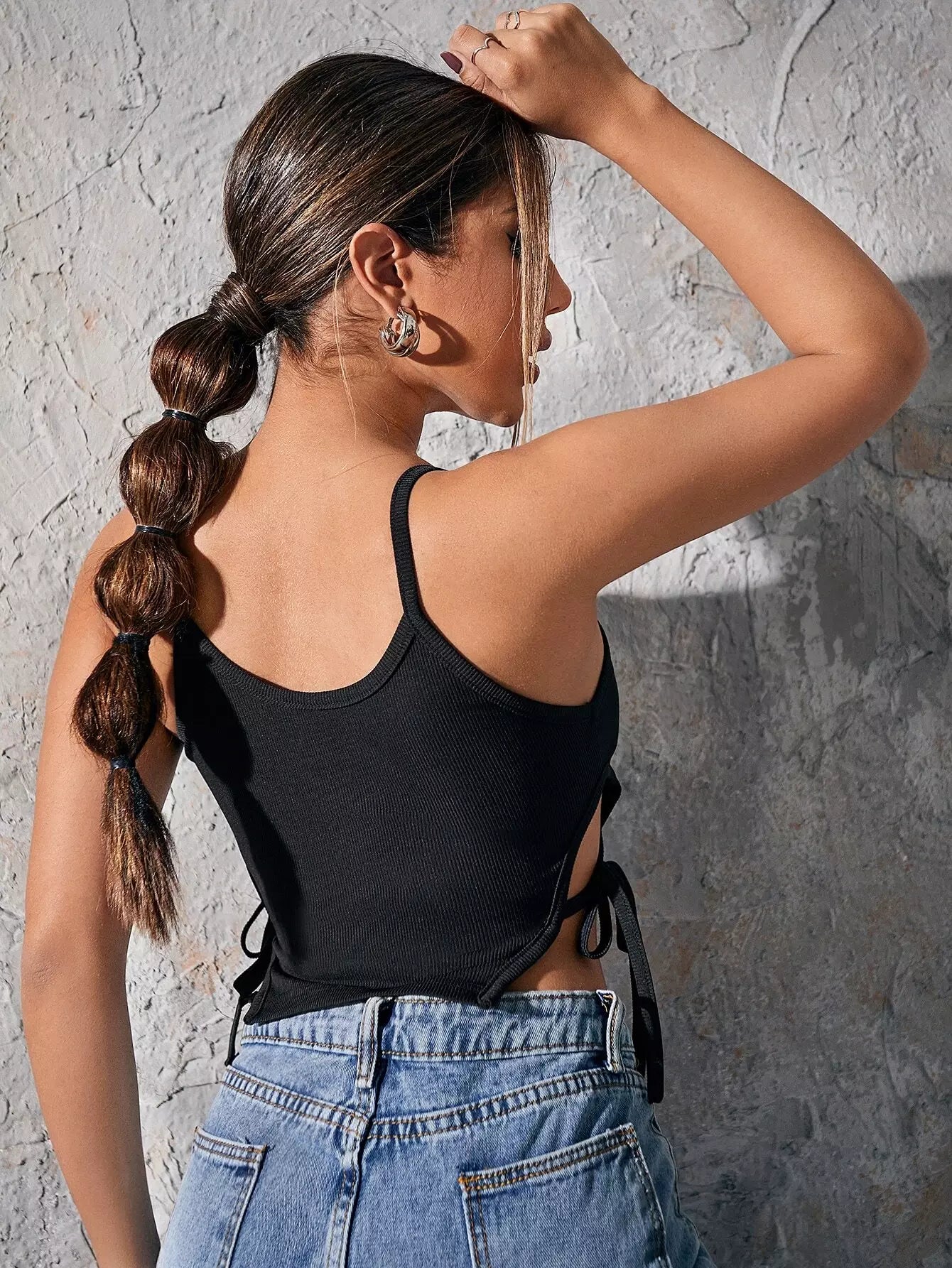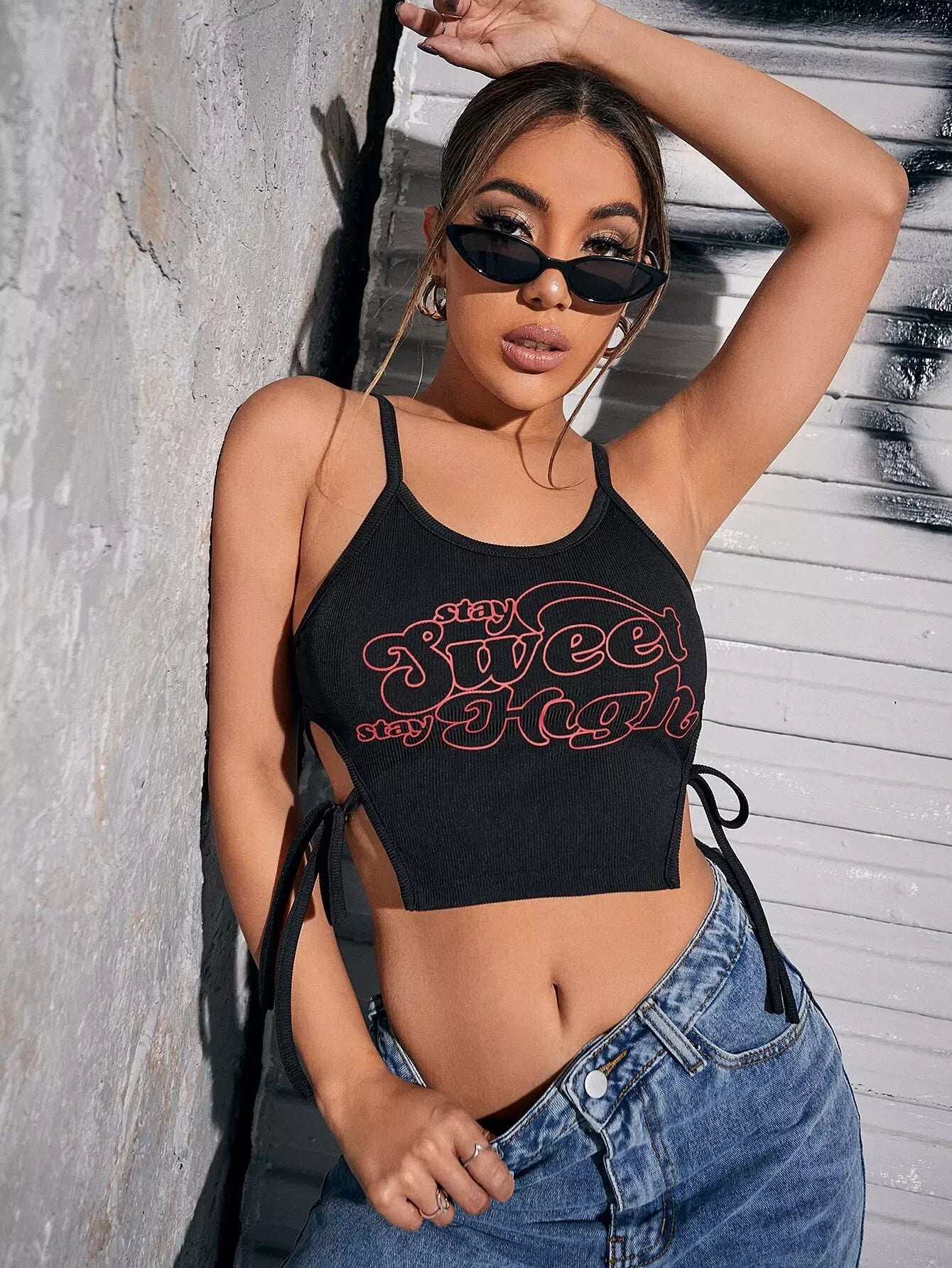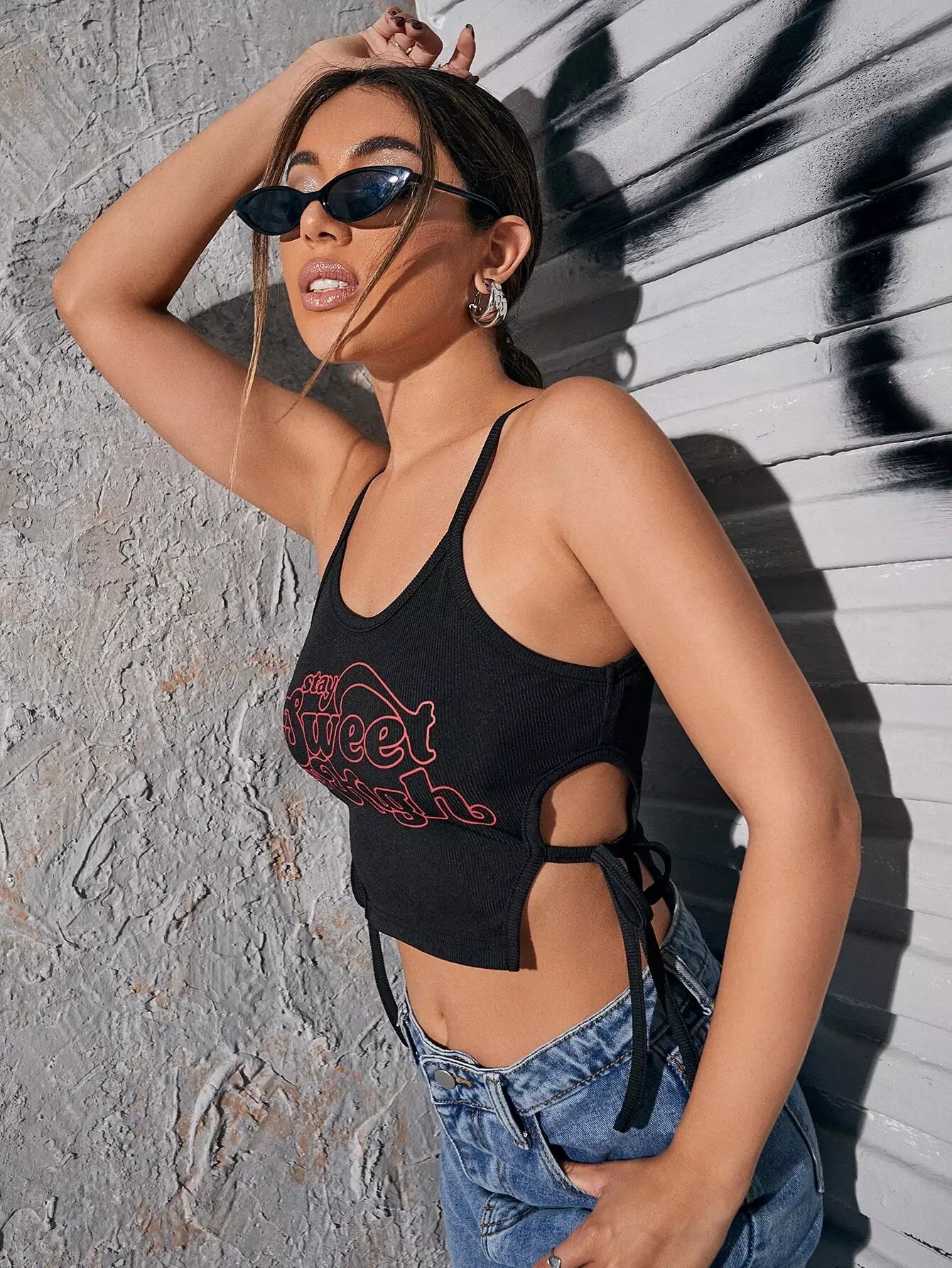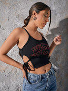 قميص قصير قصير قصير بعقدة جانبية بنقشة رسومات حرفية