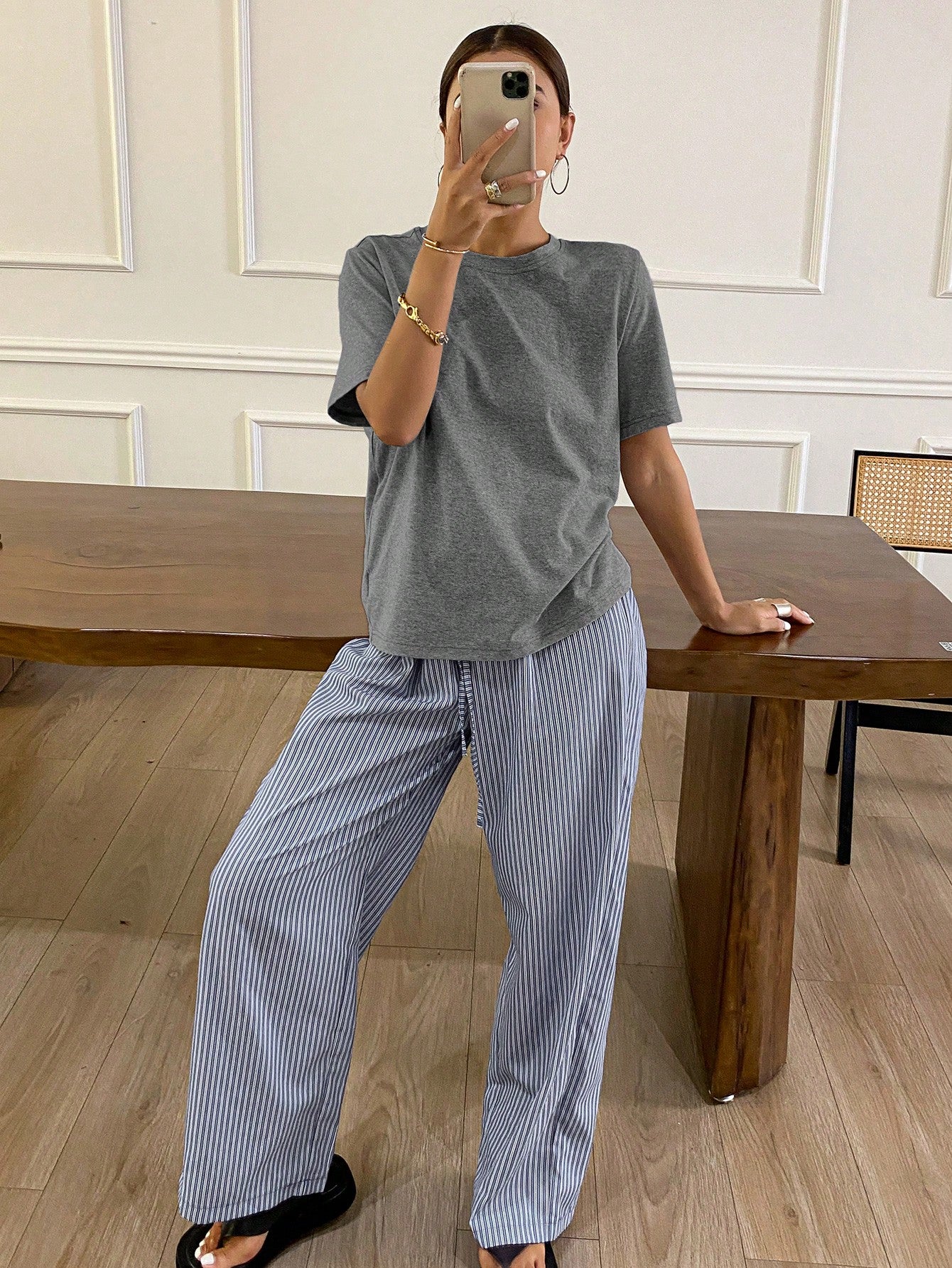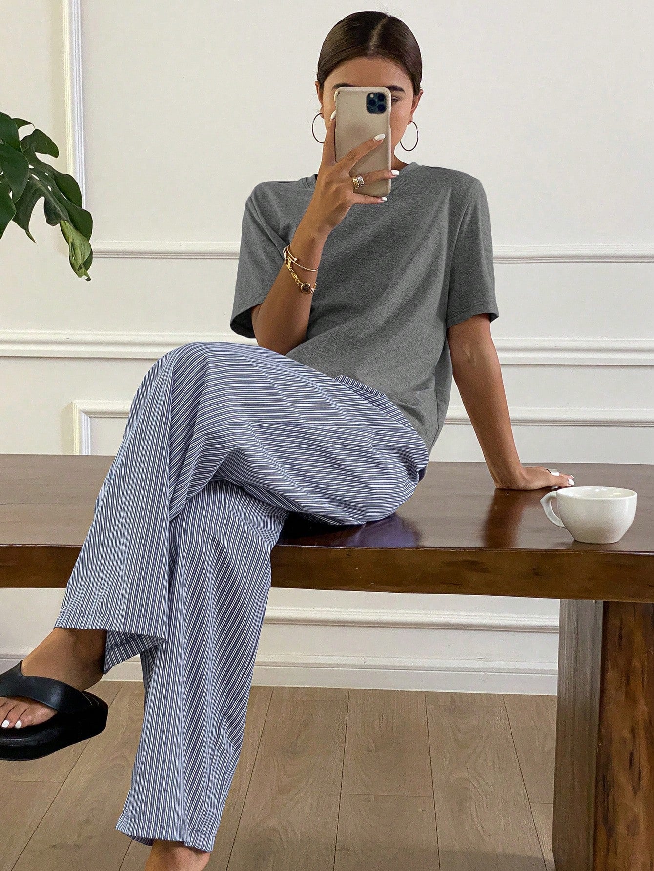 women Livesso Minimalist T-Shirt And Striped Pajama Pants Loungewear Set