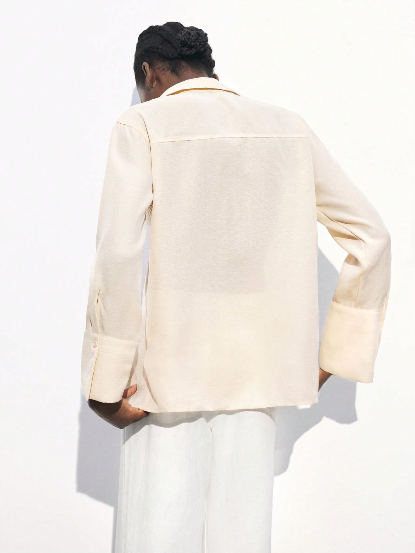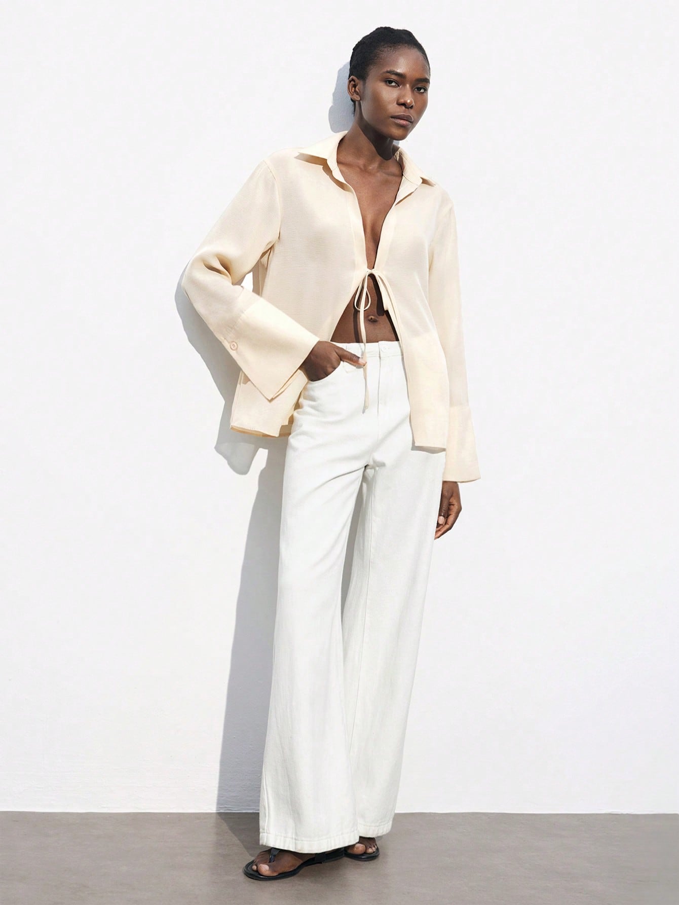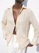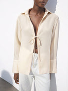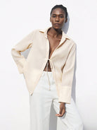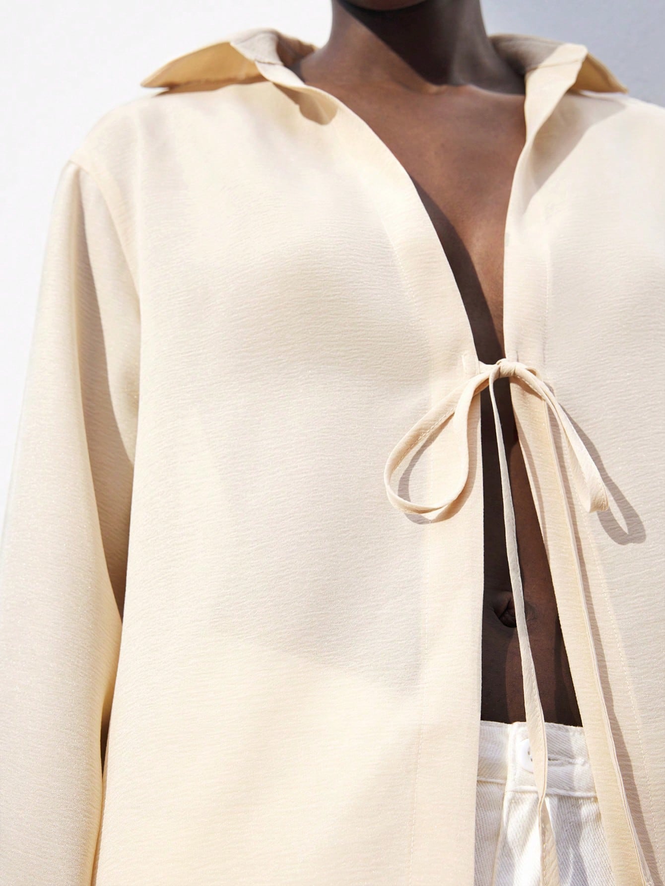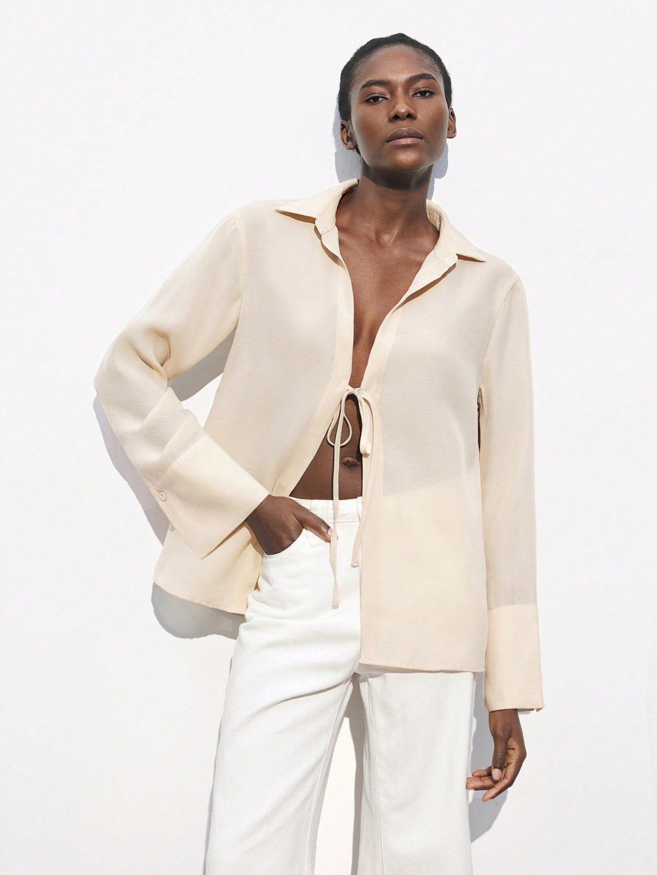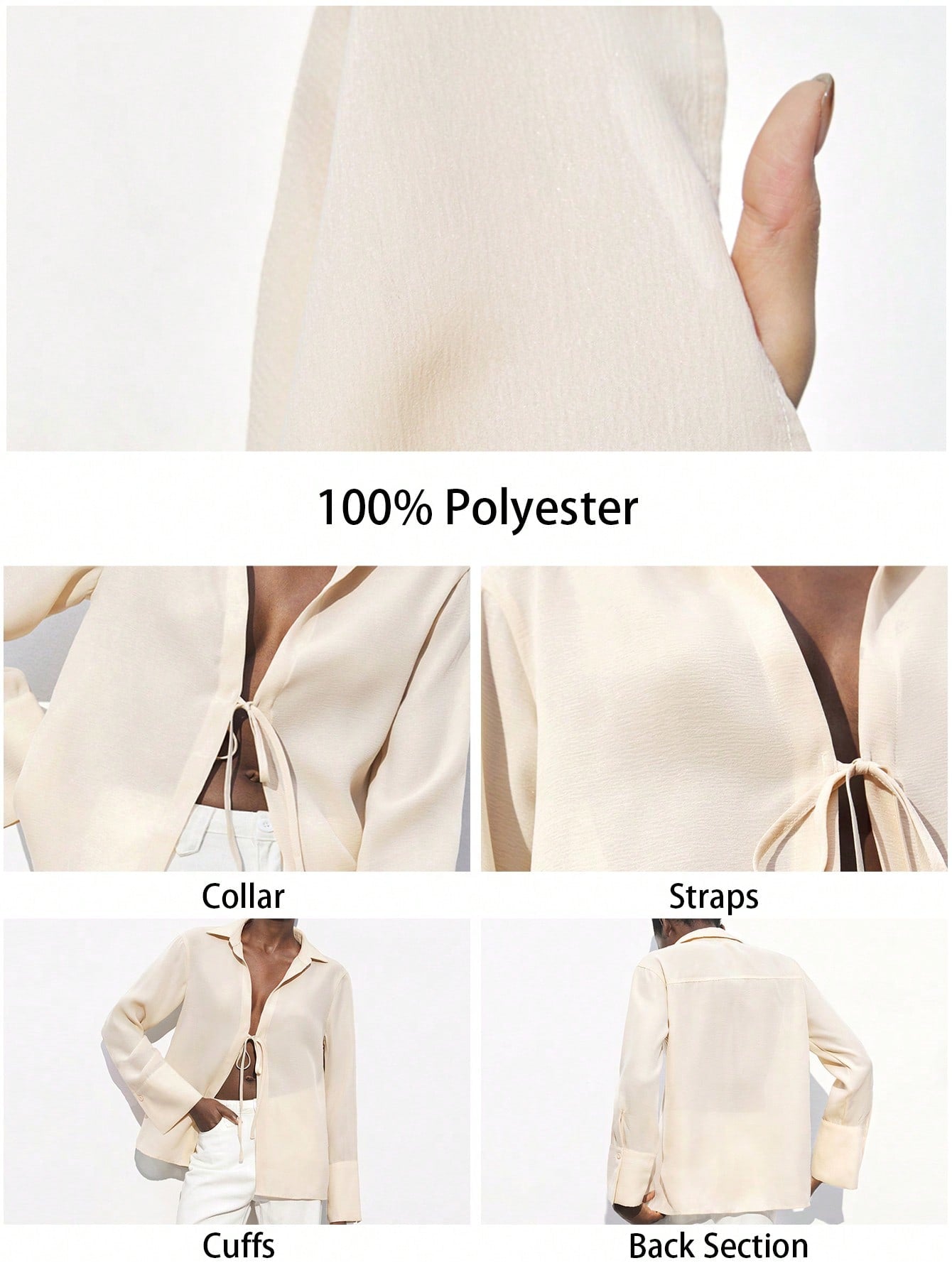 Maija Women Apricot Solid Color Spring Shirt, Loose Fit Casual Tie-Front Long Sleeve Versatile Blouse