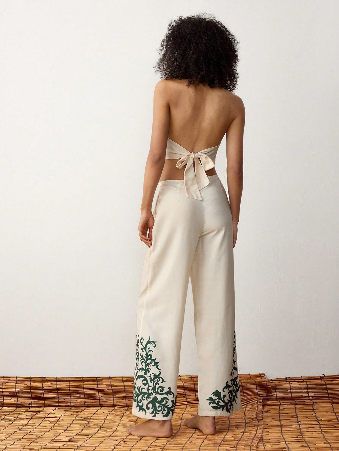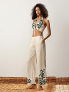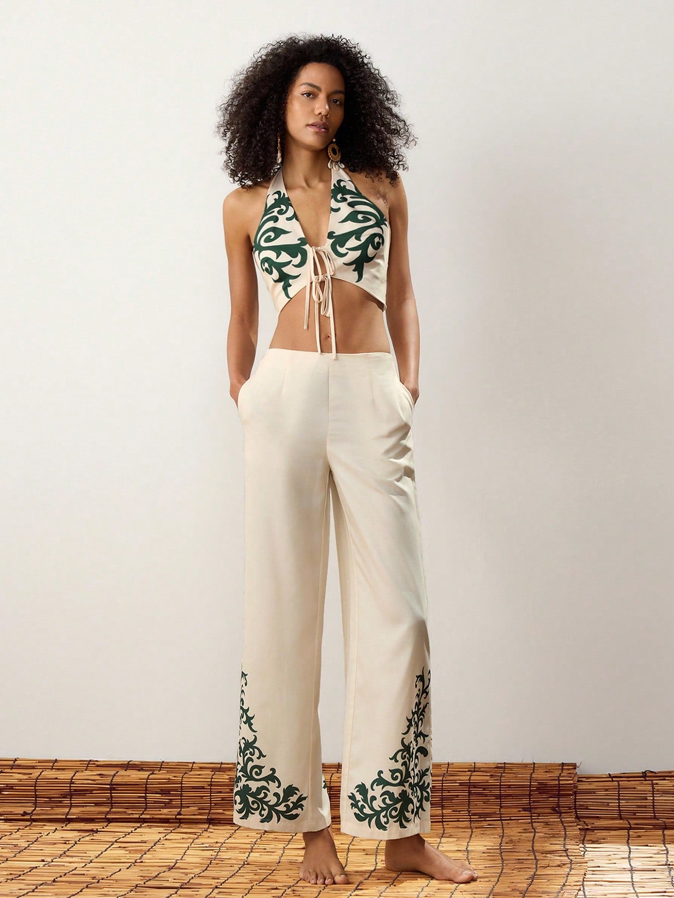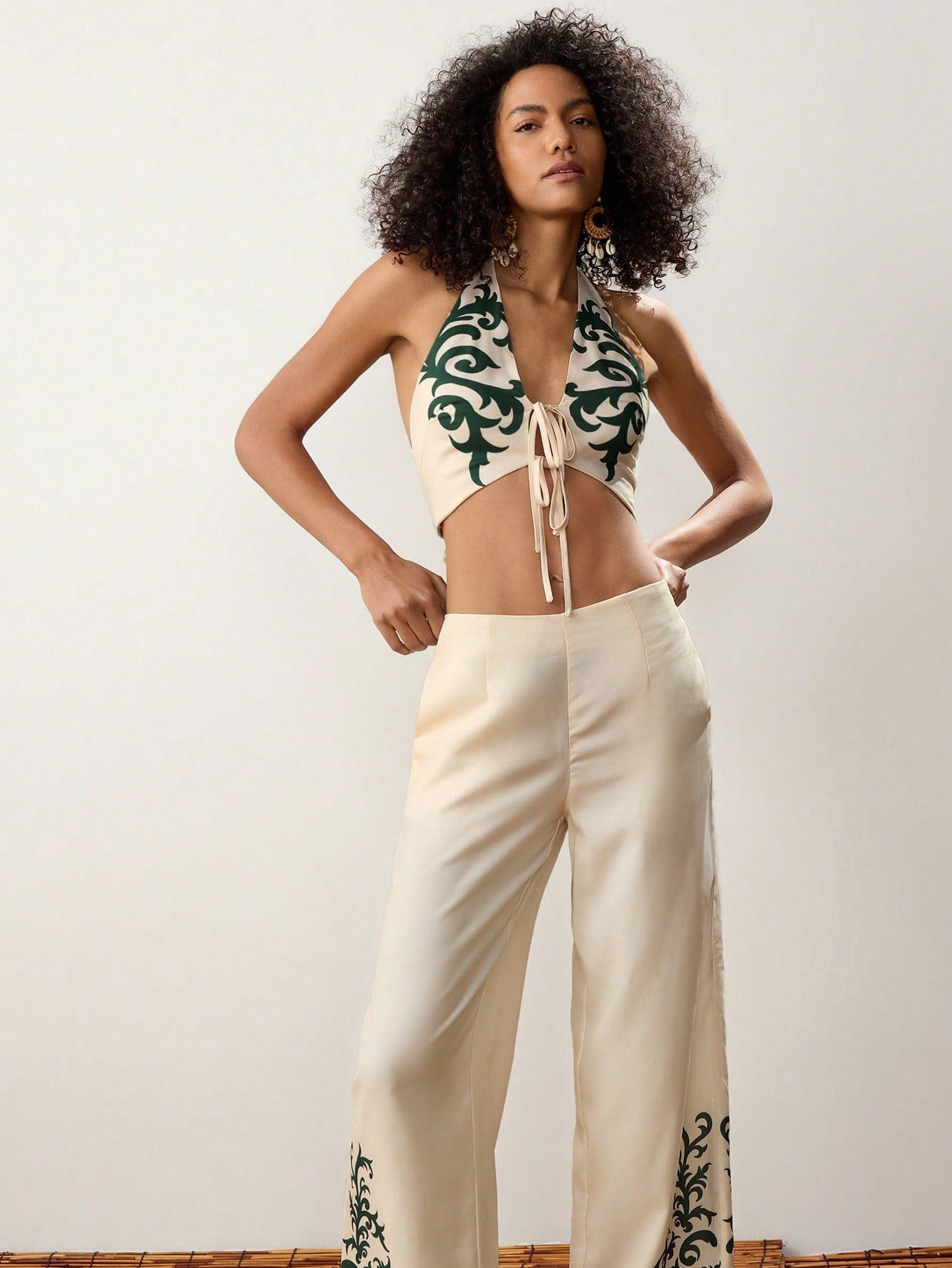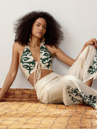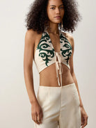 Maija Women's Apricot And Green Color-Block Pattern Print Halter Neck Backless Crop Top With Tie Front