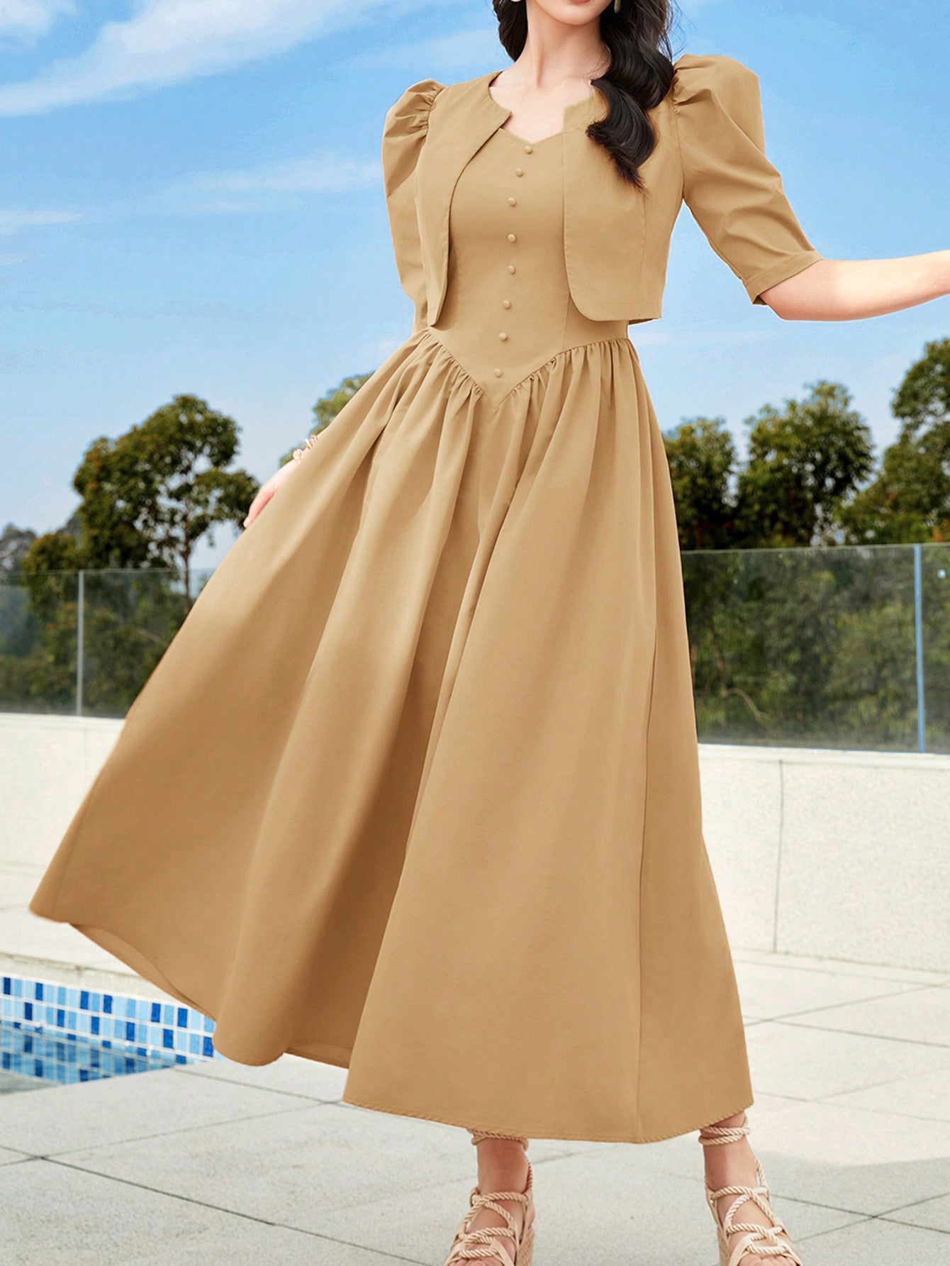 Mulvari Women's Solid Color Puff Sleeve Cardigan And Sleeveless V-Neck Dress, 2pcs Casual Summer Outfit