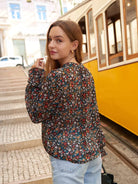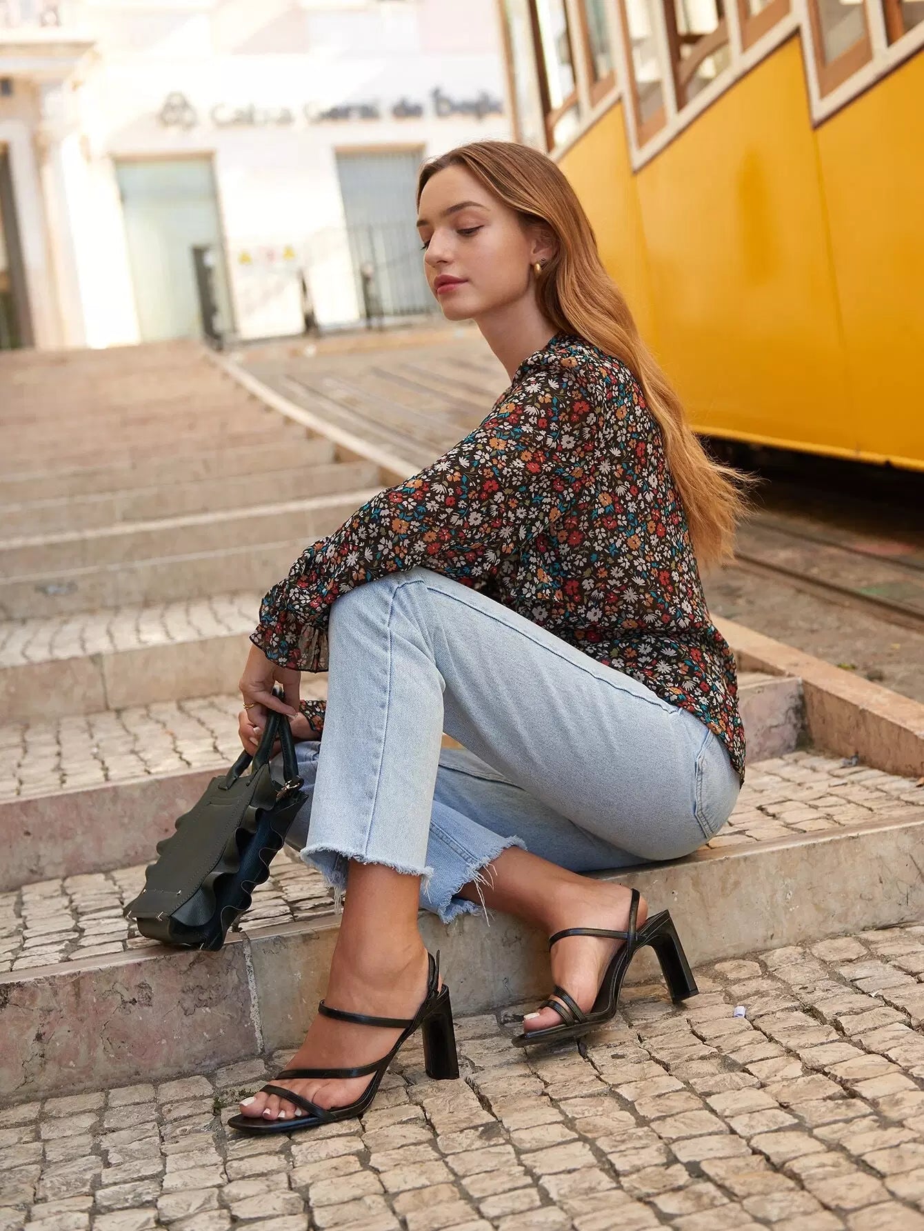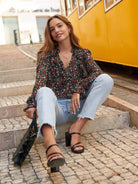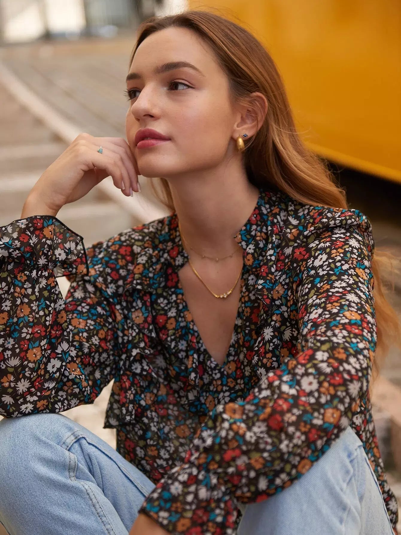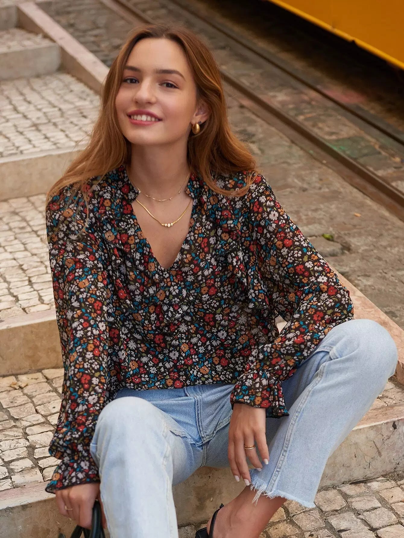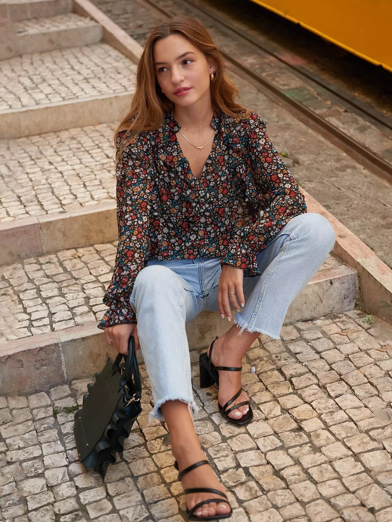 بلوزة برقبة بفتحة عنق مزينة بالورود