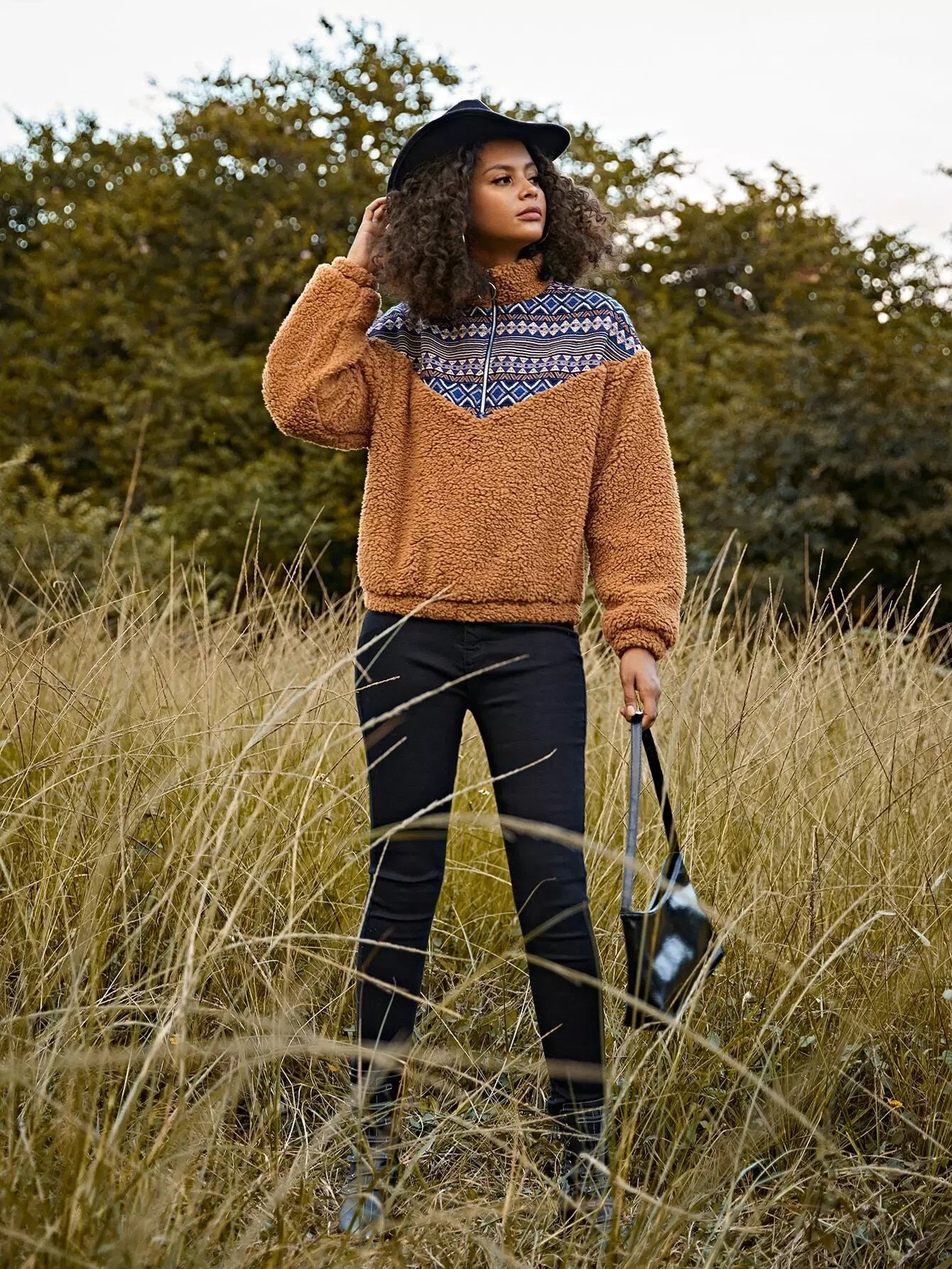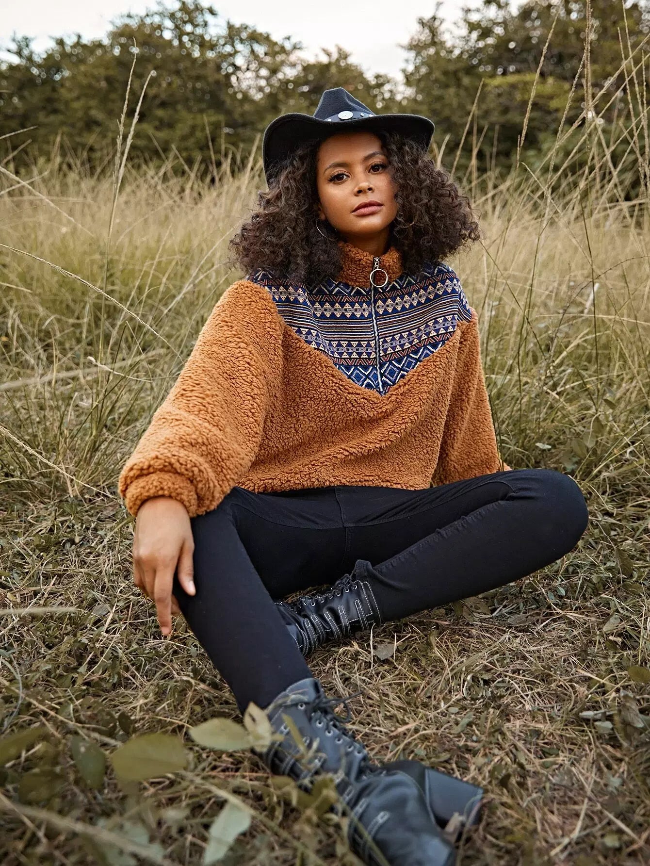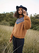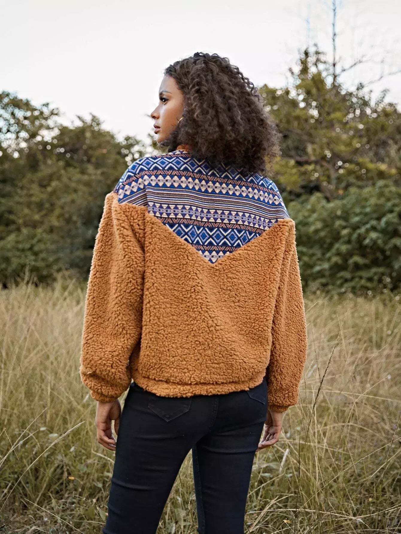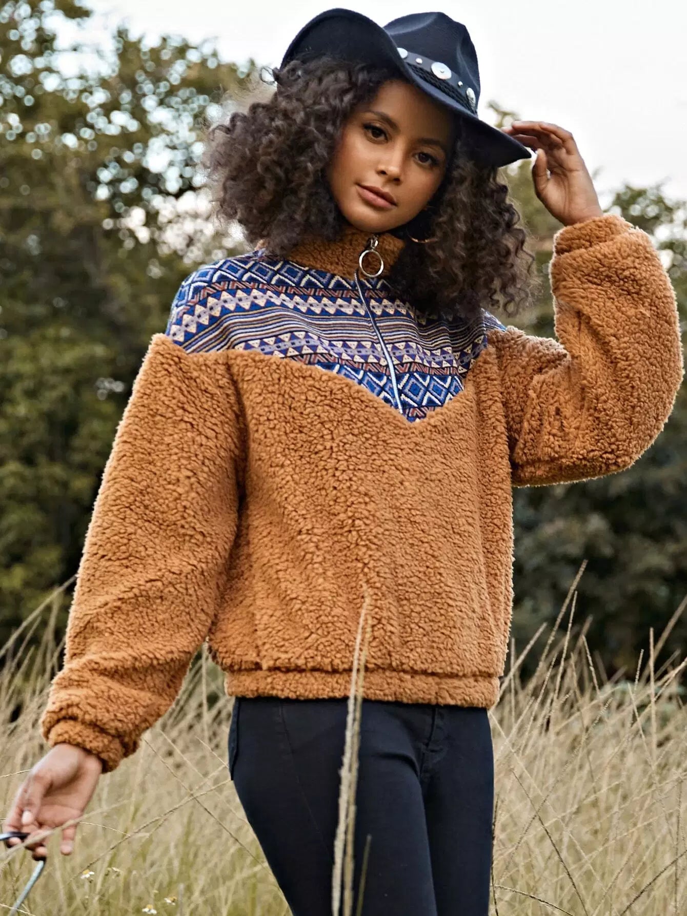 سويت شيرت بطبعة هندسية وسحّاب على شكل حلقة دائرية ونقشة شيفرون