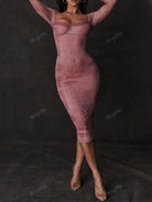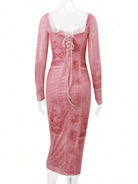 Pink Dresses For Woman,Sexy Lace Patchwork Criss-Cross Hem Bodycon Long Sleeve Dress