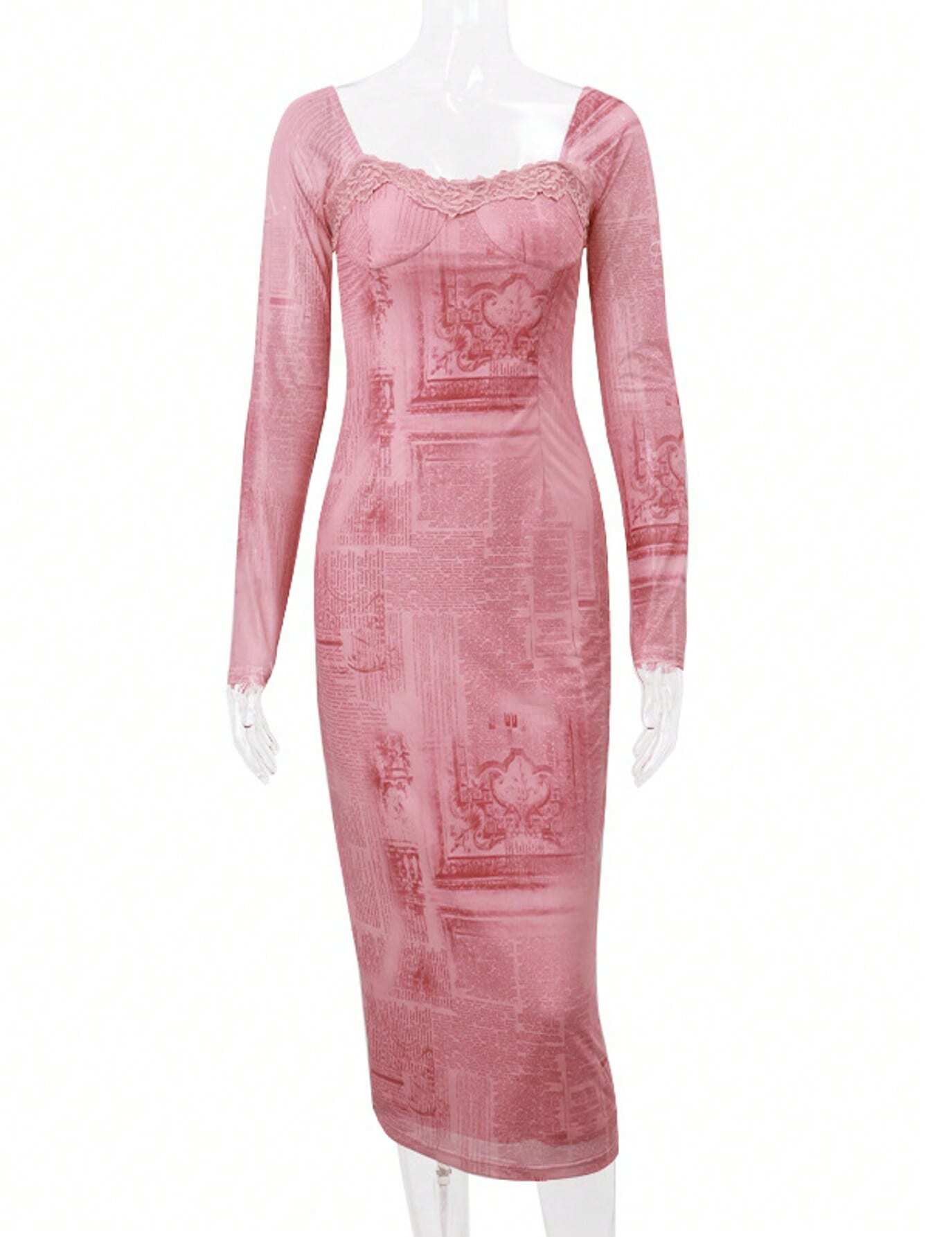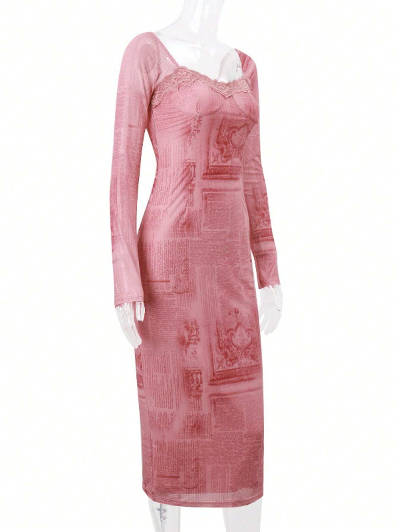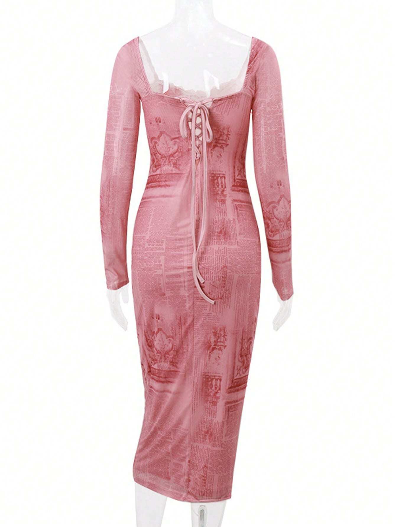 فساتين وردية للنساء، فستان ضيق بأكمام طويلة وحواف متقاطعة من الدانتيل المثير