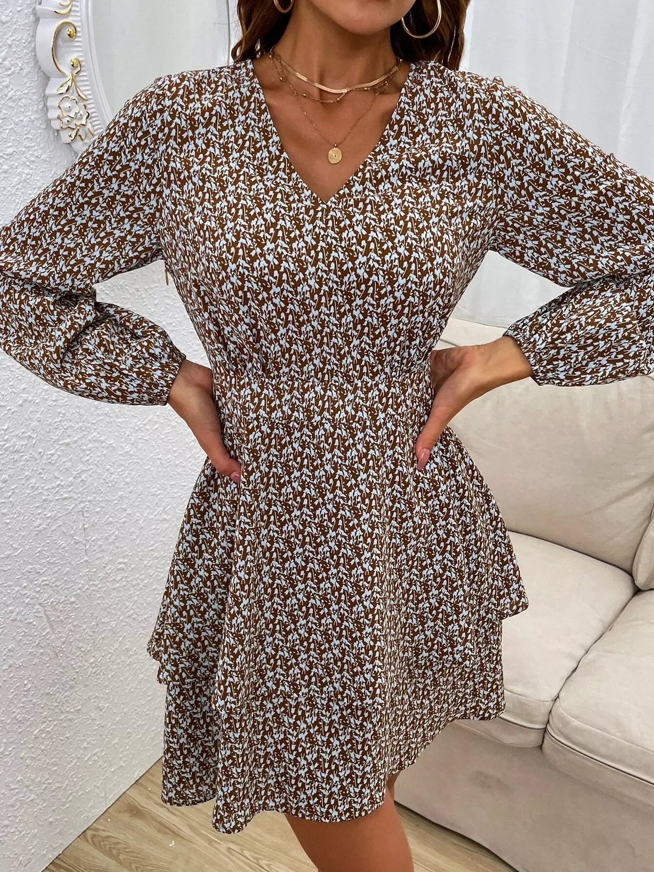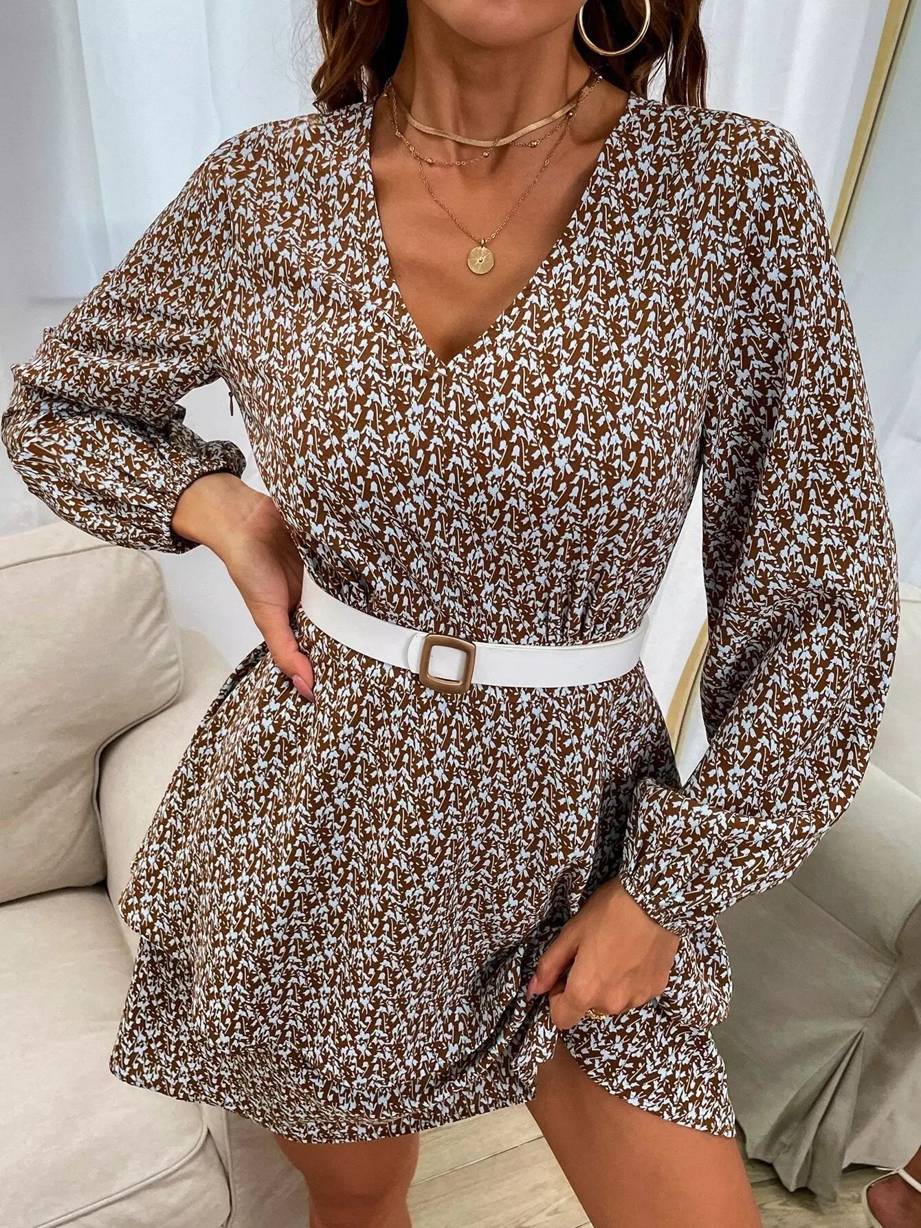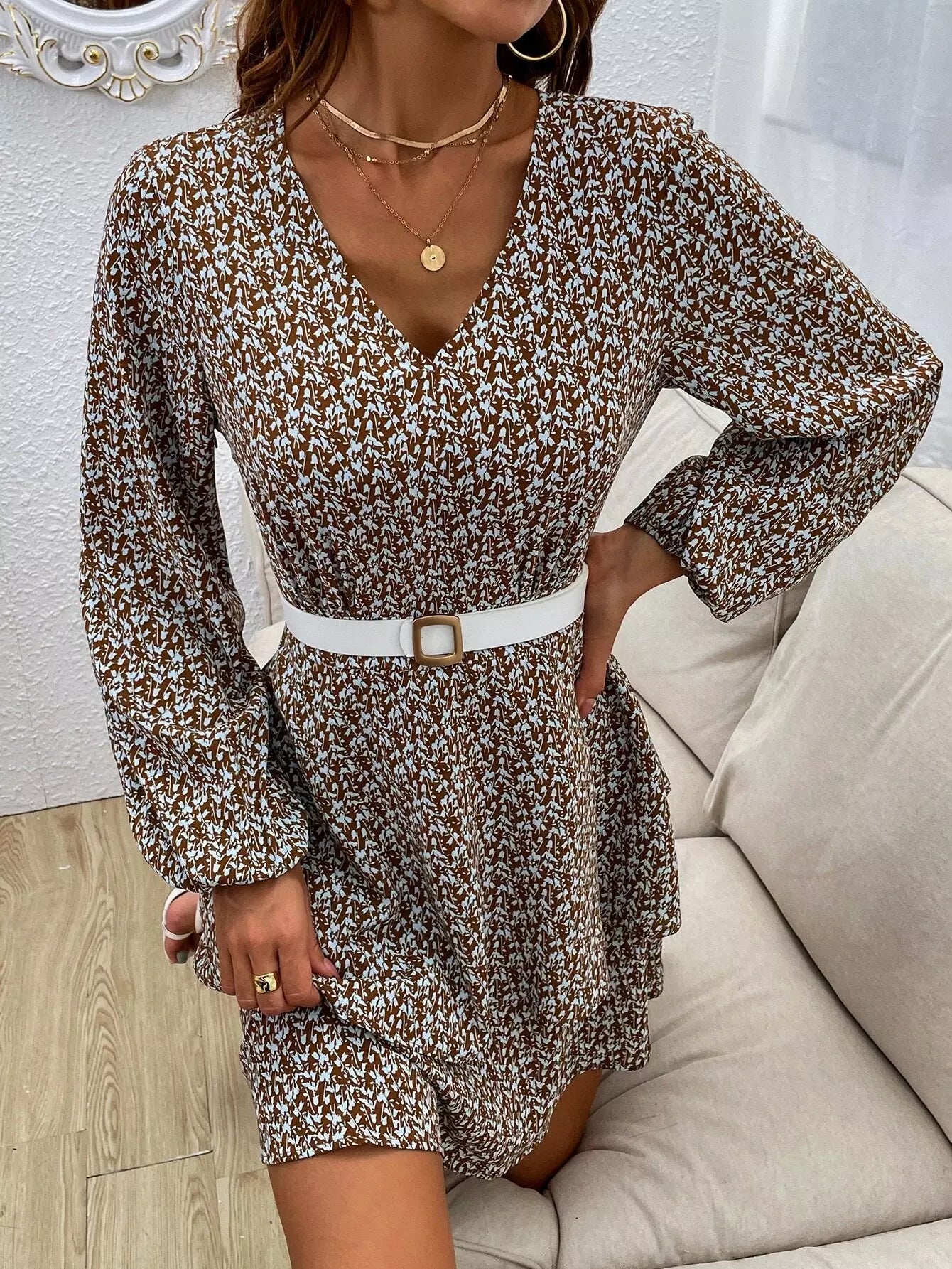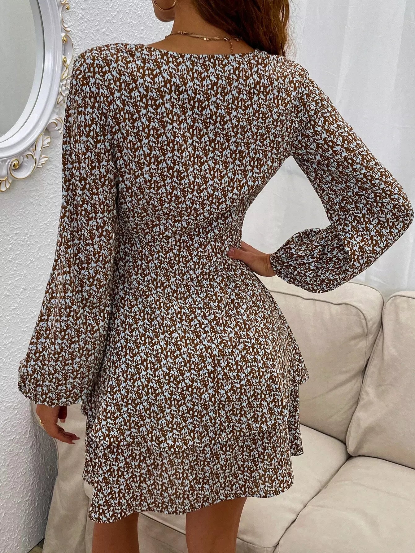 فستان بأكمام فانوس وطبعات نباتية بدون حزام