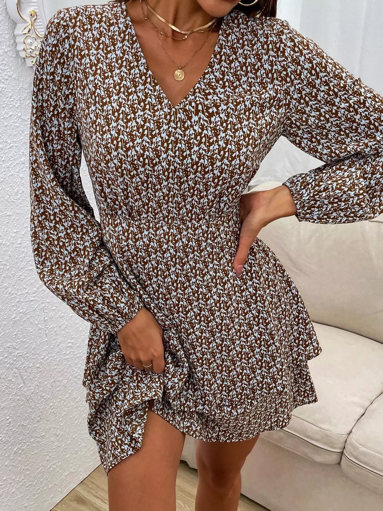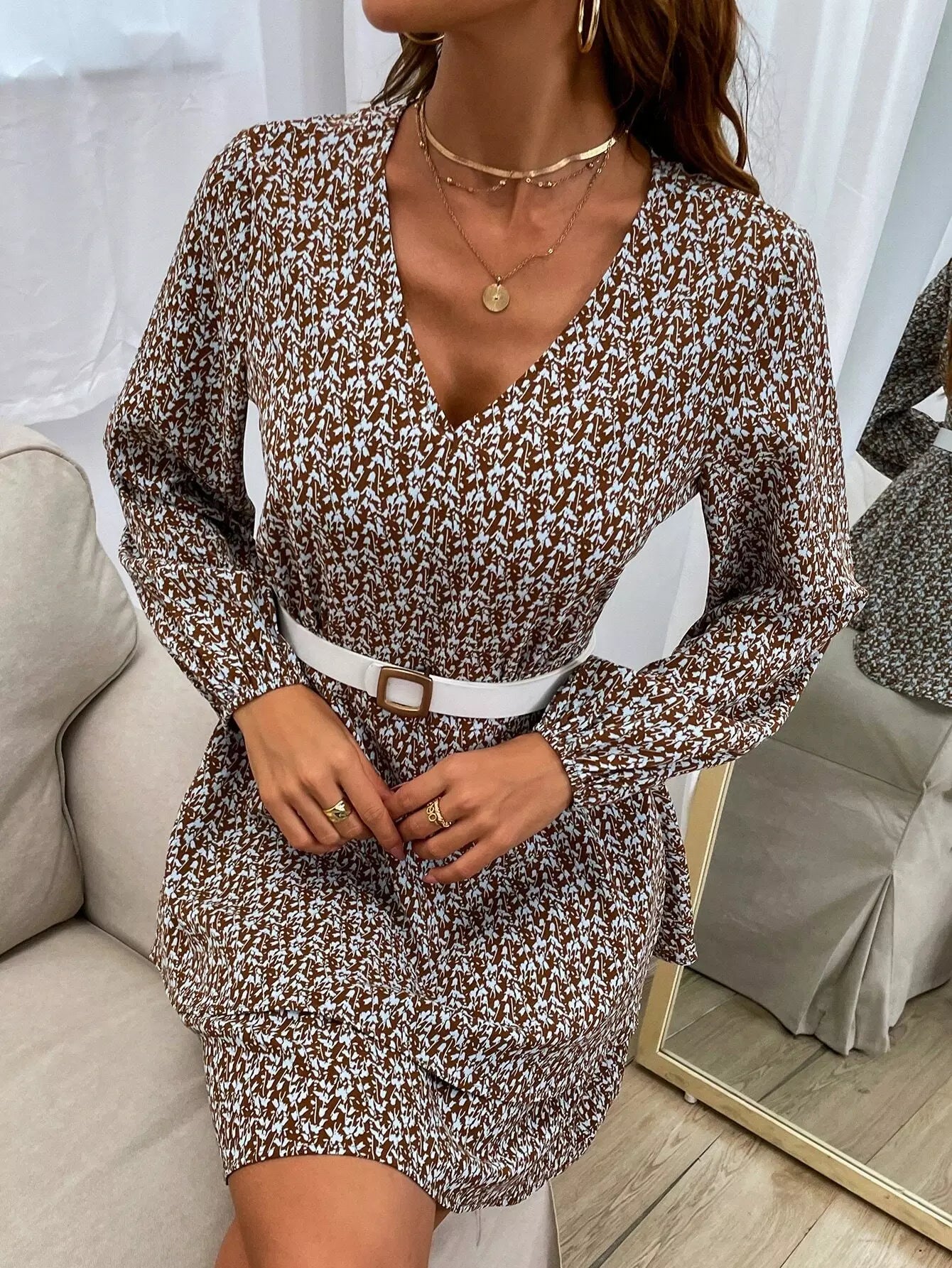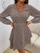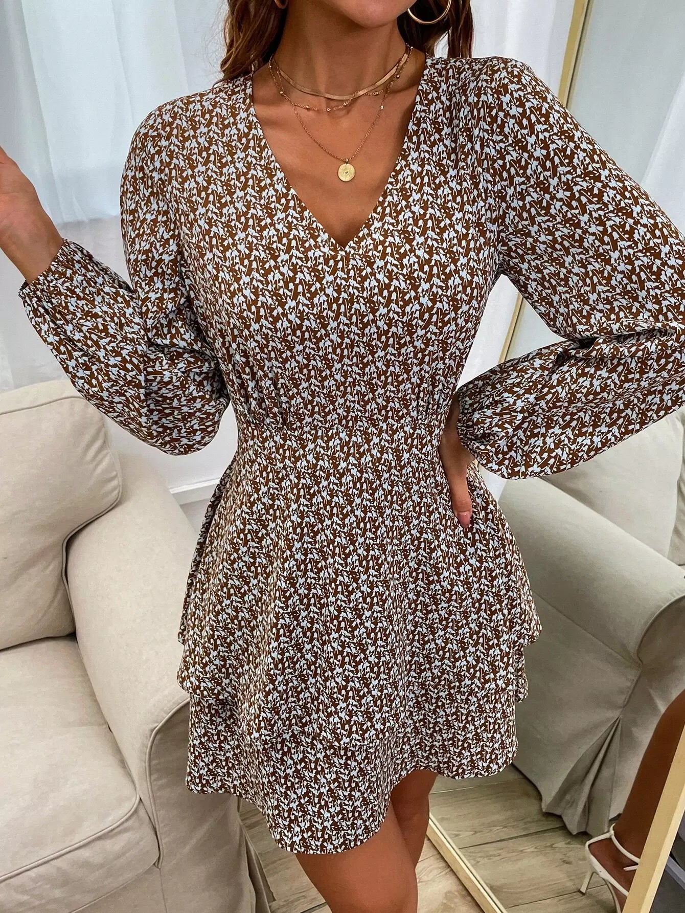 فستان بأكمام فانوس وطبعات نباتية بدون حزام