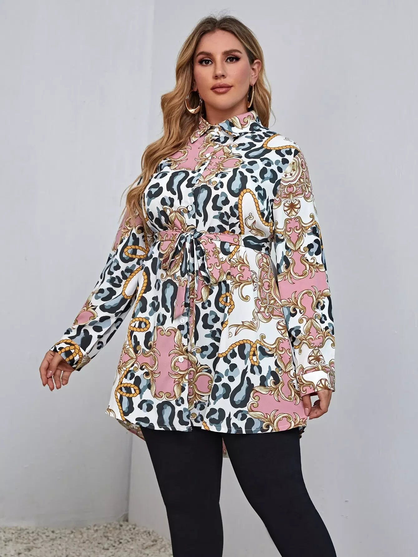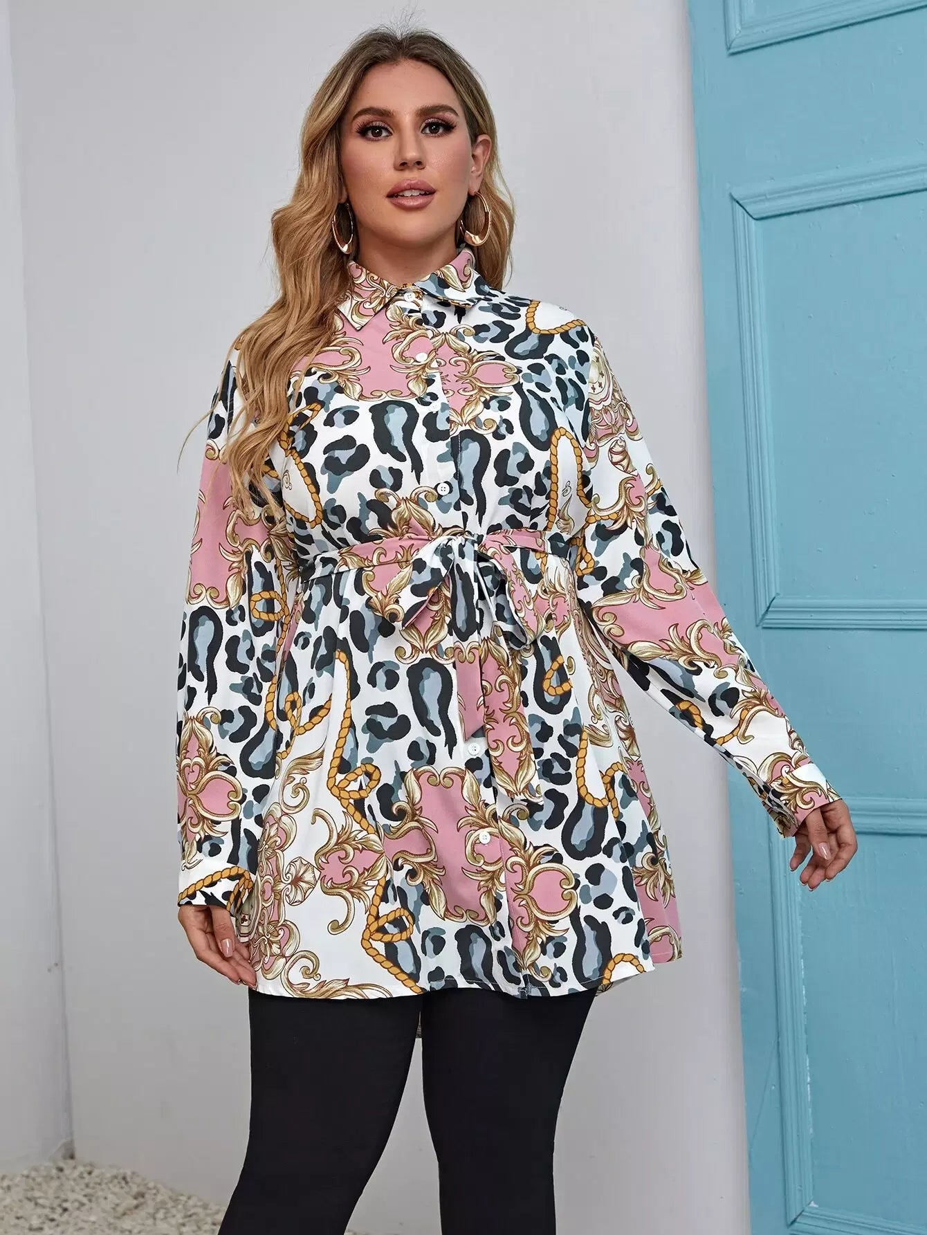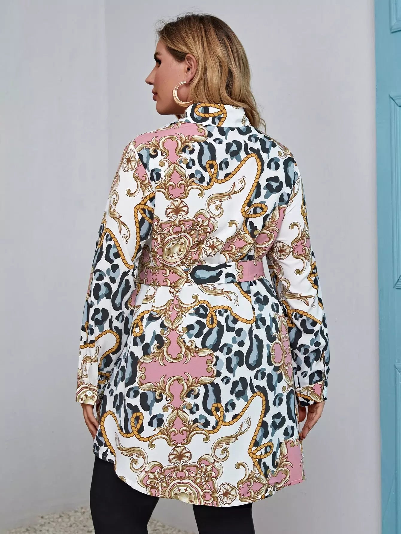 بالإضافة إلى بلوزة بطبعات جرافيك باروكية بدون حزام