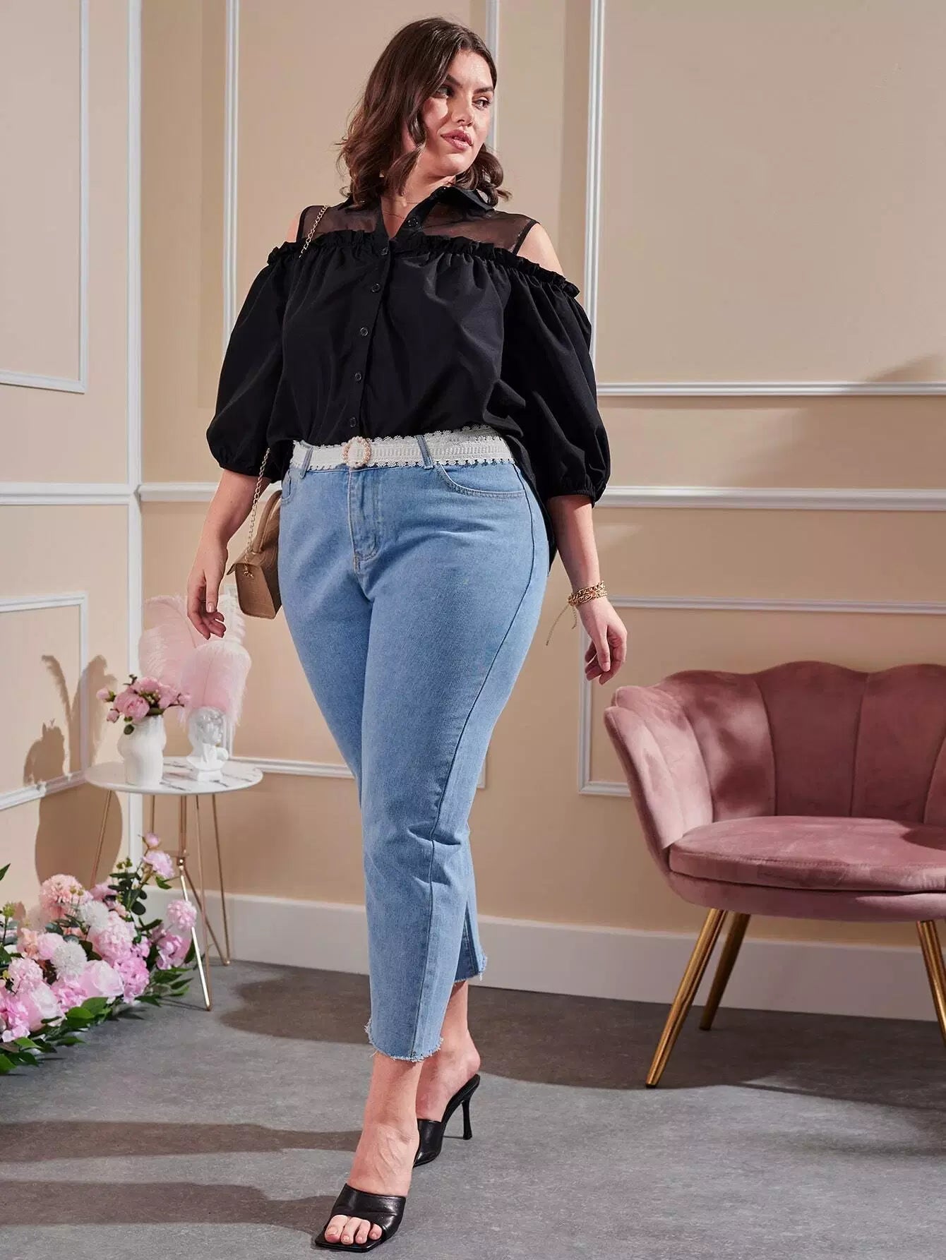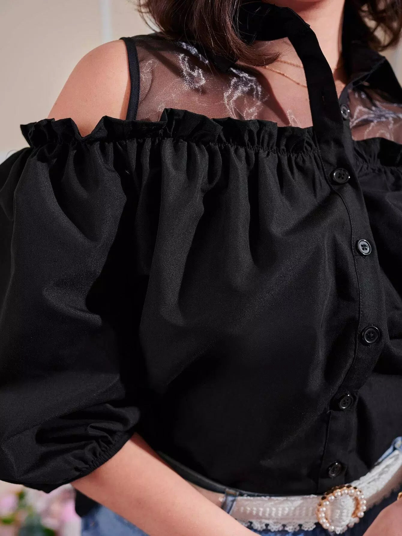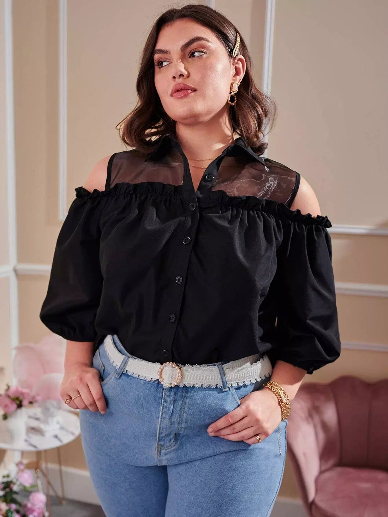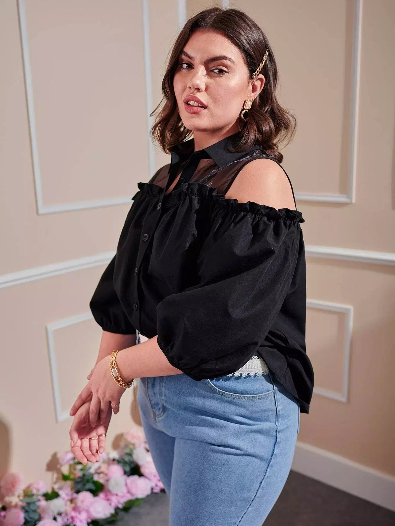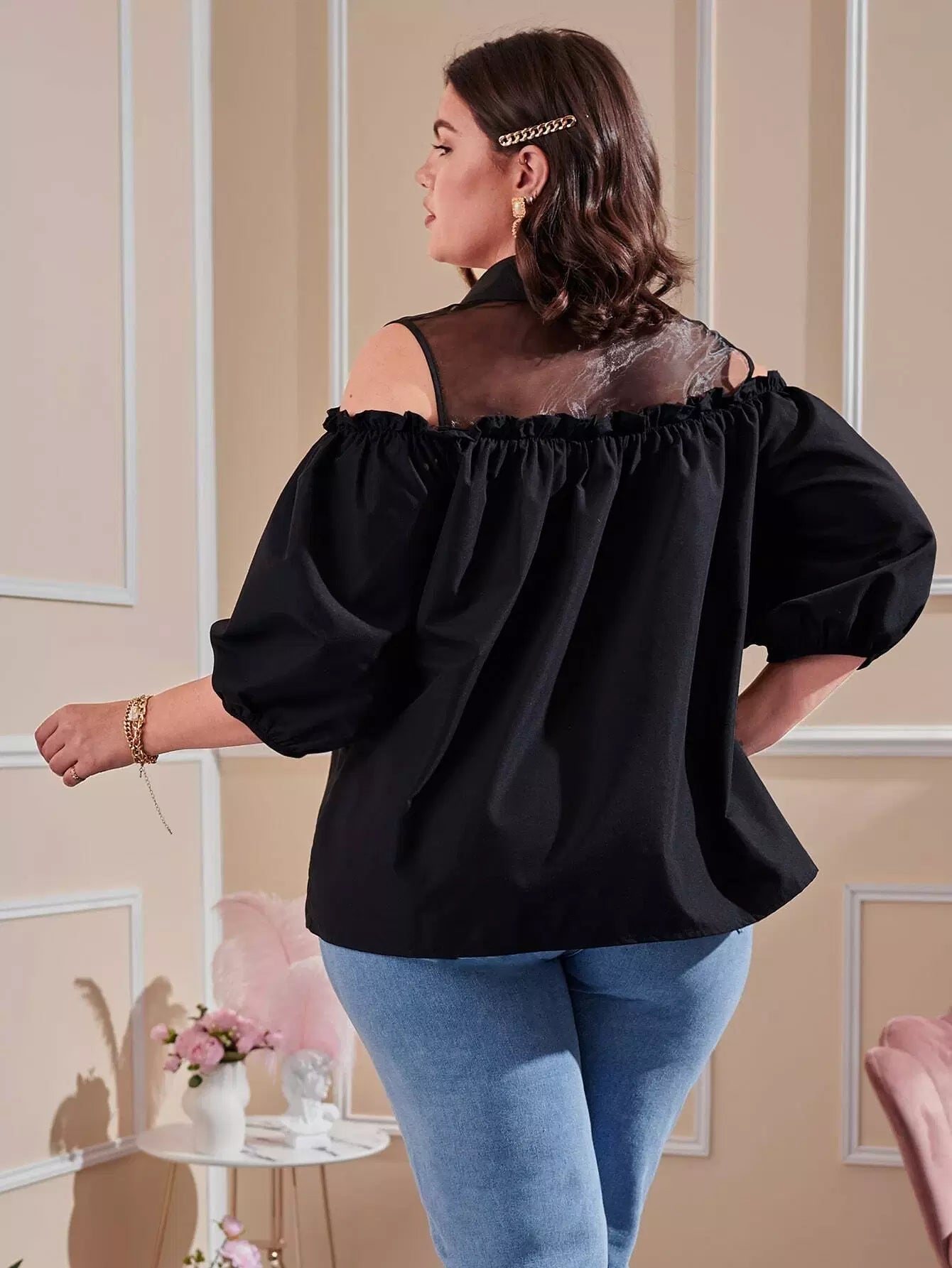 بلوزة ذات أكتاف باردة بياقة من الأورجانزا بياقة زائدة
