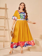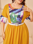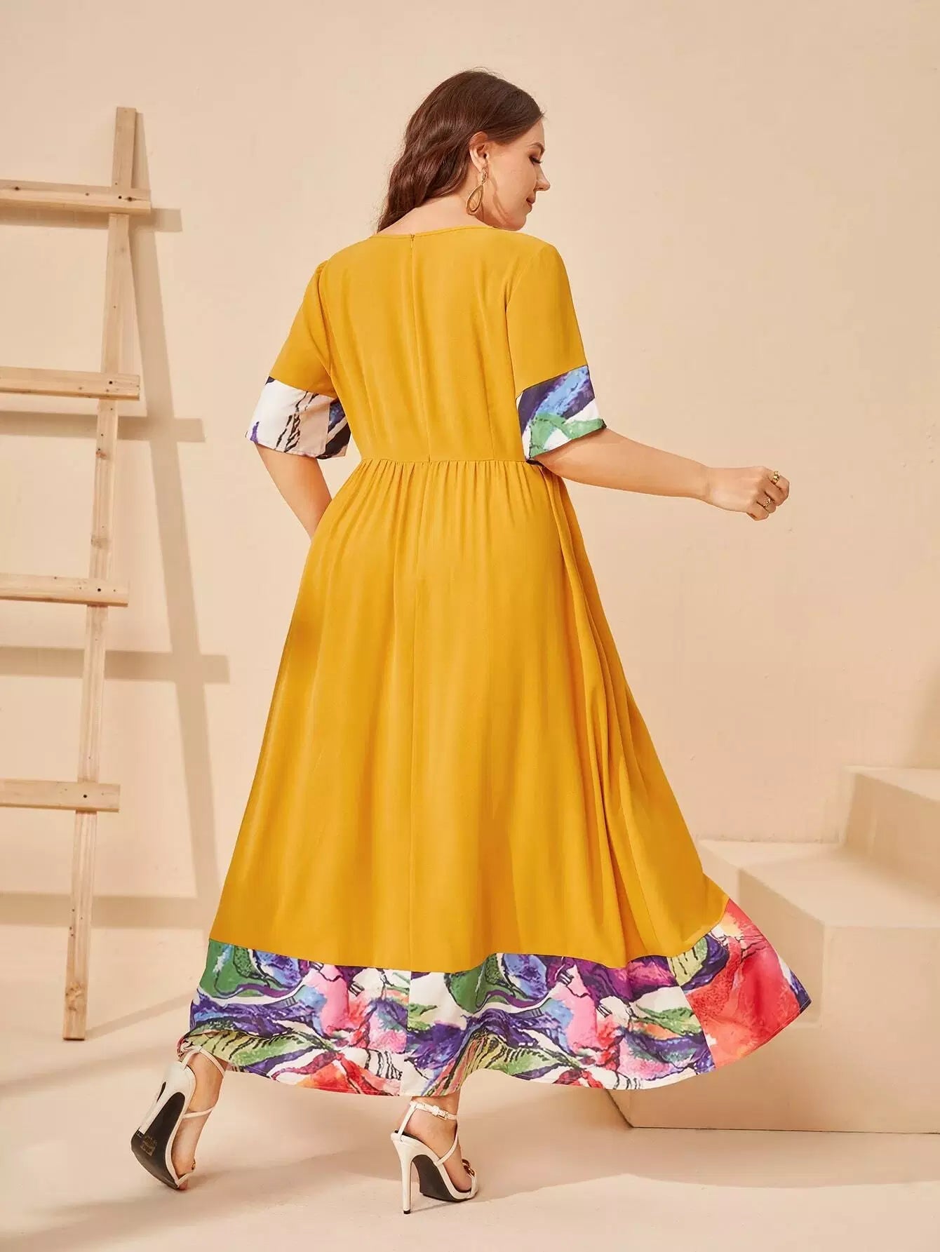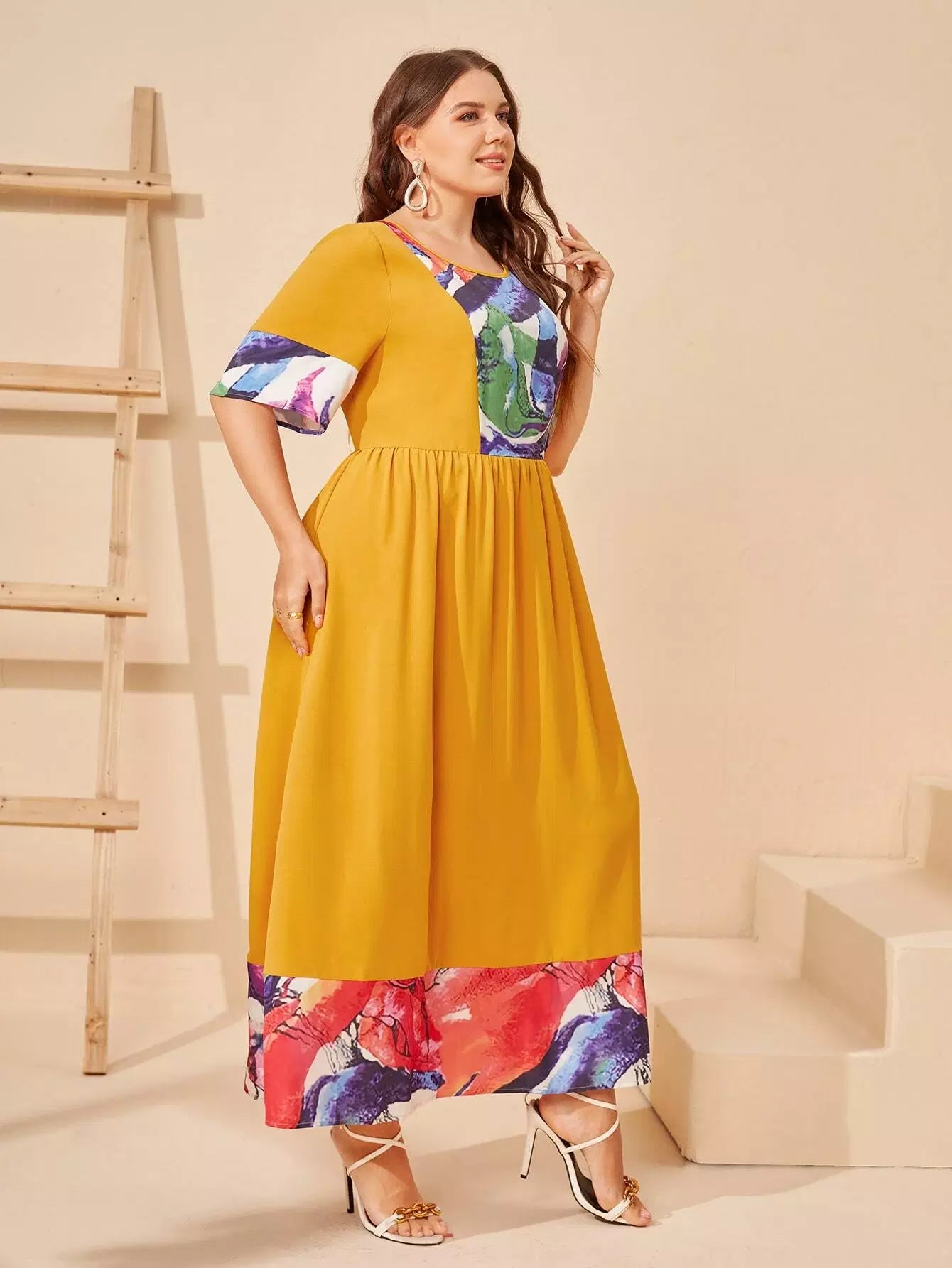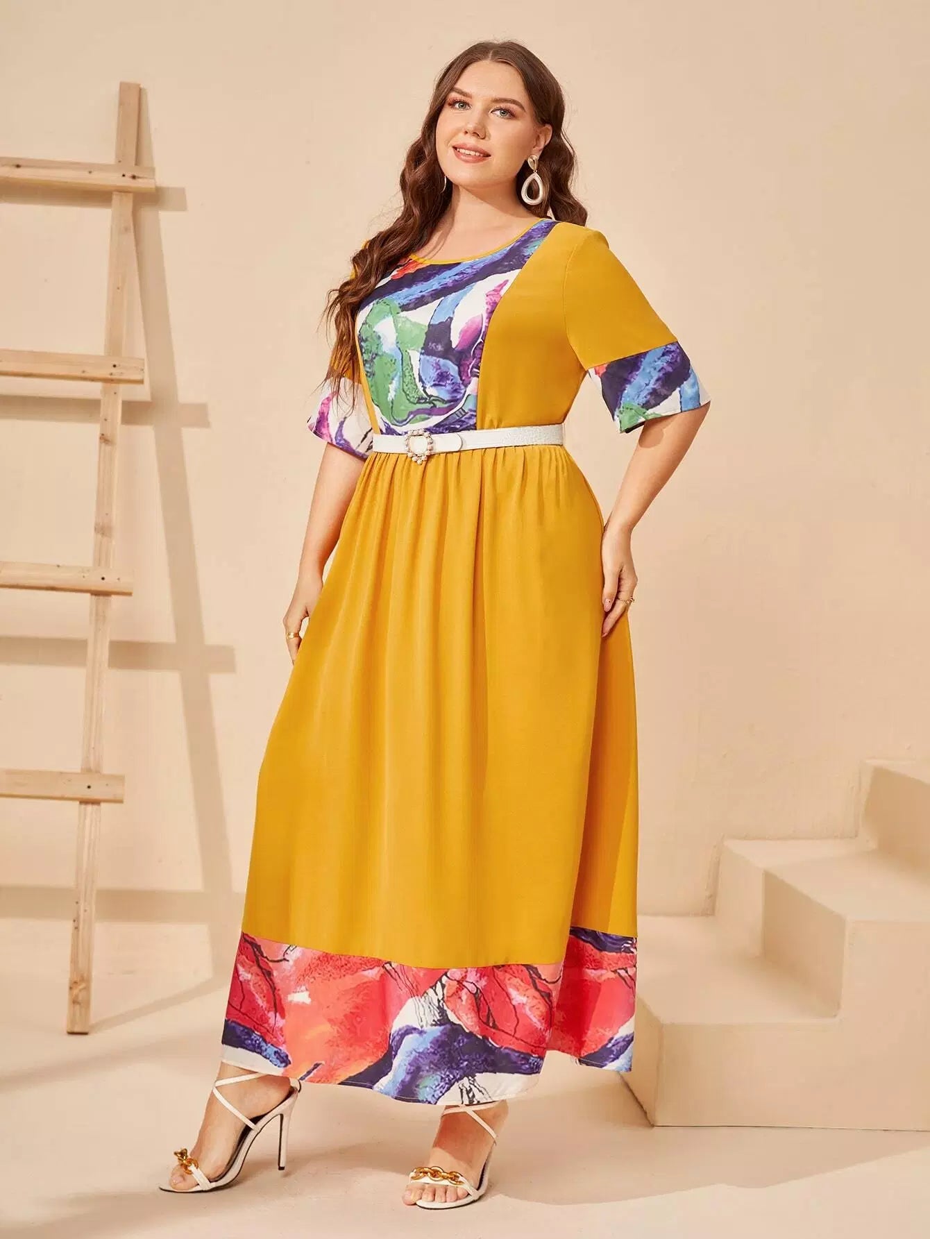 بالإضافة إلى فستان واسع ذو كتلة ألوان عالية الخصر بدون حزام