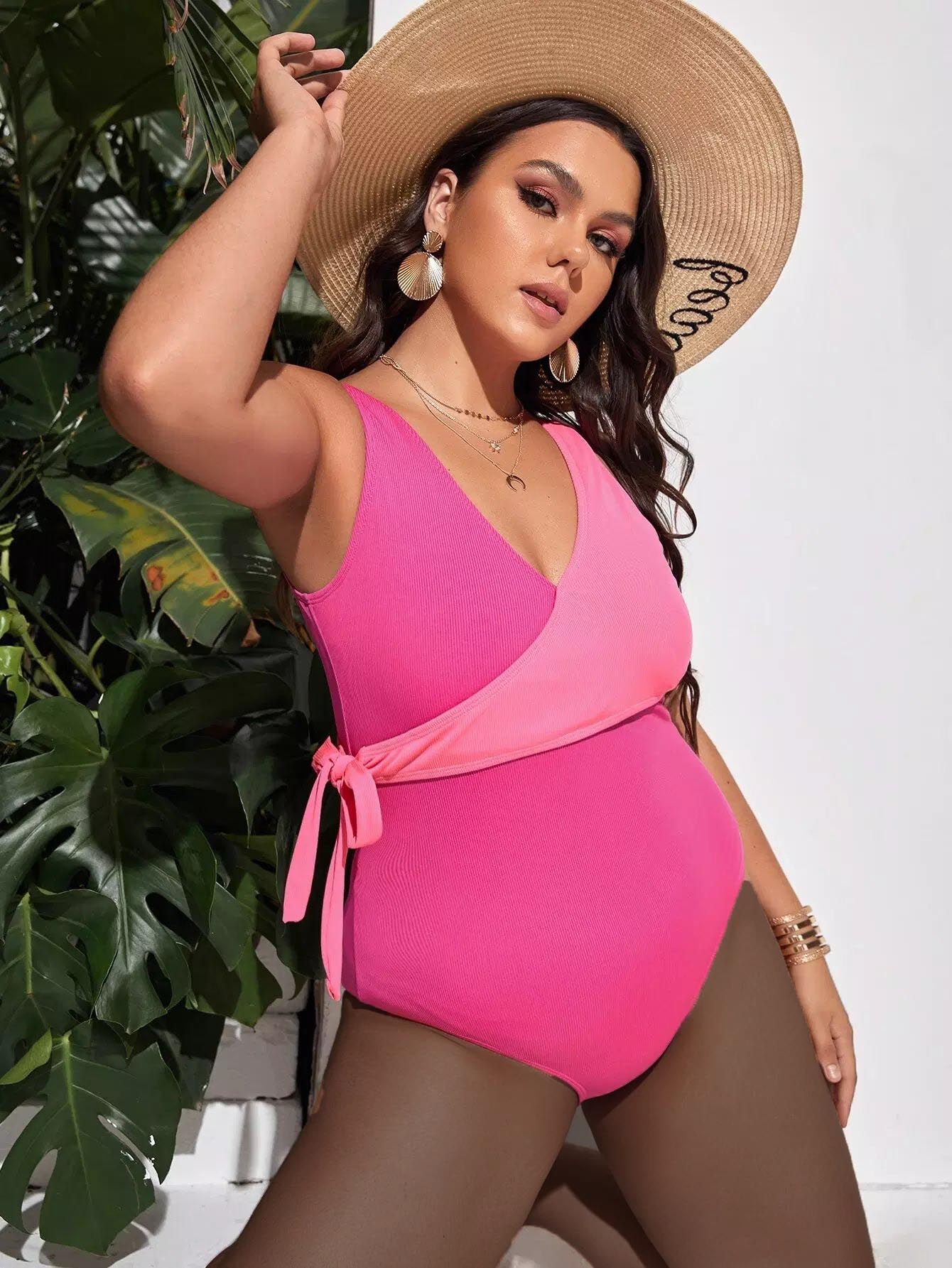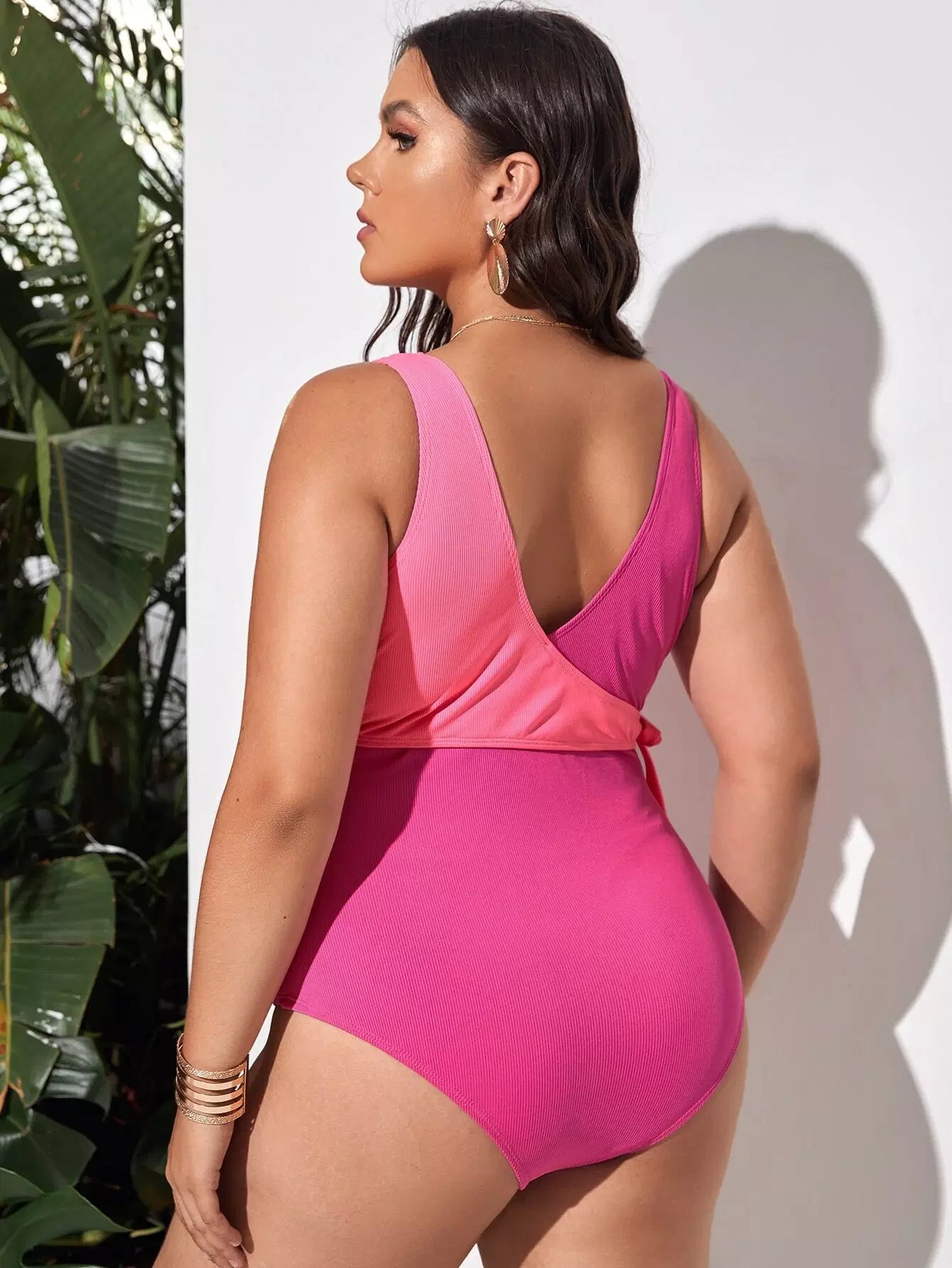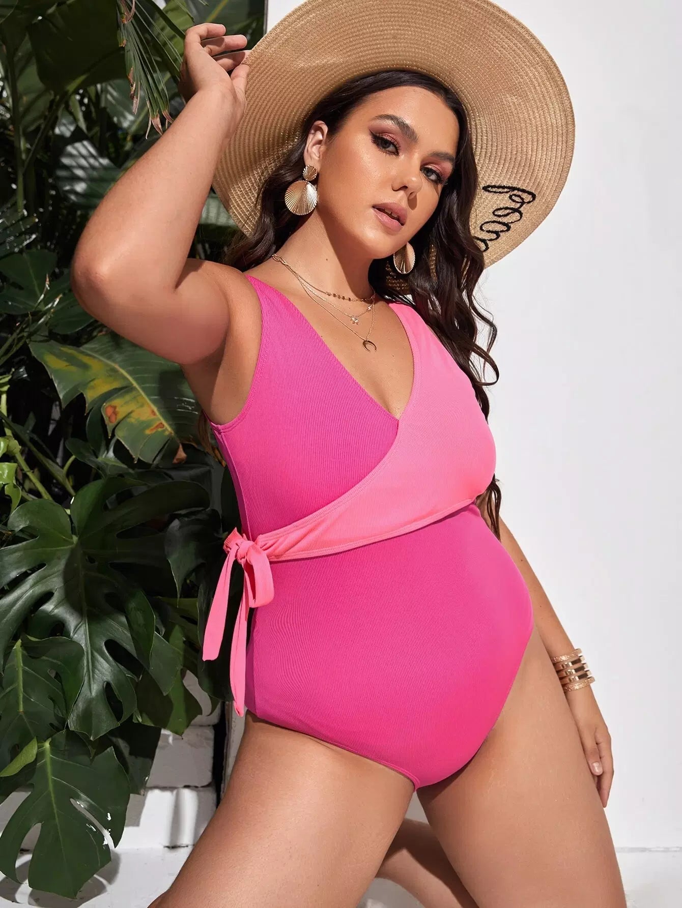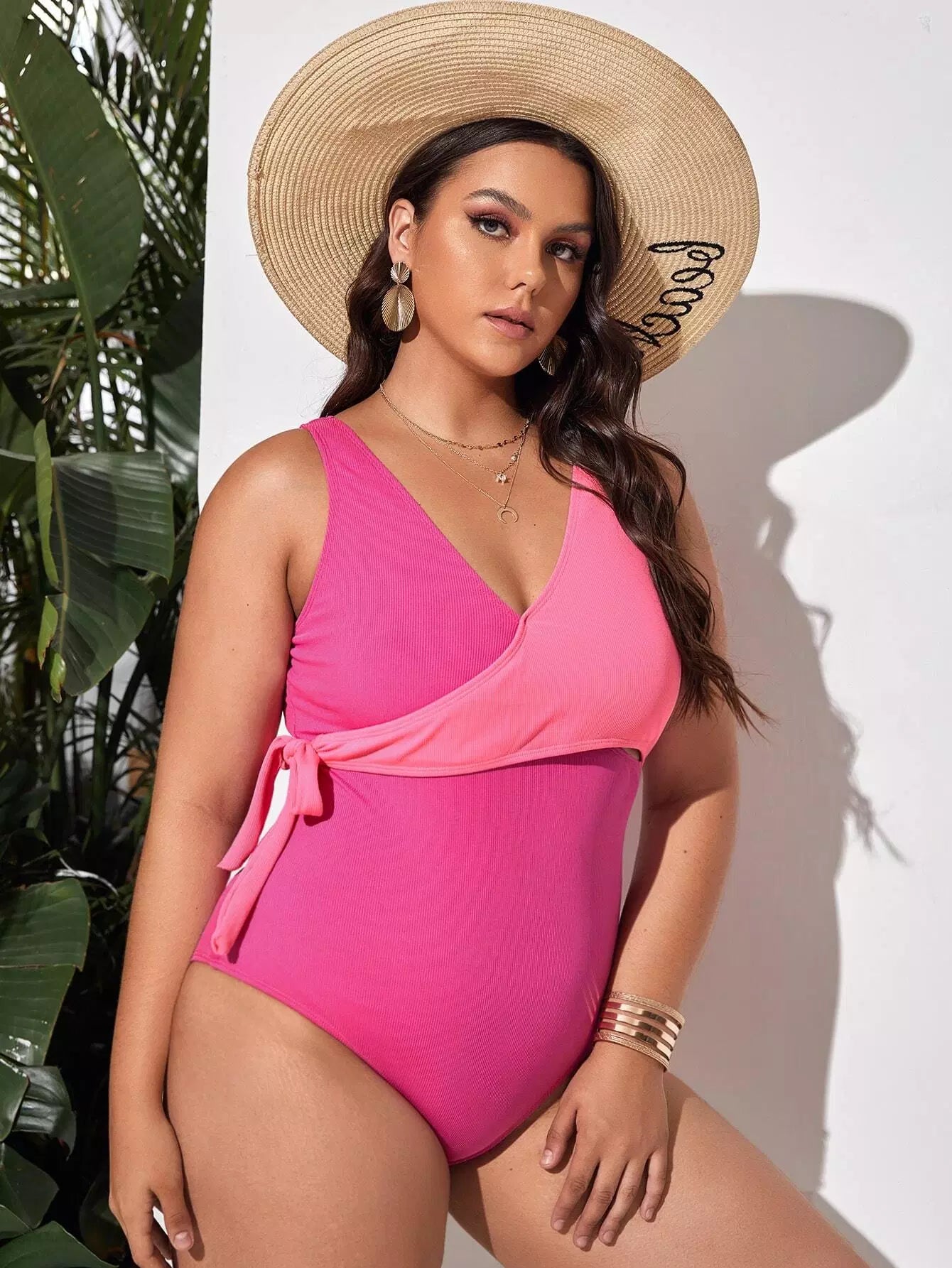 نحيف - مقاس كبير بدلة سباحة من قطعة واحدة بعقدة مضلعة ملونة
