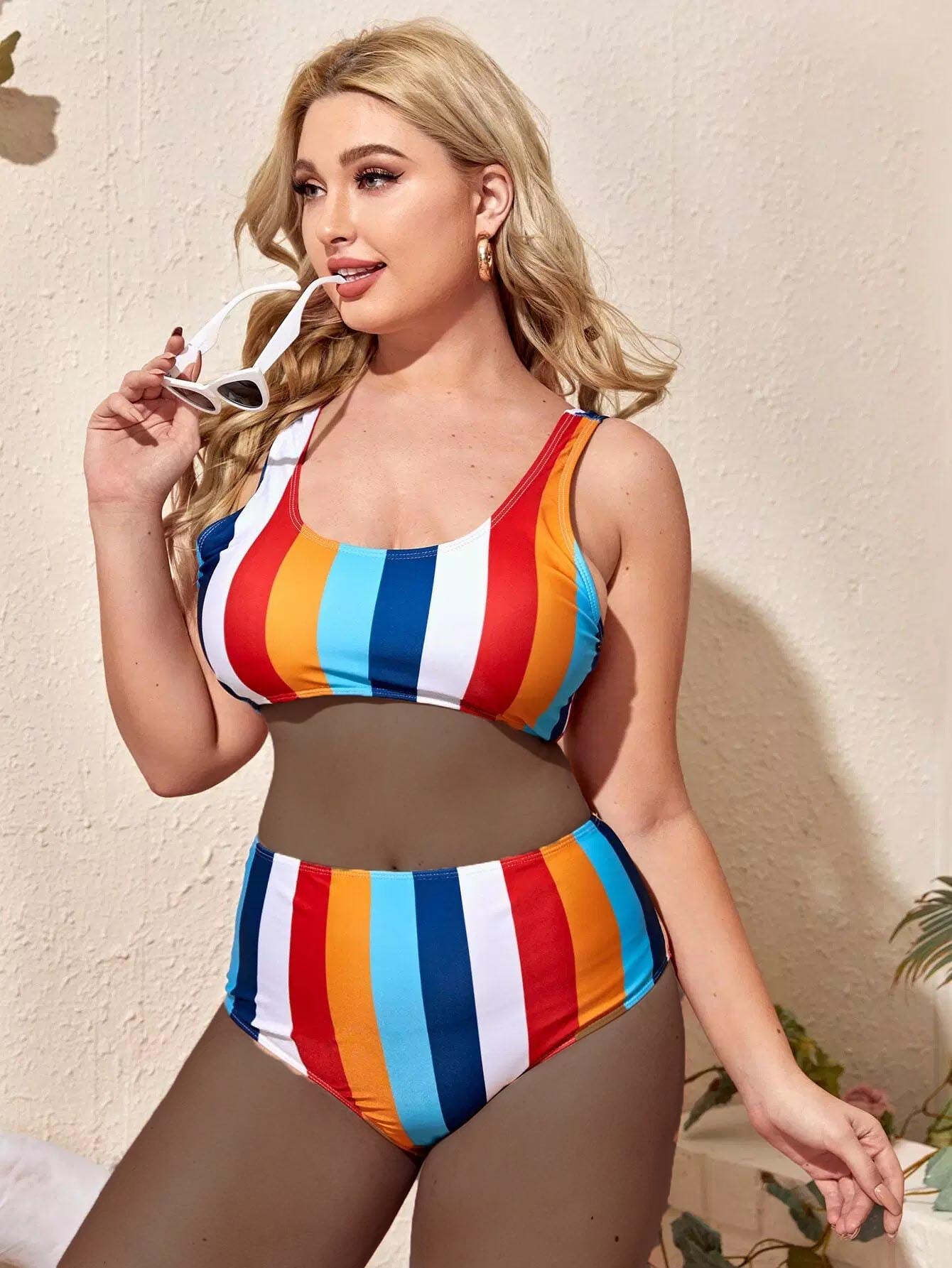 بدلة سباحة بيكيني عالية الخصر مخططة بالألوان الزائدة