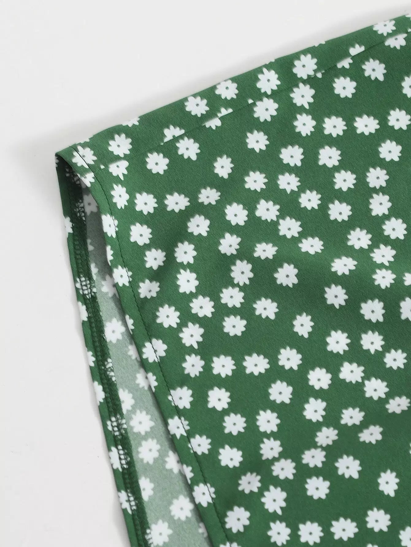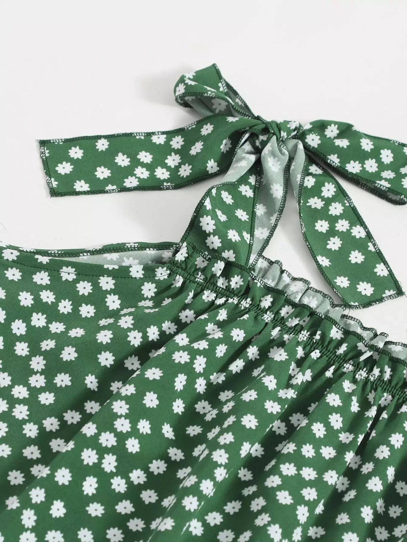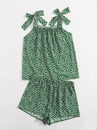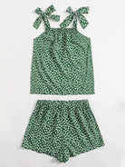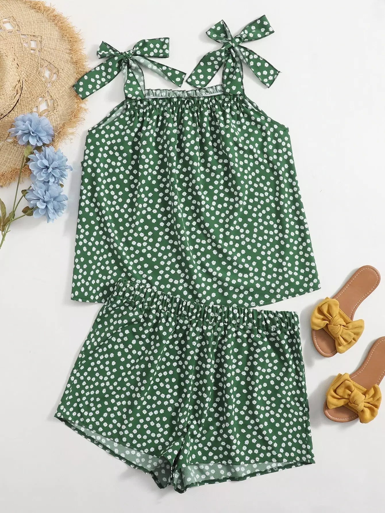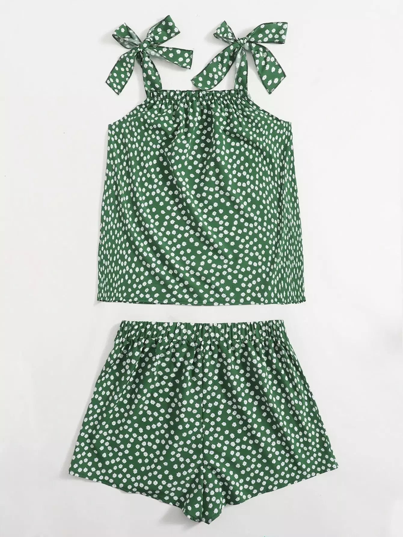 بلوزة وشورت قصير مزين بعقدة زهرية على الكتف مع شورت قصير