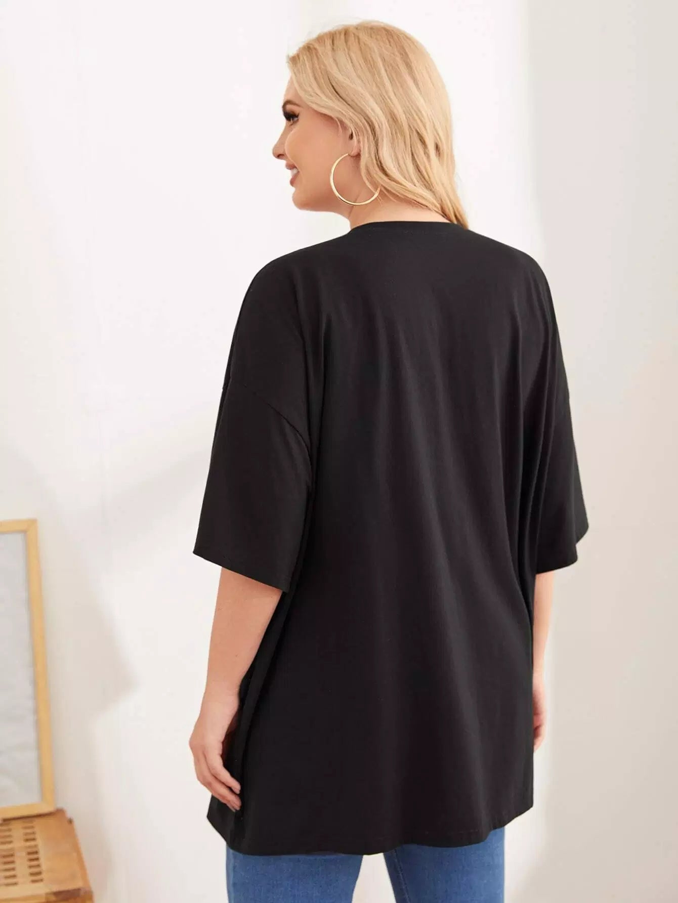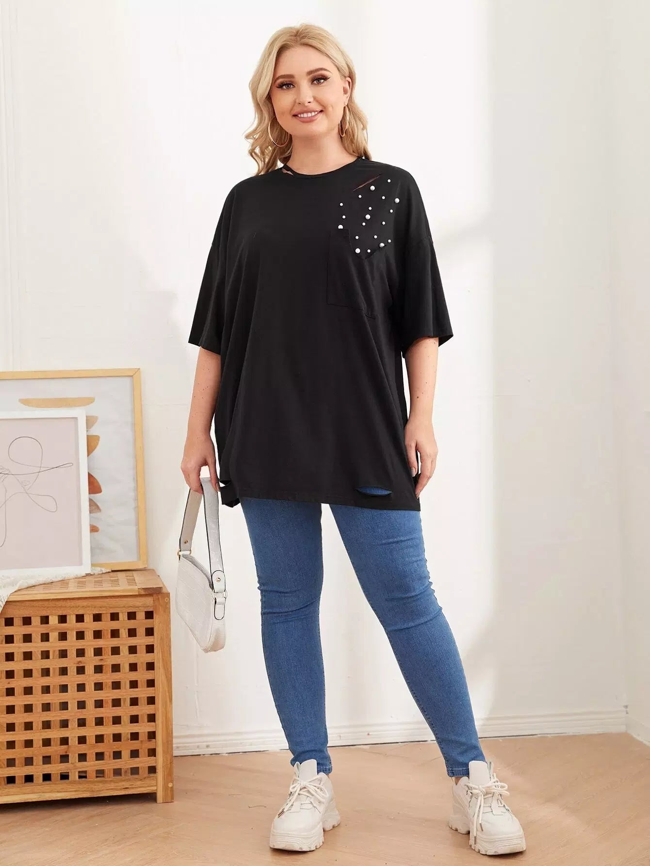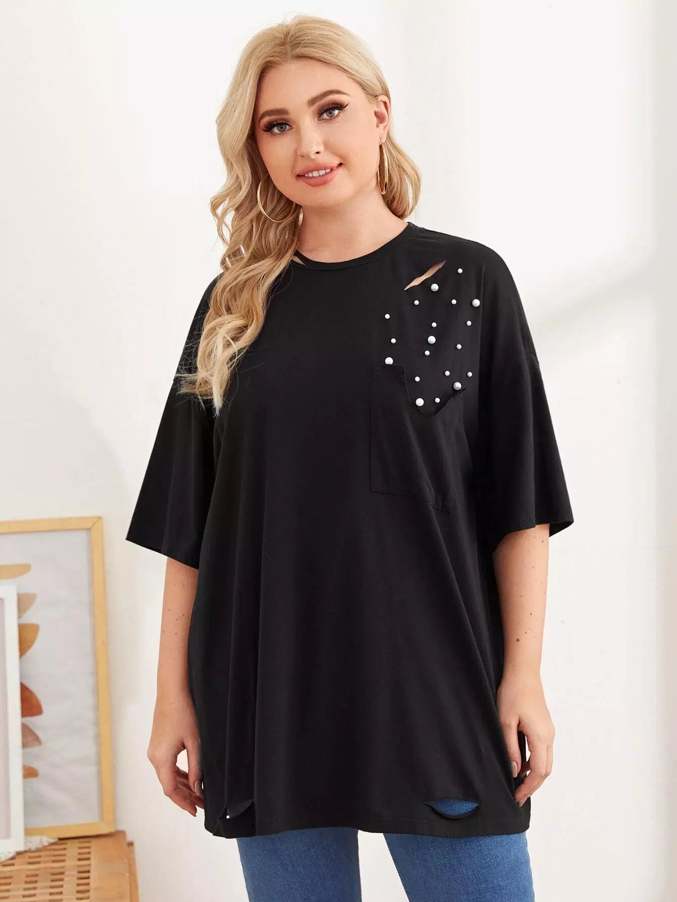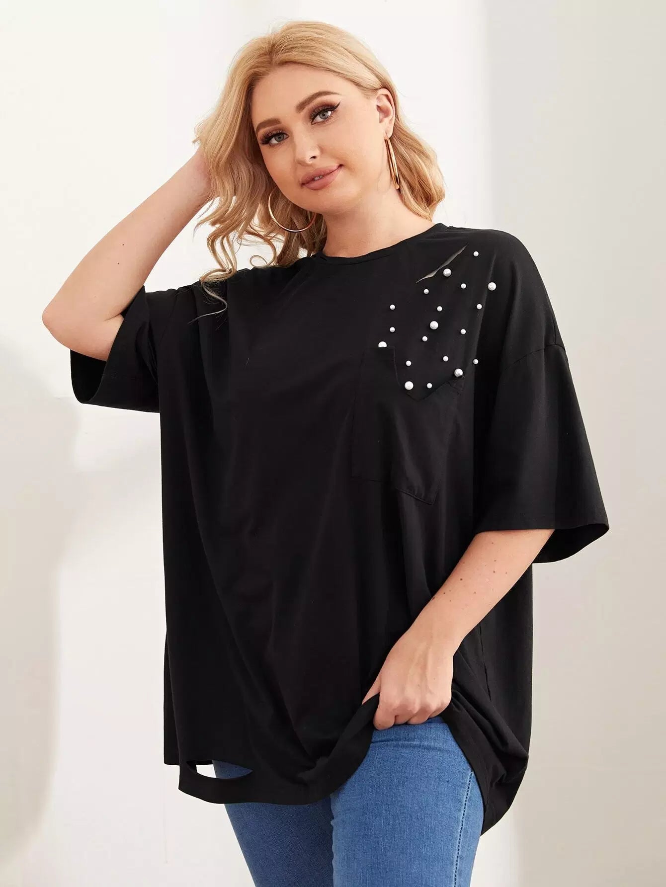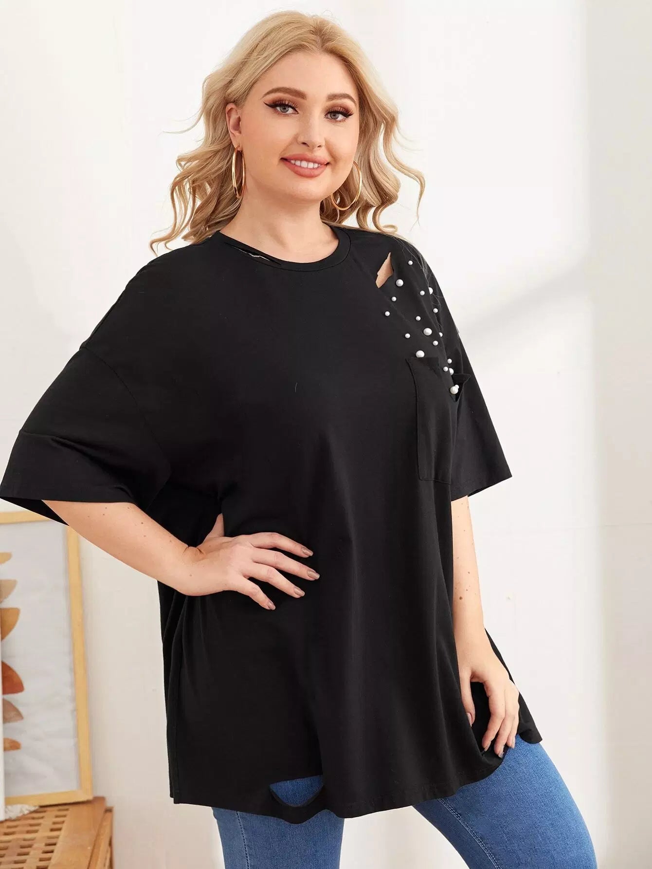 تي شيرت بقصّة منسدلة الأكتاف منسدلة الأكتاف مزينة بالخرز واللؤلؤ