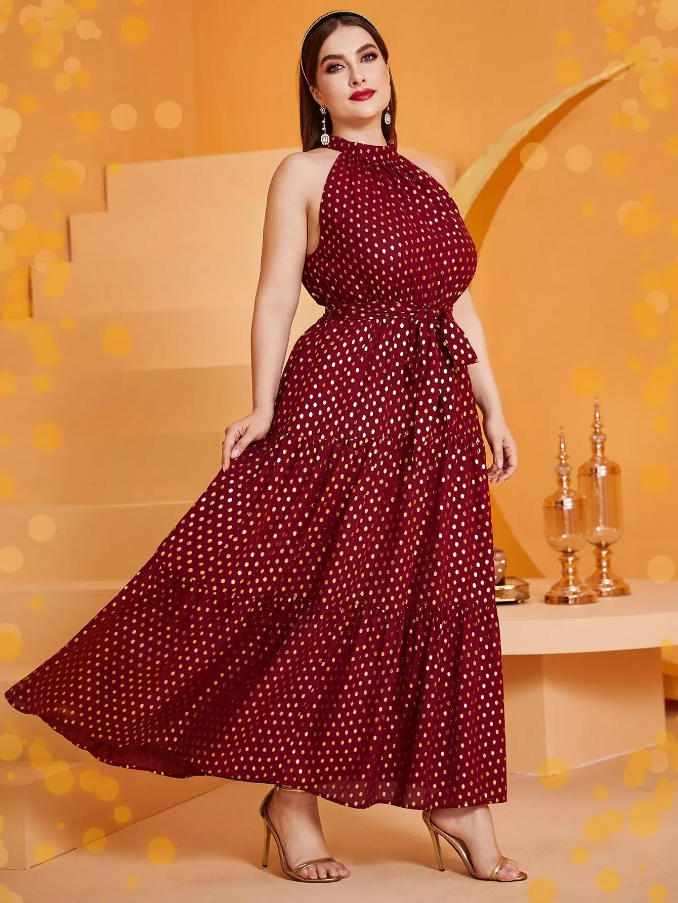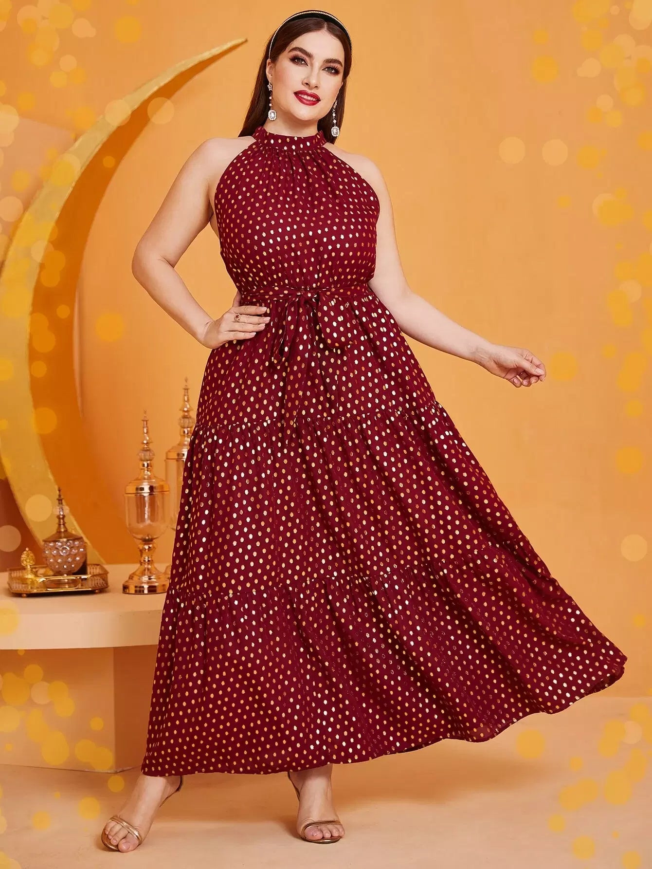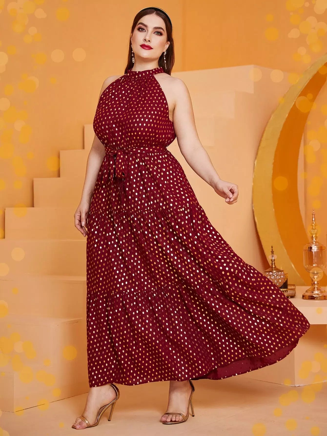 بالإضافة إلى فستان ذو حافة كشكش بطبعة نقاط ذهبية بدون حزام
