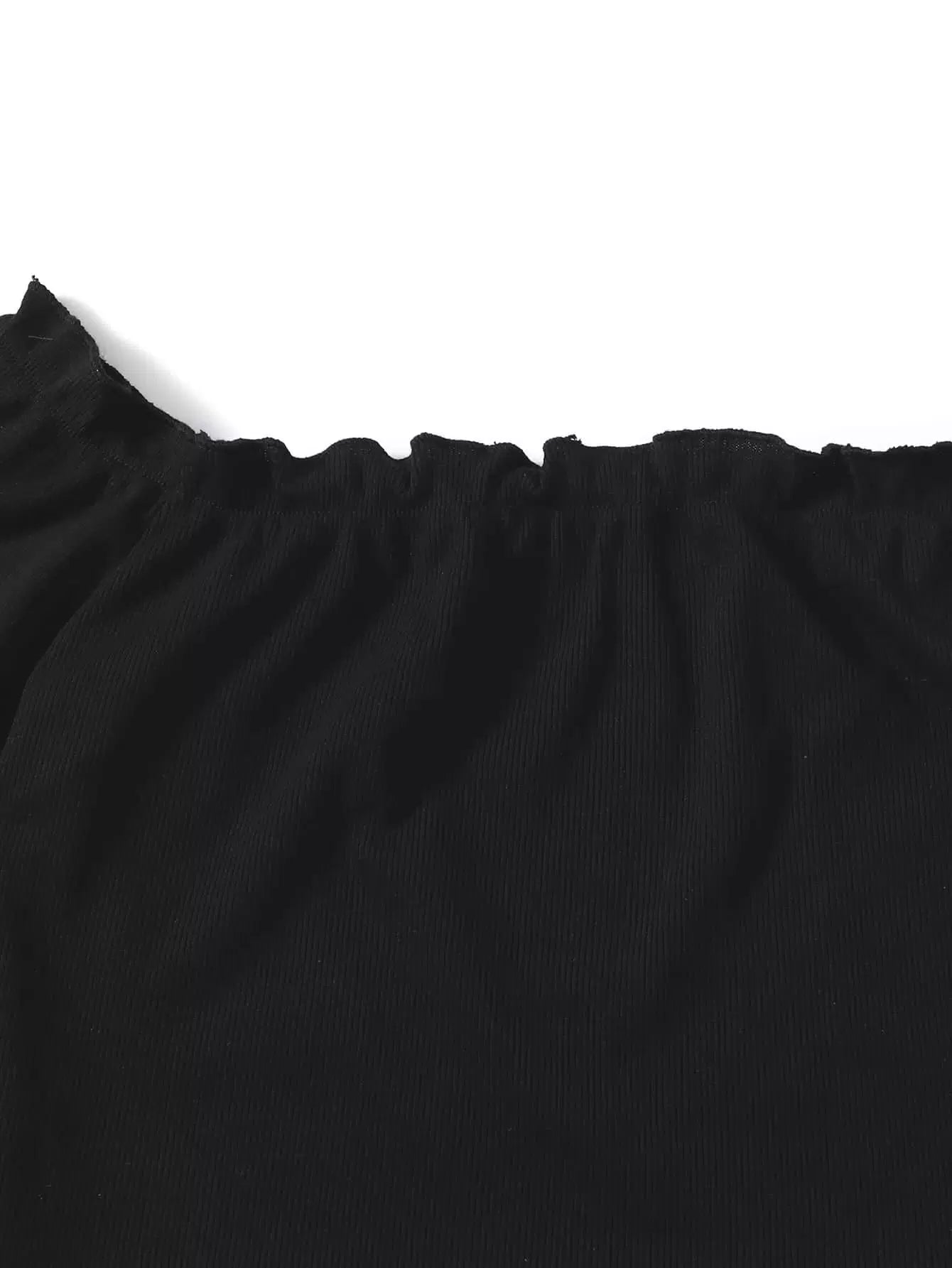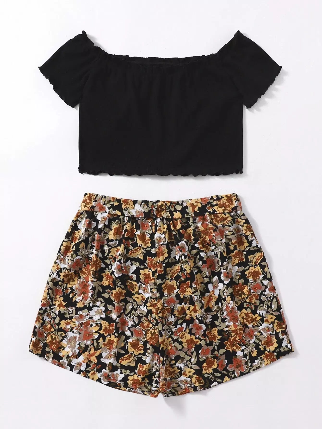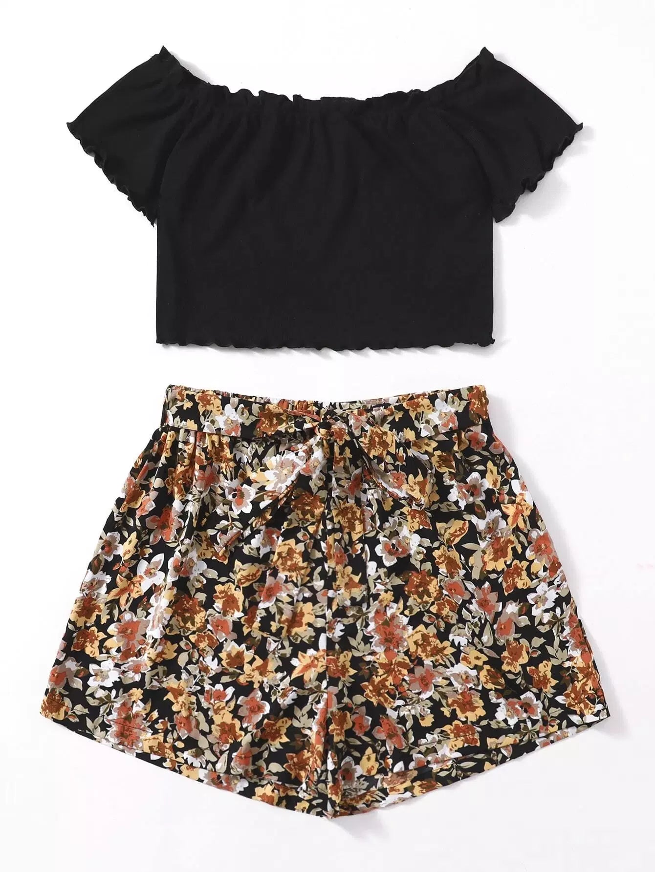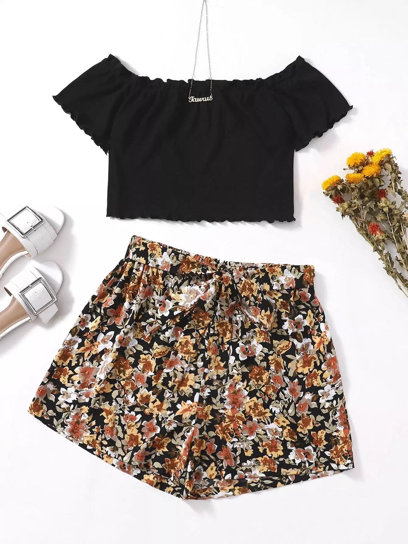 بالإضافة إلى طقم قميص باردوت مزين بزخرفة الخس وسروال قصير مزين بالزهور بدون حزام