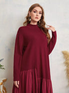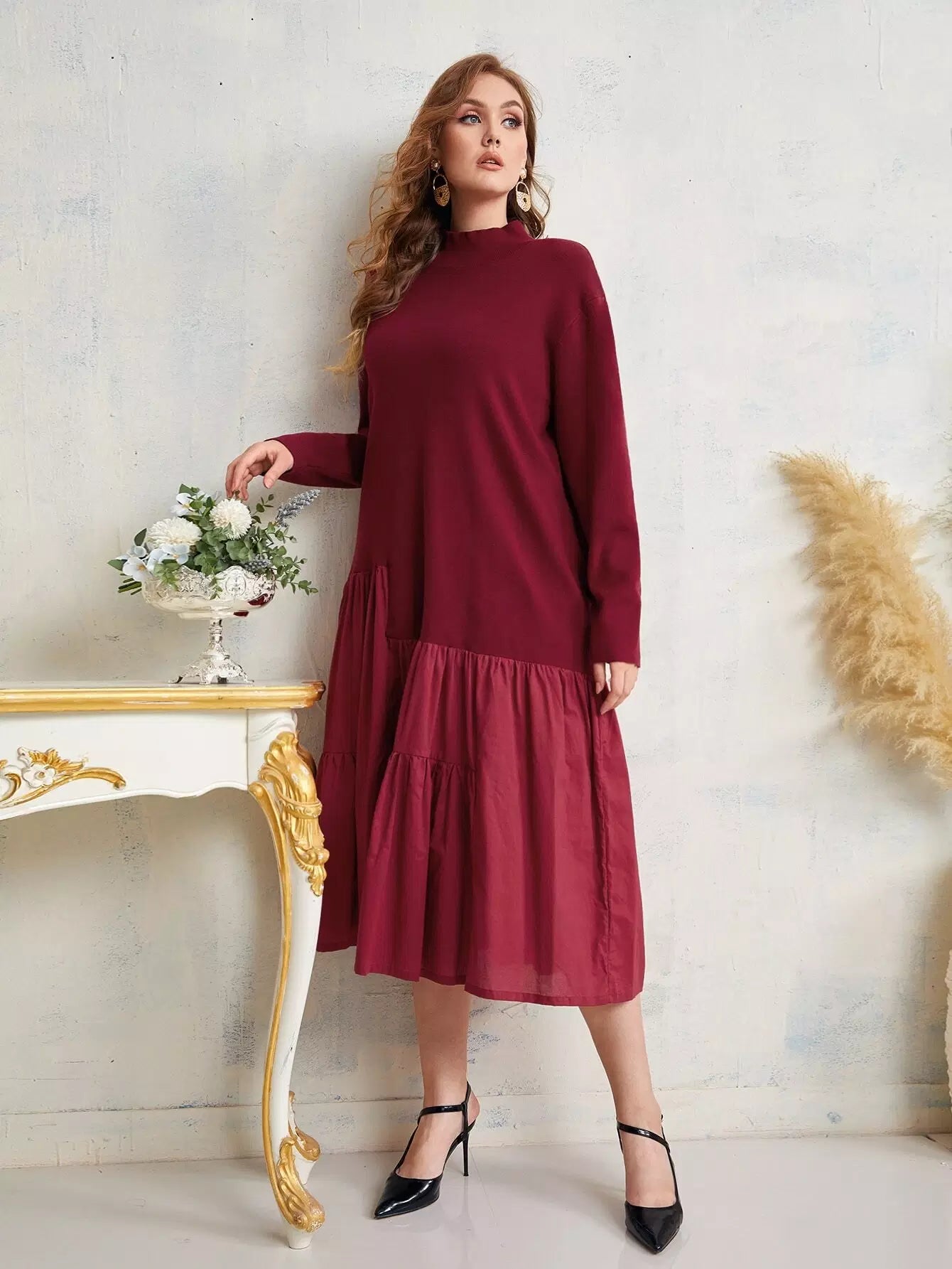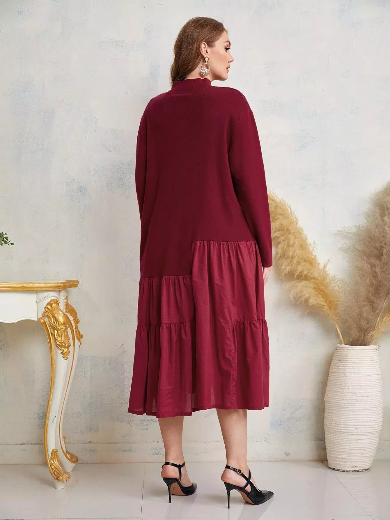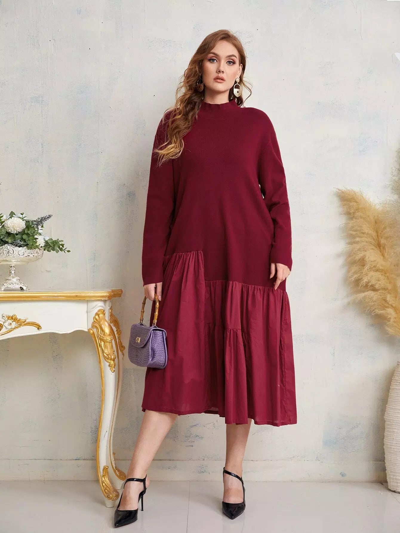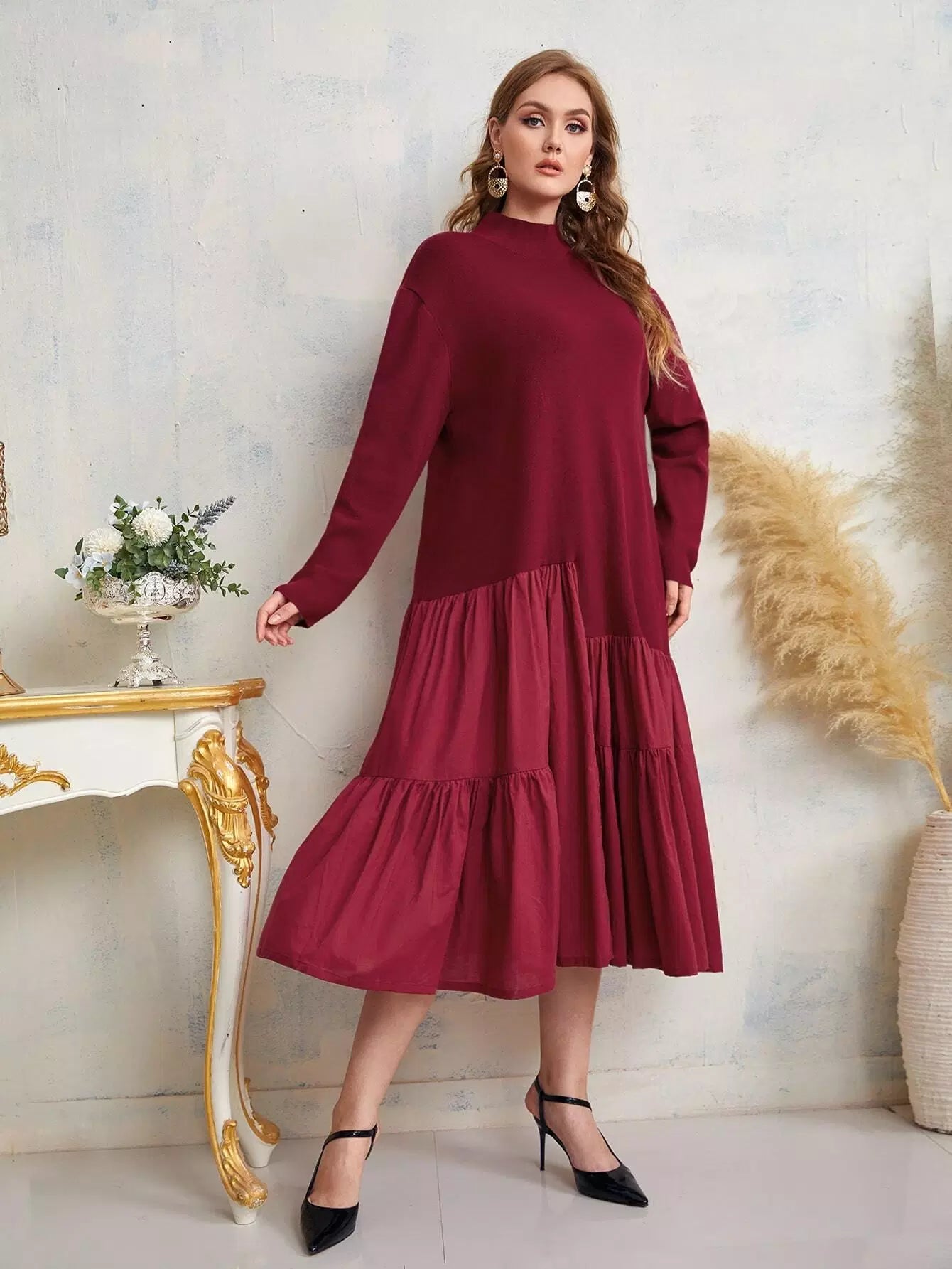 فستان برقبة زائد بياقة منسدلة على الكتف منسدلة الكتف ملون بحافة كشكش