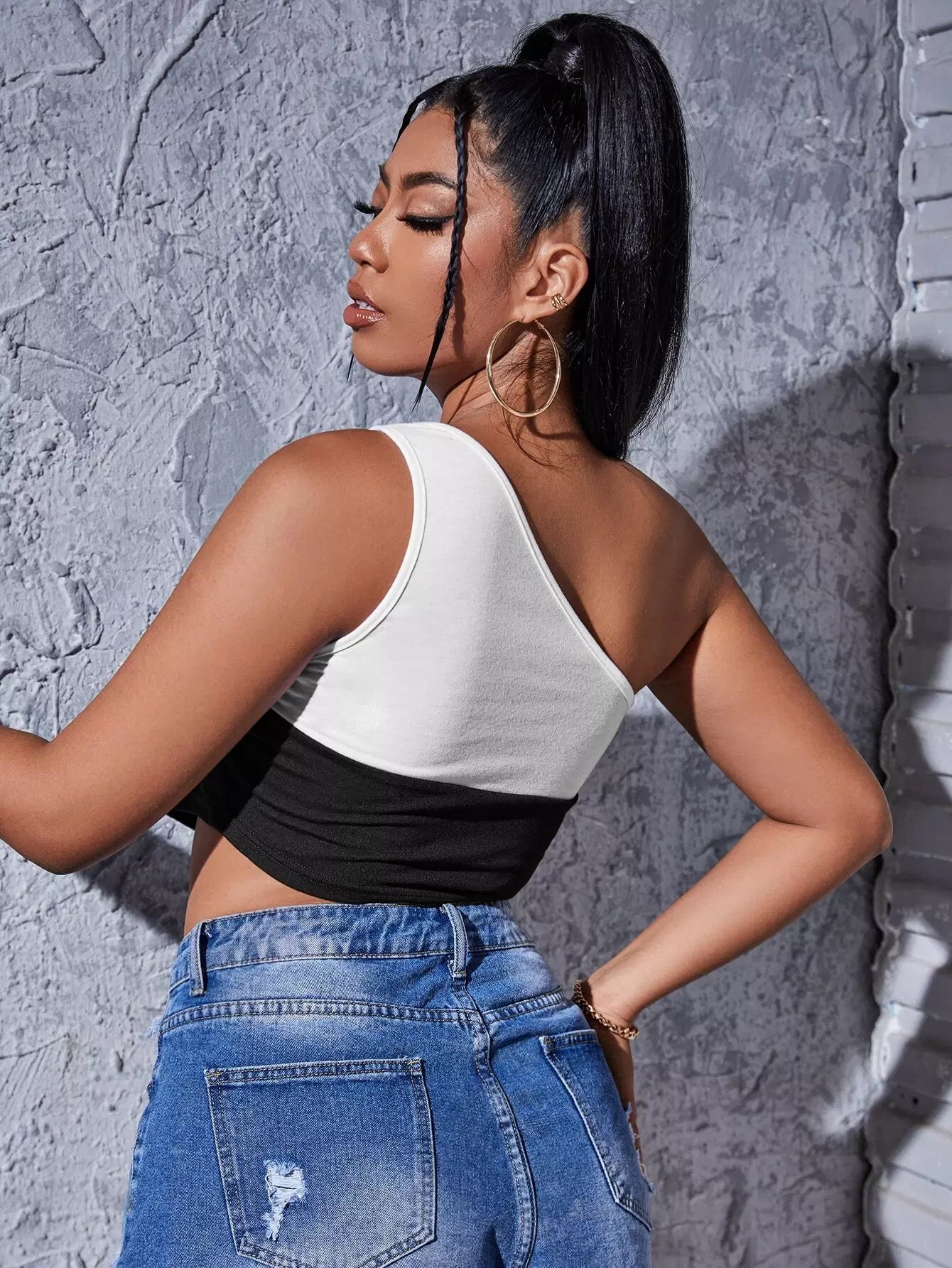 بلوزة بكتف واحد بلونين مقطوعة من دون أكتاف