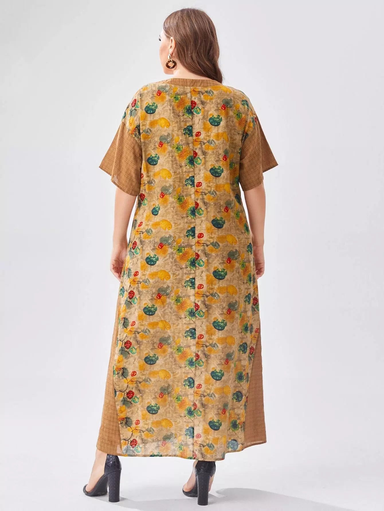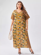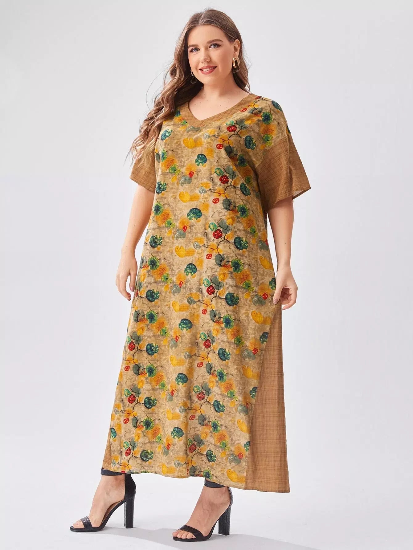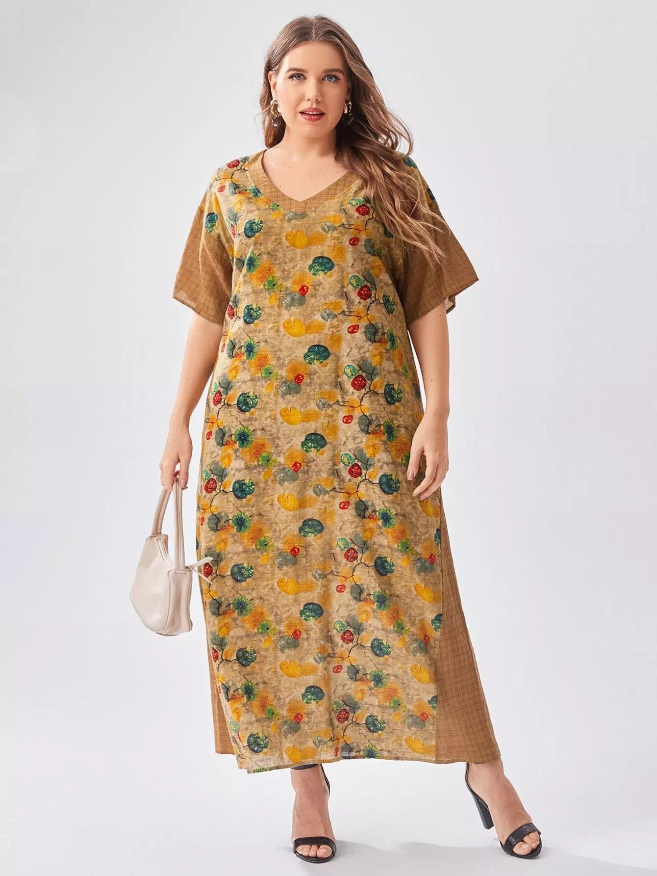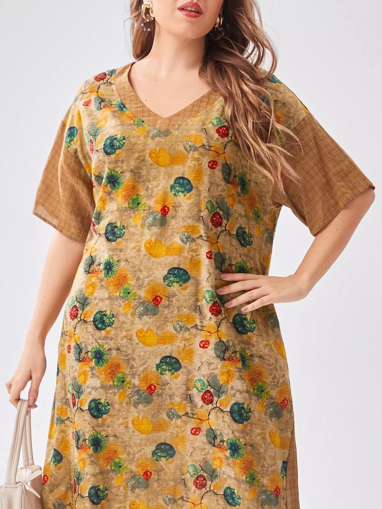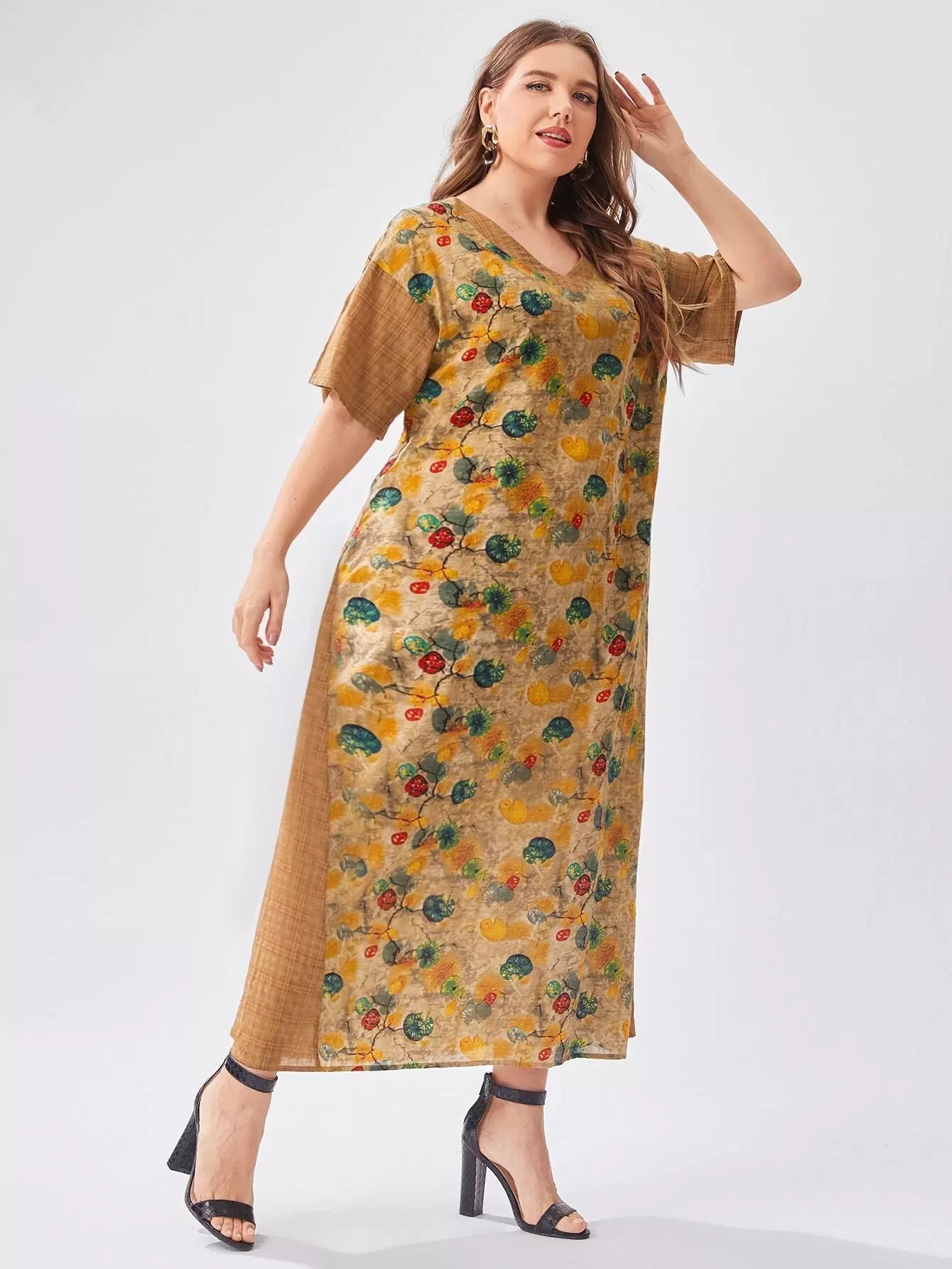 فستان بدون أكمام مطبوع بطبعة نباتات على شكل V برقبة على شكل V