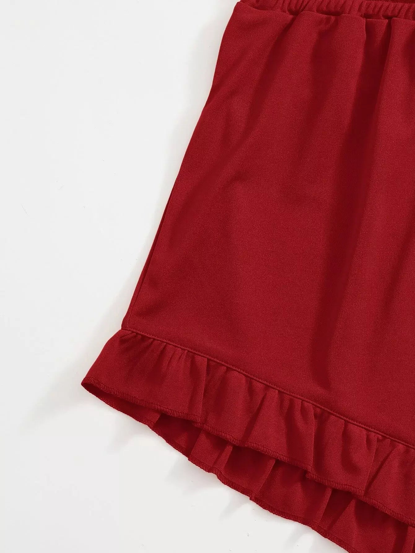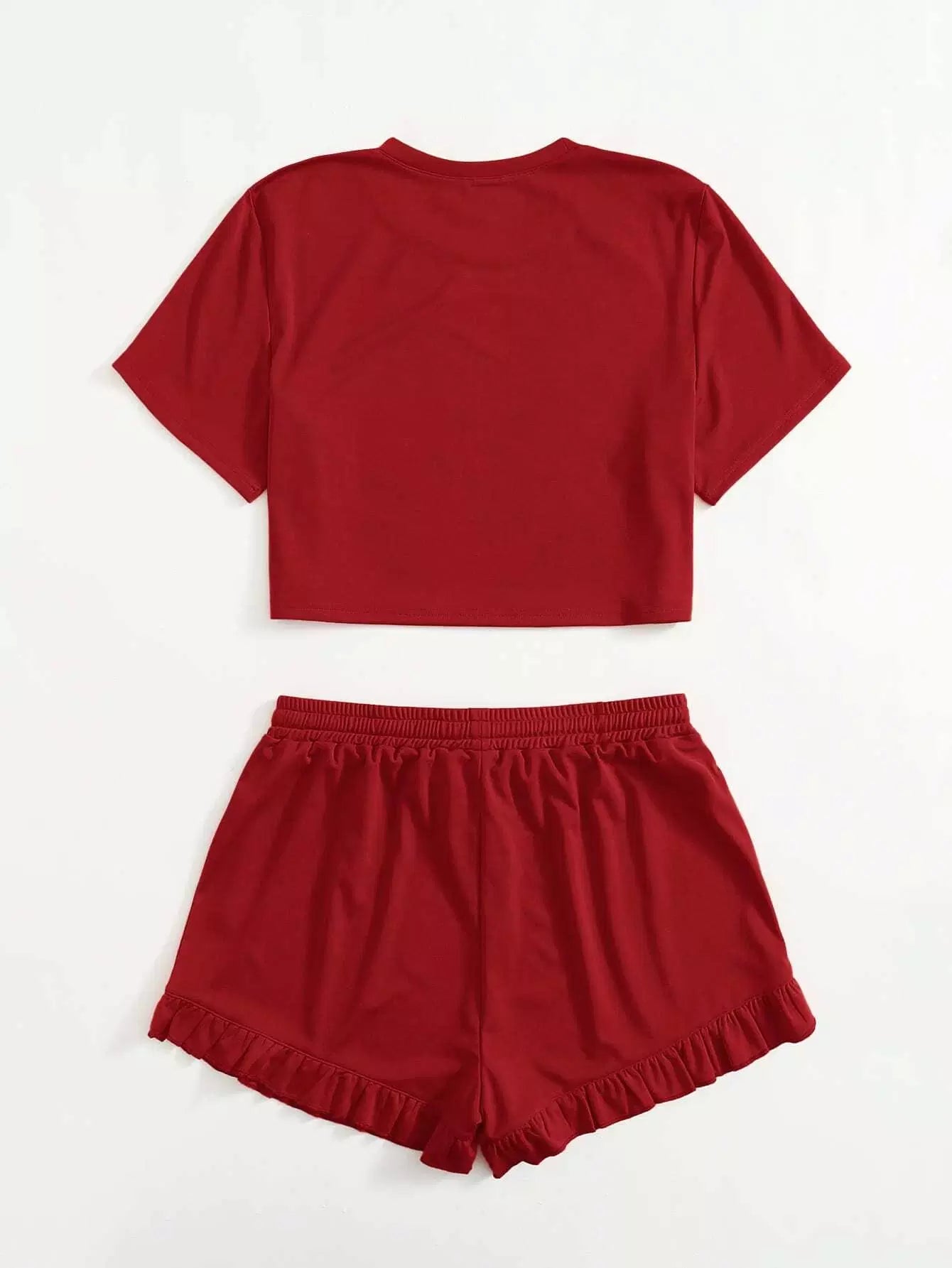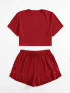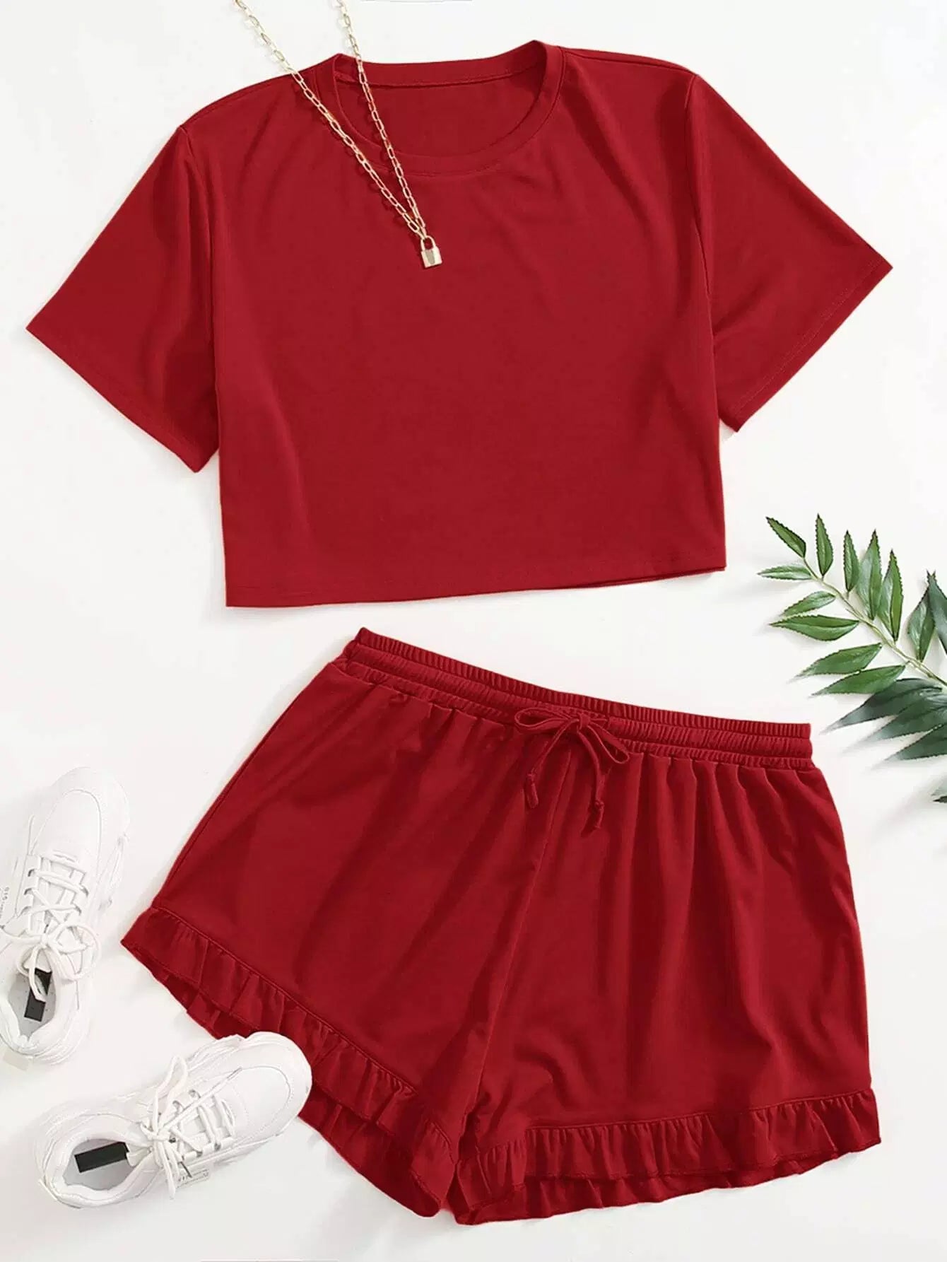 تي شيرت قصير قصير سادة مع شورت بحواف مكشكشة