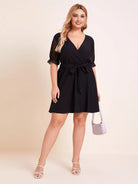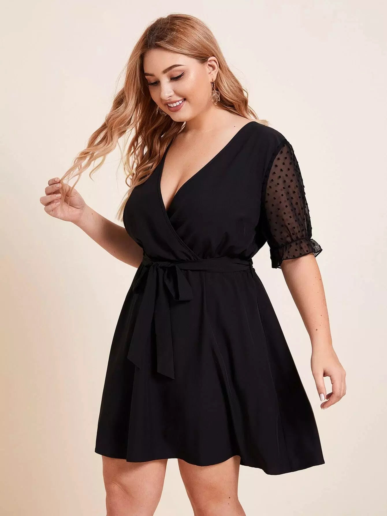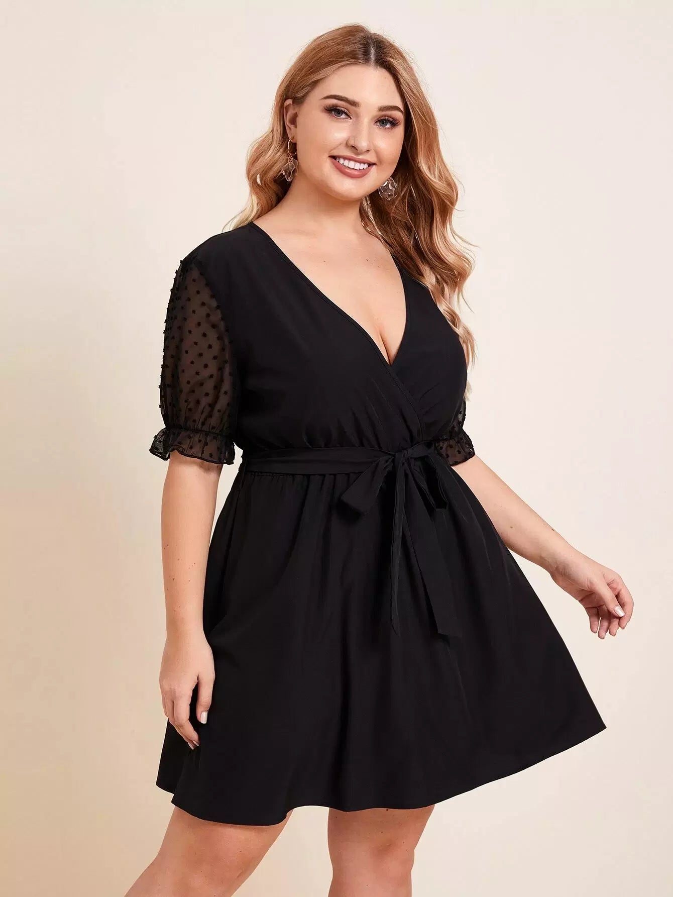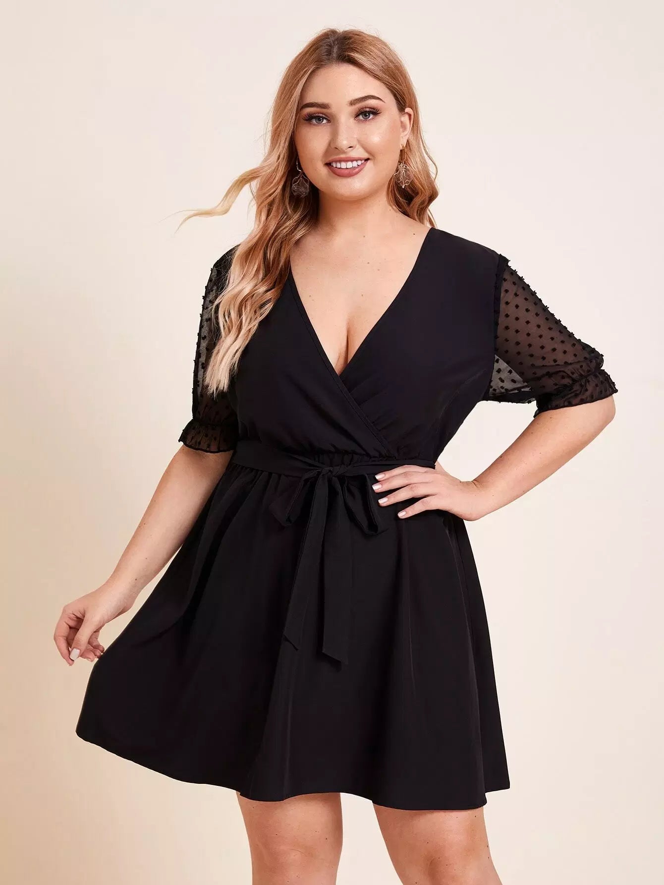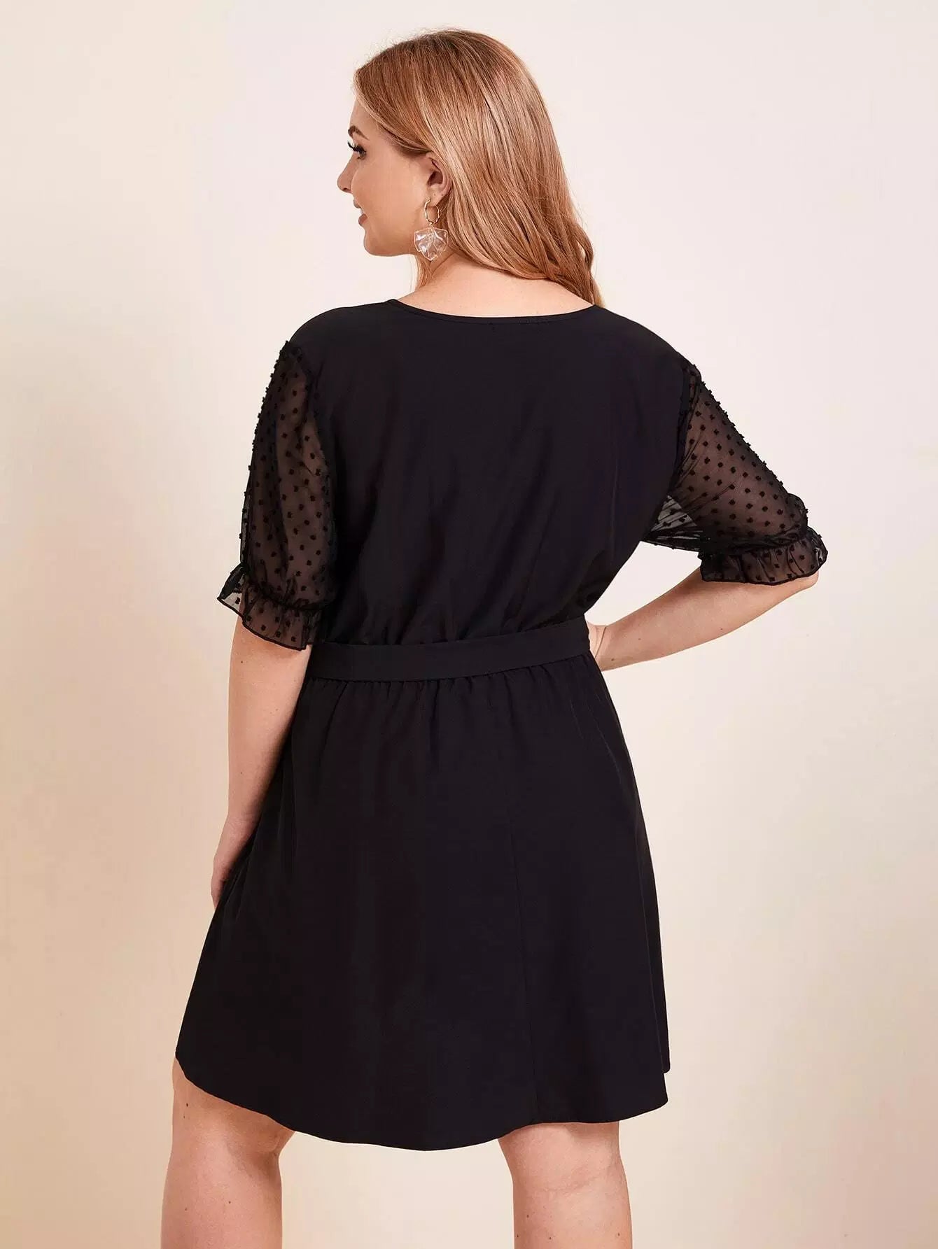 فستان ذاتي بأكمام شفافة ورقبة منقطة سويسرية بدون حزام